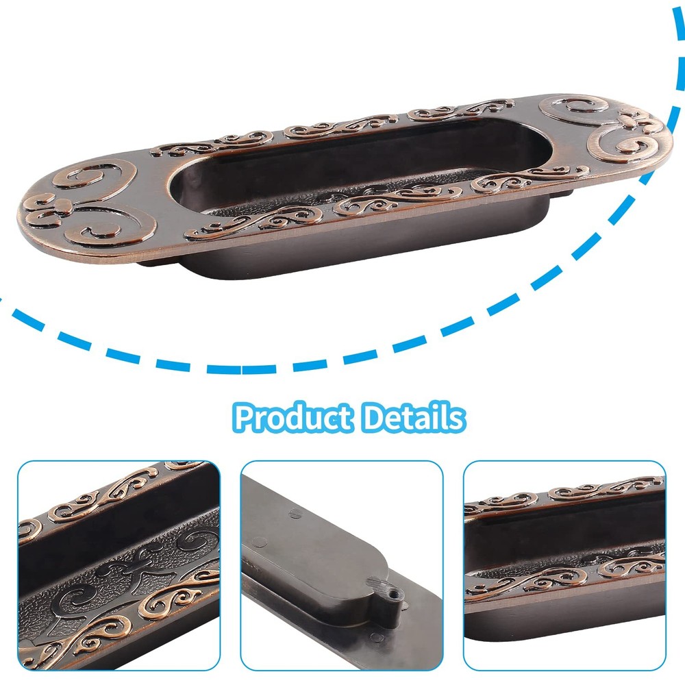 About Us focus on retail and wholesale hardware items and other accessories, all of the products we sell are strictly selected, we provide high quality, the most popular, affordable price products to worldwide. Feature 1. Suitable for cabinets, furniture, and kitchen applications. 2. Includes a flush pull handle and screws - no complicated installation. 3. Made from High quality Stainless Steel in Antique copper, these handles have a very high quality finish, oval modern vintage style Recessed Flush Pull. Always shiny never rusty. 4. Because pull handles are mounted on the exterior they require clearance, the Flush Handle is inset into the door, thus eliminating the protrusion and allowing the door to open without resistance. 5. The finger door pulls handle is designed to suit with most of internal and external doors: sliding barn doors, pocket doors, bifold doors, sliding doors, doors fitted with roller catches applications. Specification Material: Stainless Steel & Copper Color: Antique Copper Overall: 5.78*1.69 inch / 147*43 mm (L*W) Groove Depth: 0.51 inch / 13 mm Mounting Hole Distance: 3.78 inch / 96 mm Package Included 2 x Recessed Pull Handle 4 x Screws Warmly Note 1. The colors may have difference as the different display, please understand. 2. Please allow 1-2mm error due to manual measurement, please make sure you do not mind before you bid. [ Advanced Design ] Manufactured from High quality Stainless Steel in Antique Copper, these handles have a very high quality finish, oval modern vintage style Recessed Flush Pull. Always shiny never rusty. The surface and all edges are finely chamfered with polished by hours, touches soft, smooth and quality feeling. [ High Quality Materials ] The recessed handle pull is made of high-quality Stainless Steel and Antique Copper, so the recessed drawer pulls are sturdy and durable. The surface is protected by a coating, it will not rust after a long time of use. [ Multi-purpose ] The flush sliding door pull is practical and can be applied to many places. It's suitable for sliding barn doors, pocket doors, sliding doors, doors fitted with roller catches applications. Also suits with cabinets, furniture, and kitchen applications. [ What You Get ] 2 Pcs vintage barn door pulls and 4 pcs screws. Overall: 5.78*1.69 inch / 147*43 mm (L*W); Groove Depth: 0.51 inch / 13 mm; Mounting Hole Distance: 3.78 inch / 96 mm. style: style cabinet handles can perfectly match various styles of home decoration, adding elegance and exquisite temperament to your home decoration