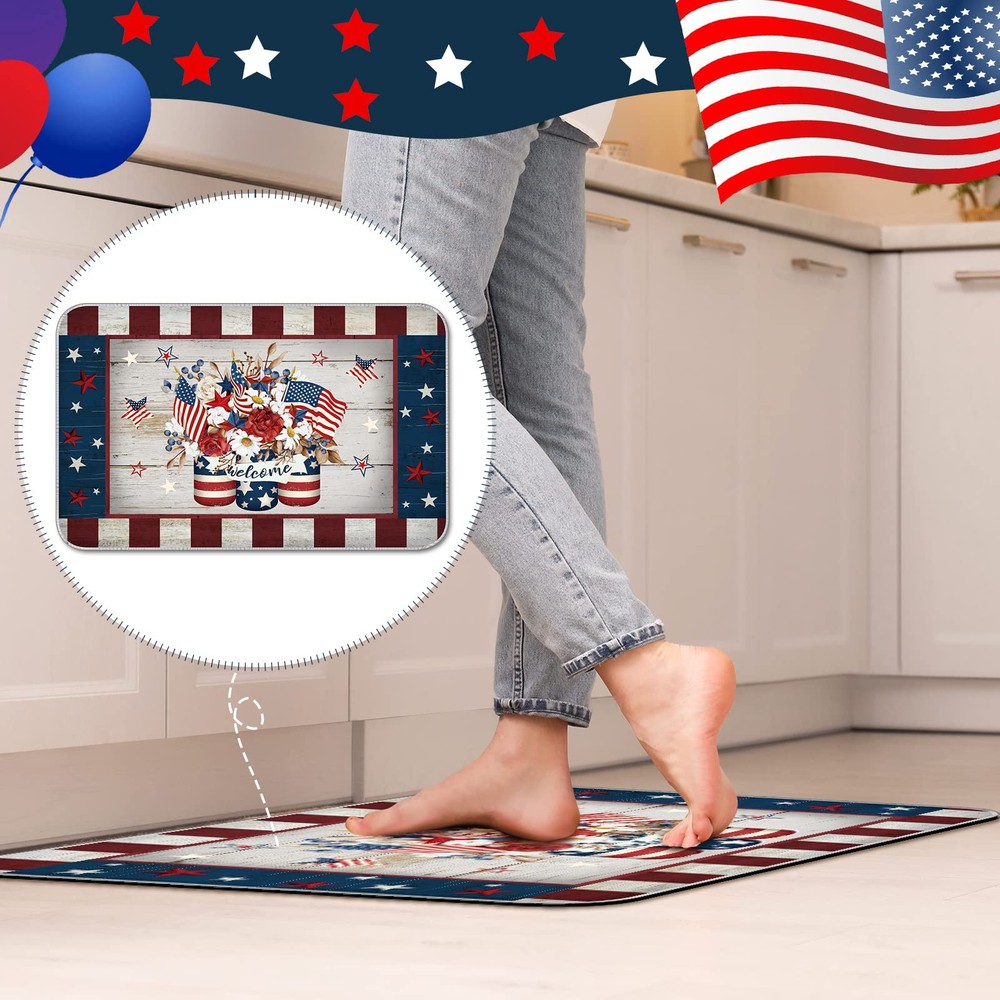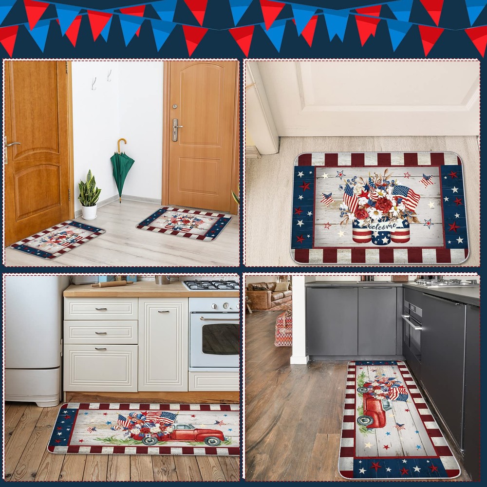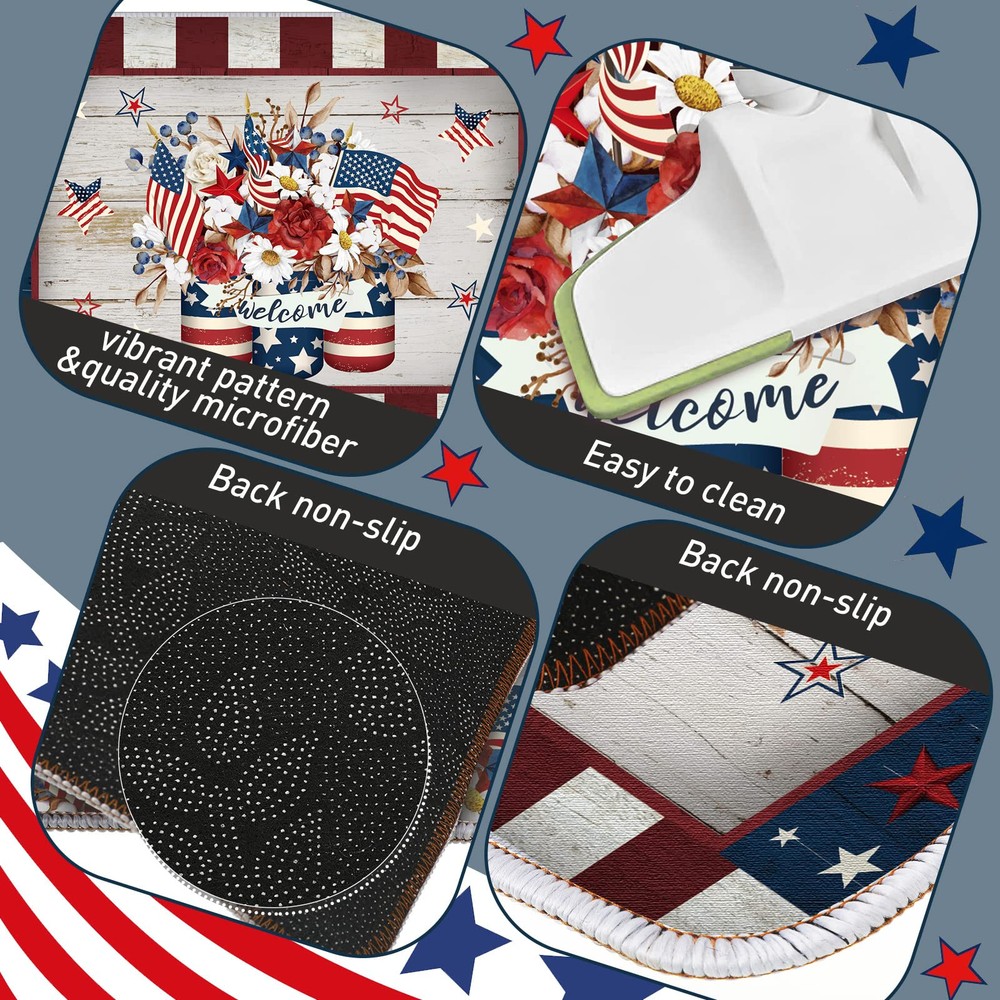 Patriotic Doormats: you will receive 2 pieces of 4th of July kitchen mats for floor in 2 sizes, different sizes can meet your various needs of using and decorating, you can also share them with others Non Slip Material: the 4th of July outdoor rug is mainly made of rubber, covered with a layer of polyester, soft but sturdy, anti slip, long lasting and reliable, not easy to tear or break, serving you for a long time Size Information: there are 2 sizes, the size of the short American door mat is about 17 x 29 inches, and the longer is about 17 x 47 inches, both of them measure about 0.25 inches in thickness; Please check about the detailed size information before purchase Independence Day Elements: the patriotic door mat is designed with Independence Day element, printed with the words [welcome], and fun patterns, adding a strong festive atmosphere to your home Widely Applied: our patriotic door mat can be widely applied to your office, home, bathroom, kitchen, laundry room, garage, living room, porch, front door, and many other places, which is not only a mat, but also a decoration