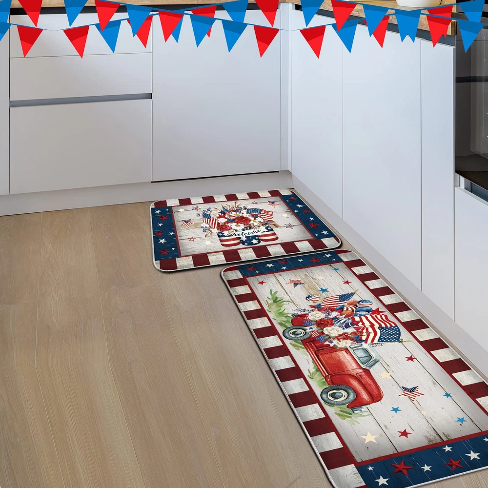 2-Pack 4th of July Kitchen Rugs with Patriotic Truck and Jar Designs in Red