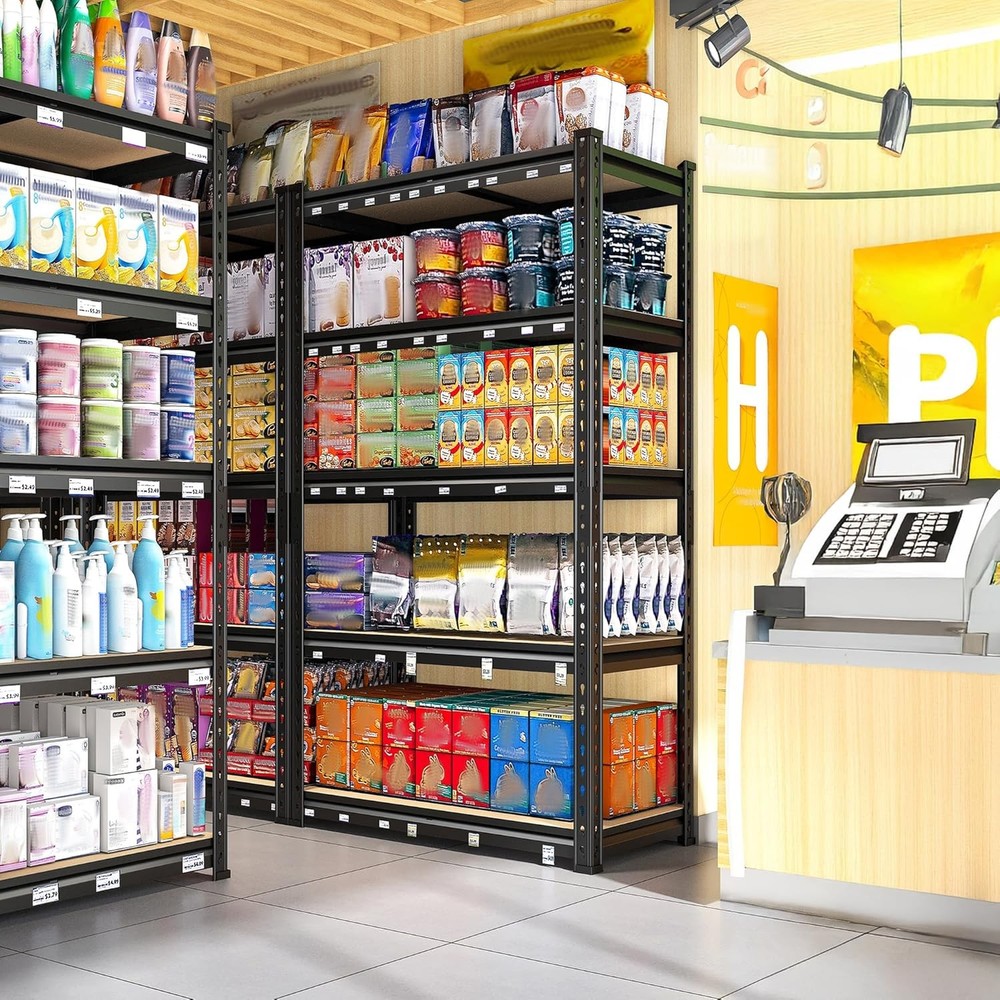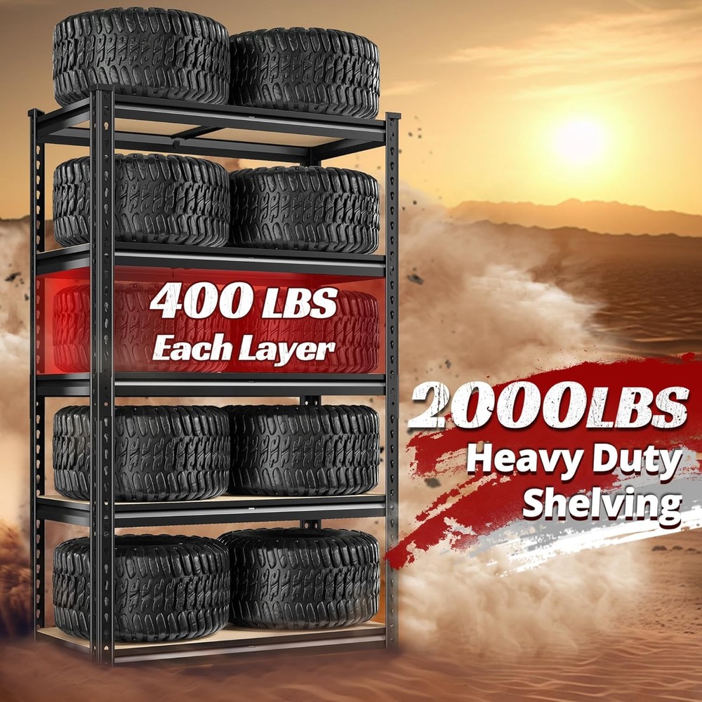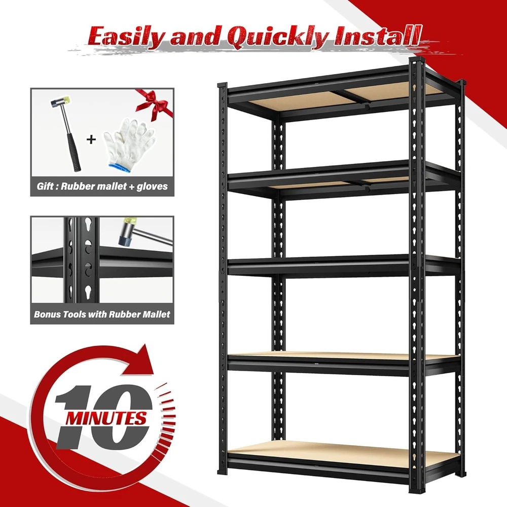 Product Description About this item 【2000LBS Garage Shelving Heavy Duty】metal shelves consist of thickened metal frame that can hold up to 400 pounds per shelf for a total load capacity of 2000 pounds, which makes the storage shelves more stable and able to store many items for a long time 【11.8"D x 27.6"W x 60"H Multifunctional Heavy Duty Shelving】The perfect size metal shelf is suitable for garage, pantry, closet, kitchen, warehouse, basement, living room, office, study, and other different spaces. The shelves not only expand your storage space and make your home more clean, but the open space allows you to find items at a glance 【DIY Free Combination and Adjustable Storage Shelves】You can split combination your storage shelves according to space. Metal shelving is equipped with adjustable connectors. The height of each layer is not only adjustable by moving the crossbar up or down but also by dividing one shelf into two individual shelves, it can provide more stability. Metal shelves for storage meet all your storage needs 【10 Minutes Easy Installation】The metal shelving adopts a special interlocking design that requires no nuts or bolts, To help you assemble quickly, we provide you with detailed instructions, a hammer, and a pair of gloves. Each 5 tier shelf takes only 10 minutes to assemble 【Professional Support】This product is one package contains 2 shelves. This heavy duty shelving comes with foot pads to reduce noise during movement and protect the floor from scratches Previous page Support ribs & A total bearing capacity of 2000LBS Thickened metal columns provide greater supoort The thickened MDF improves stability Next page High Quality Garage Shelving Note: 1 package contains 2 storage shelves