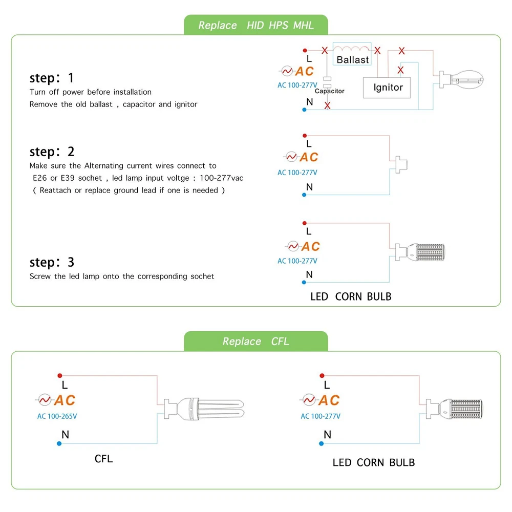 Specializing in high-quality LED replacement products in the past decade, we have more than 40 products. In addition, with improved production equipment, we can independently produce LED radiator, LED power supply and LED lamp plastic parts The LED corn lamp certified by FCC can beused to replace 70W, 100W, 150W, 175W, 200W, 250W, 320W, 400W and 600W 800w 1000w metal halide lamp (MHL),high intensity discharge bulb (HID), high pressure sodium bulb(HPS), incandescent bulb and Compact Fluorescent bulb(CFL ) perfectly. Besides, LED corn Bulb is widely used in outdoor lighting,warehouse lighting,street lighting, high-bay & low-bay LED lighting LED flood lighting, industrial spaces lighting ,garage lighting ,commercial lighting, shopping lighting and parking lot lighting,factory lighting, wall pack lighting,area lighting ,driveway lighting,post top lighting,barn lighting ,patio lighting , courtyard lighting,garden lighting ,canopy lighting projects and so on. It not only has strong lightness, but alsois high-efficiency. In addition, we provide five-year warranty With it, let us do energy conservation together Specification: CRI: >80 PF: >0.9 THD: <20% Wattage: 60W Lumen Efficacy:130lm/w. LED Lamp:SMD2835LED Brightness:7800Lm Color Temperature: 5000 Kelvin LED Qty:396pcsSMD2835 Socket: E26/E39 Waterproof: IP60 EmittingAngle:360 degrees NOTICE: ● Make sure to remove or bypass the ballast in the fixtures before installing. Don't need ballast, just wire them directly. ● Suitable for use in enclosed luminaires, Please CONFIRM the installation size ● The input voltage and lamps should be matched(AC110V-277V) ● Suitable for damp locations(Do not use withdimmers) In the Box: LED Corn Light+E39 or E26 Adapter
