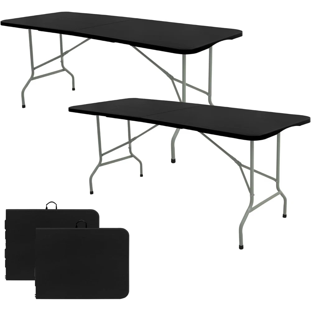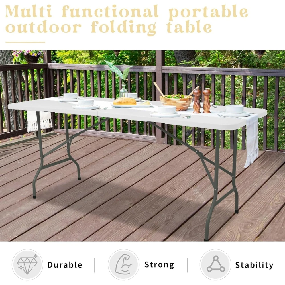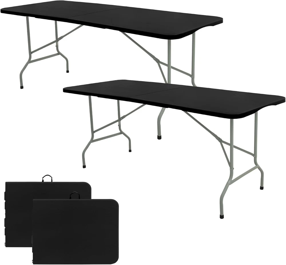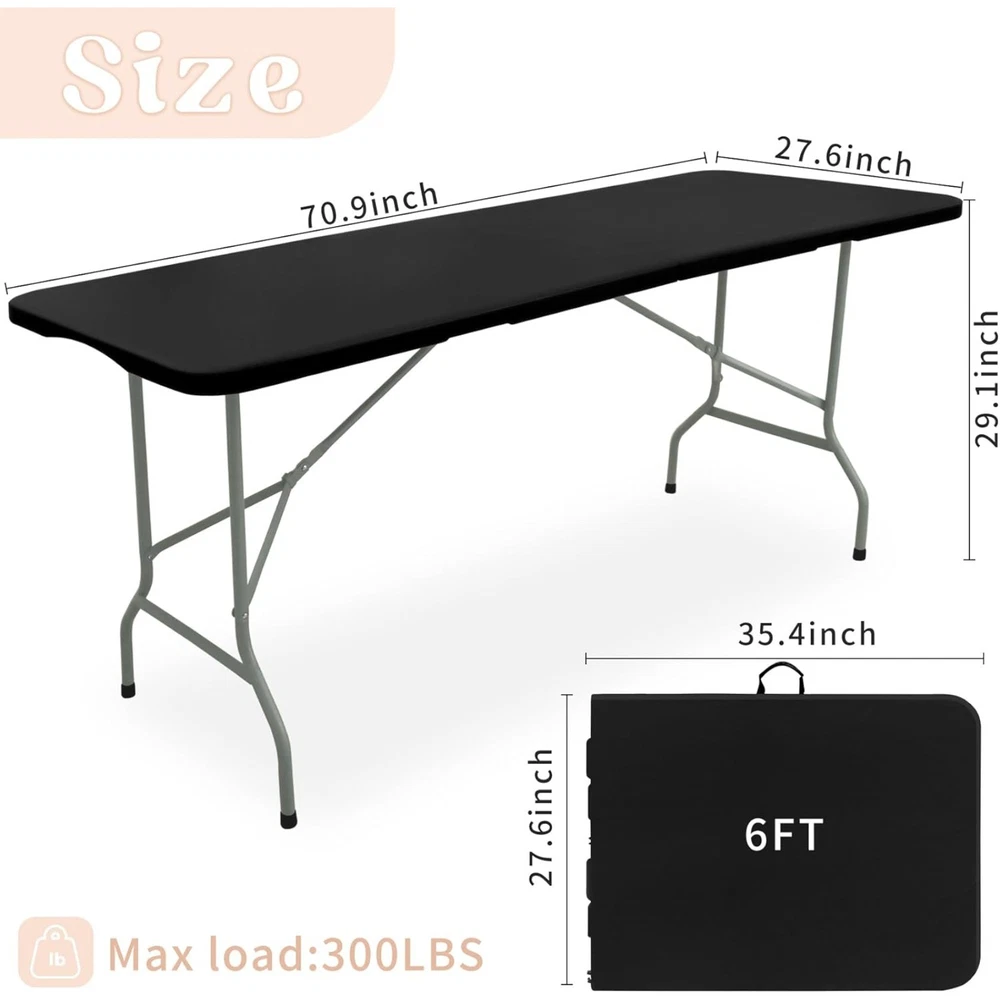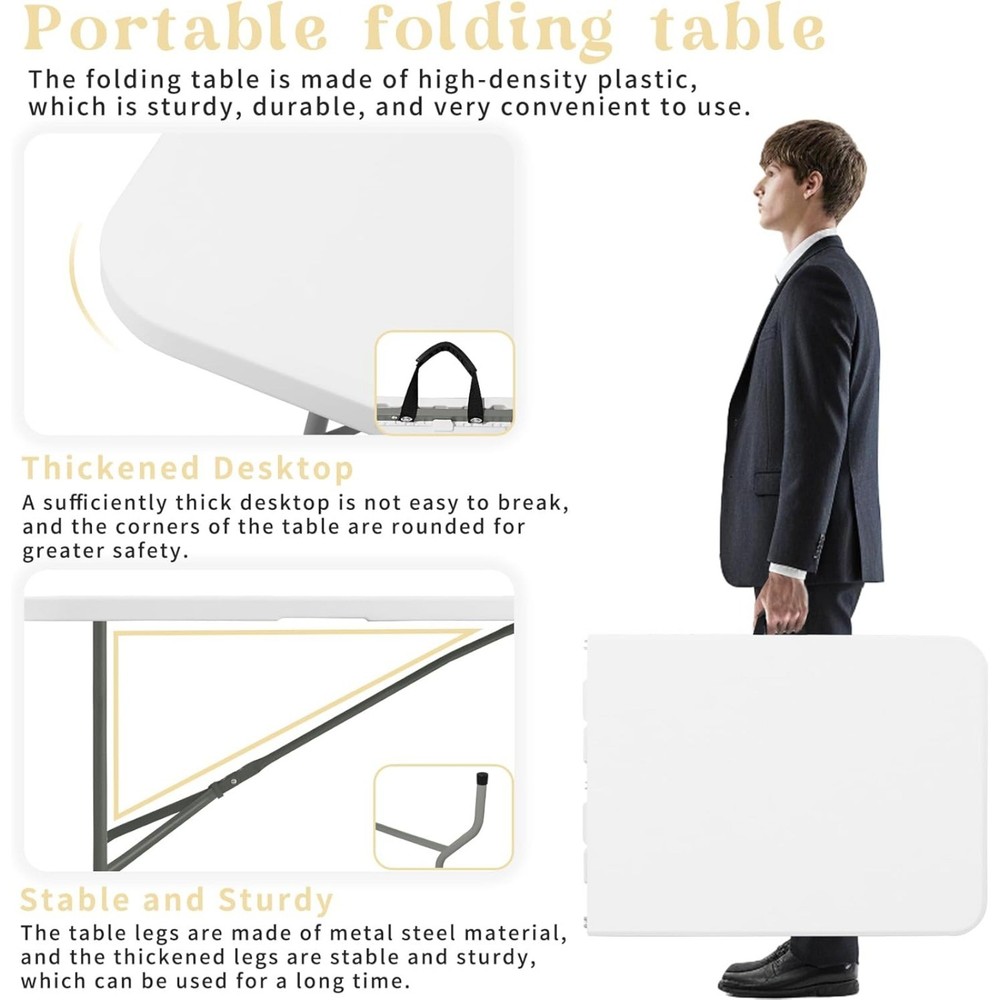 Set of 2 Folding Tab le 6 FT Lightweight Camping Table Portable Plastic Rectangular Outdoor Dining Table Steel Legs Fold-in-Half with Carrying Handle for Indoor,Picnic,Party,Wedding,Events Product Dimensions 70.9"D x 27.6"W x 29.1"H Maximum Weight Recommendation 300 Pounds Color White, Black Recommended Uses For Product Meeting, Accent, Camping, Dining, Displaying About this item Portable Folding Table: The folding table adopts a half folding design, which can be placed in any small space when idle, such as under the bed, trunk, showcase, etc. Moreover, the folding table has a built-in handle, making it easy to transport to any desired place at any time. A set of two 6 FT Folding Tables: You will receive two heavy-duty 6FT folding tables, the measuring of expanded size: 71" L x 27" W x 29" H,folded size: 35.4" L x 27.5" W x 3.5" H. The tabletop of the table is made of high-density polyethylene material, and the support and legs of the table are made of high-quality metal steel, which is not only sturdy and durable, but also structurally stable and not easy to shake. Easy to Use: This picnic table can be used directly without assembly, simply open or fold the table legs to easily complete the installation or folding of the table. The built-in safety lock of the folding table can secure the table from folding or opening. Multi Functional Outdoor Table:The surface of this folding table is smooth and sturdy, easy to wipe, and the table corners are designed with rounded corners for safety and reliability. The anti slip covers on the four table legs prevent the table from shaking freely and protect the floor from scratches. Each table can accommodate 4-8 people, making it the best choice for outdoor camping, indoor activities, picnics, offices, birthday parties, banquets, weddings, craft fairs, kitchen table, and other events.