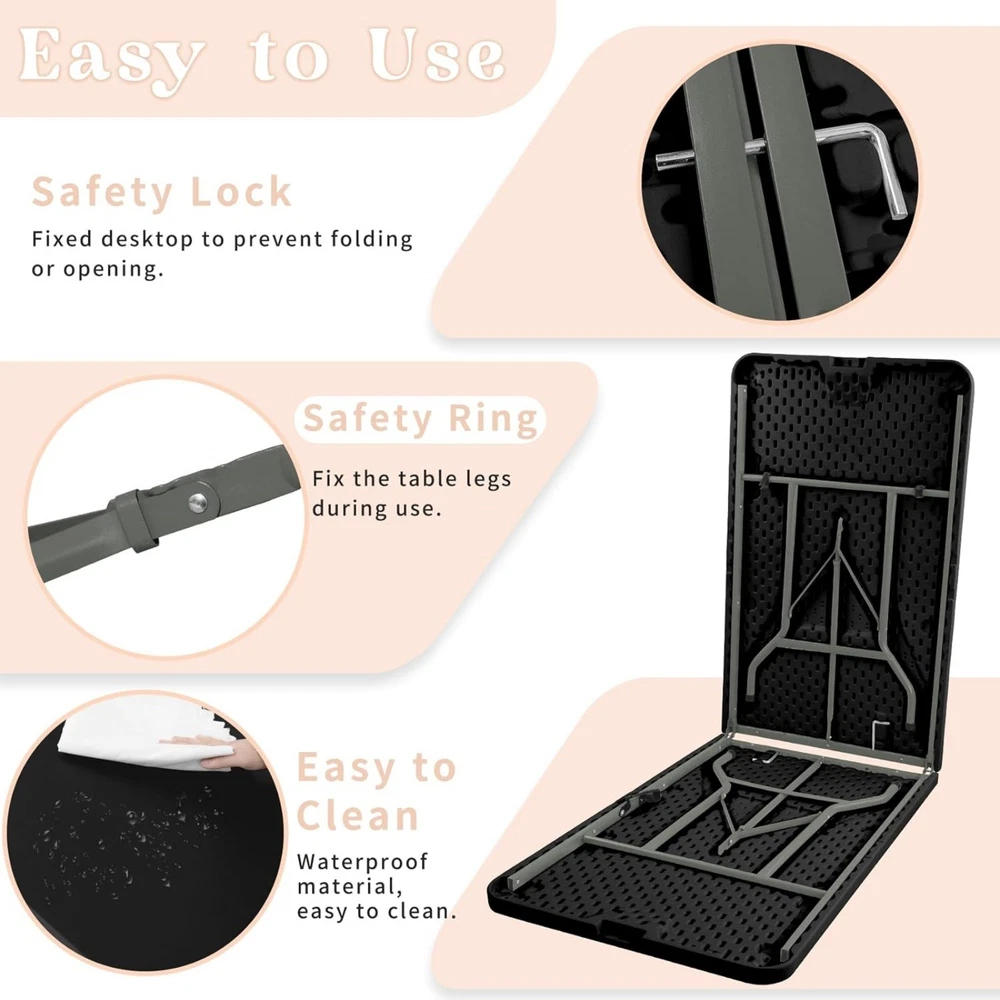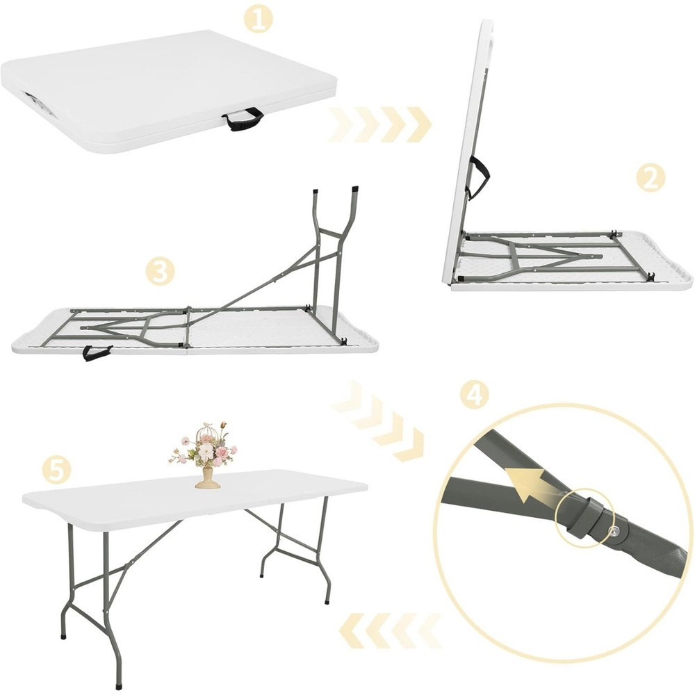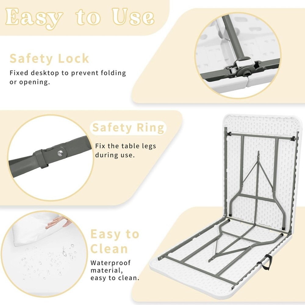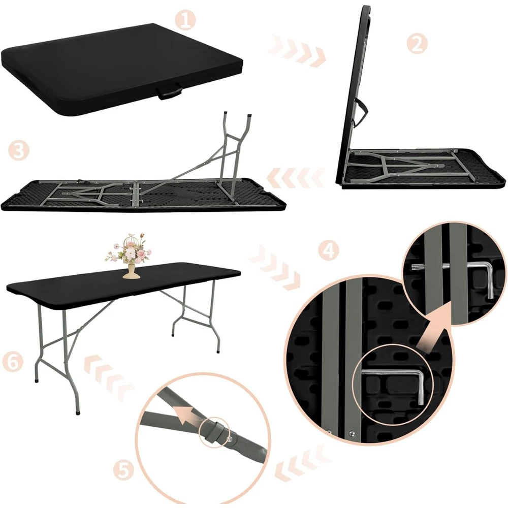 Set of 2 Folding Tab le 6 FT Lightweight Camping Table Portable Plastic Rectangular Outdoor Dining Table Steel Legs Fold-in-Half with Carrying Handle for Indoor,Picnic,Party,Wedding,Events Product Dimensions 70.9"D x 27.6"W x 29.1"H Maximum Weight Recommendation 300 Pounds Color White, Black Recommended Uses For Product Meeting, Accent, Camping, Dining, Displaying About this item Portable Folding Table: The folding table adopts a half folding design, which can be placed in any small space when idle, such as under the bed, trunk, showcase, etc. Moreover, the folding table has a built-in handle, making it easy to transport to any desired place at any time. A set of two 6 FT Folding Tables: You will receive two heavy-duty 6FT folding tables, the measuring of expanded size: 71" L x 27" W x 29" H,folded size: 35.4" L x 27.5" W x 3.5" H. The tabletop of the table is made of high-density polyethylene material, and the support and legs of the table are made of high-quality metal steel, which is not only sturdy and durable, but also structurally stable and not easy to shake. Easy to Use: This picnic table can be used directly without assembly, simply open or fold the table legs to easily complete the installation or folding of the table. The built-in safety lock of the folding table can secure the table from folding or opening. Multi Functional Outdoor Table:The surface of this folding table is smooth and sturdy, easy to wipe, and the table corners are designed with rounded corners for safety and reliability. The anti slip covers on the four table legs prevent the table from shaking freely and protect the floor from scratches. Each table can accommodate 4-8 people, making it the best choice for outdoor camping, indoor activities, picnics, offices, birthday parties, banquets, weddings, craft fairs, kitchen table, and other events.