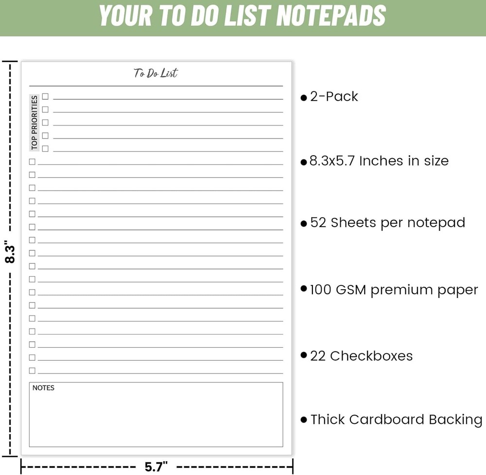 Fast Shipping On All Items 30 Days Money Guarantee Customer Support Excellent Service 100% Satisfaction Satisfaction Guaranteed TO DO List Notepad, Note Pads 2 Pack, 8.3β X 5.7β52 Sheets to DO List Notebook, Specification Item model number WYA52TODOBQB Package Dimensions 8.35 x 5.71 x 0.55 inches Sheet Size 5-x-8-inch inches Number of Items 2 Color white Material Type Paper Product Dimensions 8.3"L x 8.3"W Binding Unknown Binding Manufacturer Part Number WYA52TODOBQB Style TO DO List Notebook Item Weight 9.9 ounces Theme Book Specific Uses For Product Planning, Organizing, School, Work Special Feature Soft cover 5.71 inches x 8.35 inches x 0.55 inches. Weight: 9.9 oz Item Description π TO DO LIST NOTEPAD - Each page in the notepad is divided into four sections: Checkboxes, Top priority, Note Section, Regular To Do Section. It's scientifically divided. You can write down your priorities in the Top priority section. Note Section has enough writing space for you to write some important information and some information that suddenly needs to be recorded. π 2 PACK OF THE TO DO LIST - The to do list has two packs, 52 Sheets per notepad, in total 104 pages. Compared to other products, the todo list notepad has more pages so is more economical.You can use it in many scenarios, at school to record homework or projects that need to be done, at work you can use it to record the work you need to get done. π UNDATED DESIGN - The unique dateless design allows you to start planning from any day you need, which is very flexible and convenient.You don't have to concern about skipping a day. Focus on your tasks in easiest way to make them done.And it's easy to tear without leaving marks. π PREMIUM PAPER - To do list pad is made by 100 GSM quality paper. There are 52 sheets in the notepad. Each sheet can be easily torn off without leaving any trace. It has a thick backboard, which is not only convenient for writing but also protects the back of the paper. π IMPROVE YOUR PRODUCTIVITY: To Do List Notepad will help you to organize your daily to-do's and track your tasks. This to do list notebook will ensure you to focus on your daily tasks and it will keep you motivated and accountable to yourself. Product Description 2 Packs To Do List Notepads 52 Pages Each, Total 104 Pages 5.7 "X8.3" perfect size for easy carrying PRODUCT DETAILS HELP YOU UNDERSTAND MORE CLEARLY Top Priority Plan your requirements by priority. Easy to Tear Off Easy to tear without leaving marks. Premium Paper Premium paper is thick enough to avoid ink bleeding through. Thick Backboard Thick backboard is convenient for writing and protect paper from deformation. UNIQUE DESIGN Good tools bring more efficient! TO DO LIST Use a daily planner with 100gsm smooth white paper for easy writing. Thick acid-free paper, ink-resistant and helps keep the contents for a long time. The size of 5.7 "X8.3" provides enough space for your writing, making you more focused and efficient. Focus on what needs to be done today! DAILY PLANNER Stop procrastinating and start planning. Let it help you complete your daily tasks and manage your time efficiently, bringing out the most in your day! MAKE YOUR LIFE PRODUCTIVE USE IN MOSULTIPLE SCENARI About us We offer the best prices around on high quality products. Our E-store includes media such as books, movies, music and games while offering electronics, toys, sporting apparel, clothing, tools, general home, garden items and more. Shipping We are always working hard to ensure your package arrives as soon as possible. Please understand that some factors like weather, high postal traffic, and the performance of shipping companies are outside of our control. We offer free shipping to the lower 48 states and ship within 2-3 business days of payment, usually sooner. We do not accept P.O. Boxes. Please provide a physical address. For shipping outside of the continental USA, we only use eBay's Global Shipping Program.The item is shipped to KY and then sent to the rest of the world. International customers are responsible for all duties and taxes. Continue to check out to calculate costs for shipping the item to your country. Messages regarding eBay's Global Shipping Program MUST be directed at eBay EXCLUSIVELY. Returns We offer a 30-Day Return Policy on items in which you are not completely satisfied with. You have the option of a full-refund or an exchange of the item. No returns are available on items shipped outside of the USA Satisfaction We try over very best to make sure every customer is completely satisfied. If there's a problem, message us! We're happy to help. Payment Options Shop With Confidence