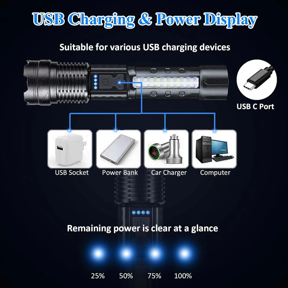 Product Description Specifications: Bulb: XHP50 High beam LED Size:16.5*4*4CM Net weight:150G Battery:Built-in lithium battery Zoom method: telescopic zoom Charging method: USB charging Material: aluminum alloy+ABS Switch: Push the switch Gear position: 7 gears Waterproof grade: IPX-4 life waterproof Features: 1. Equipped with XHP50 lamp beads , and a service life of 100,000 hours.White High beam LED can illuminate more than 2000 meters 2. Ideal for hunting, adventure and other outdoor adventure activities. 3. This product has a power reminder function, You can know the power status of the flashlight anytime, anywhere 4. Waterproof in accordance with IPX-4, waterproof, can be used in rainy weather, but can not be placed in water 5.Battery capacity display, Micro usb for computer USB, car USB, USB charging plug, charging flashlight.And support USB output function 6.7 lighting modes, super bright headlights equipped with floodlights can meet most of the lighting needs 7.Suitable for work, hunting, climbing, fishing, camping and outdoor activities, etc. Package list: 2 * Flashlight 2 * Battery 2 * Type C charge cable
