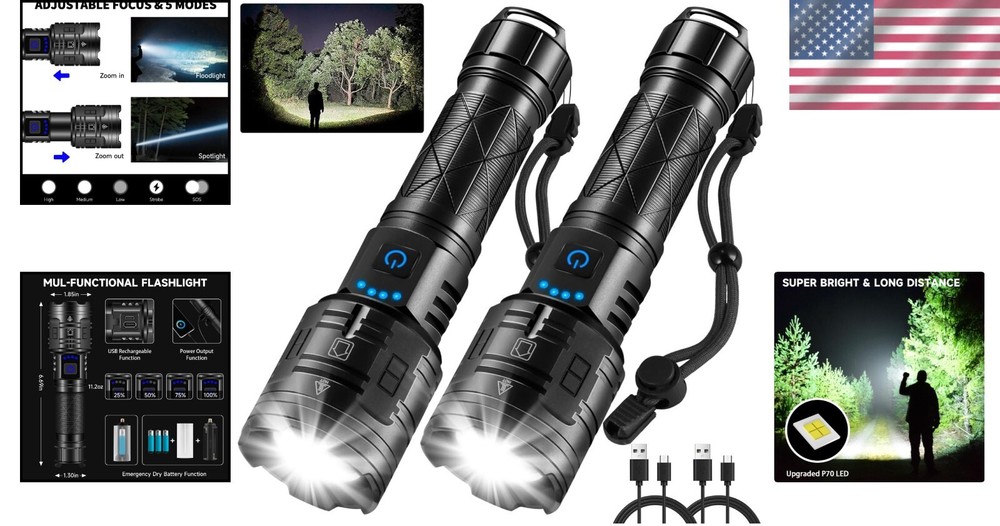 2Pack Rechargeable 990,000 Lumens Tactical Flashlights with 5 Modes - Waterproof ‹ › ‹ › ‹ › ‹ › ‹ › ‹ › ‹ › ‹ › ‹ › Rechargeable Tactical Flashlights - 2 Pack Illuminate your world with the unprecedented brilliance of our Rechargeable Tactical Flashlights . Engineered for both performance and versatility, these flashlights are perfect for emergencies, camping, hiking, or everyday use. Key Features: 📏 Unmatched Brightness: Equipped with a super bright P70.2 LED chip, producing an astonishing 990,000 lumens . Illuminate up to 1300ft² or reach distances of 1500ft . 🔋 Exceptional Runtime: High-capacity rechargeable battery provides up to 12 hours of illumination after a full charge. Fast-charging Type-C port for rapid recharging. 🔦 5 Lighting Modes: Choose from five versatile modes: High, Medium, Low, Strobe, and SOS - tailored for any situation. 💧 Rugged Waterproof Design: Crafted from aviation-grade aluminum alloy and featuring an IP67 waterproof rating, shatter-resistant for reliability in any environment. 🔌 Multi-Functionality: Includes USB output port for charging electronic devices, safety hammer design, and dry battery function for emergencies. What’s Included: 2x Rechargeable Tactical Flashlights 2x Rechargeable Batteries 2x Type-C Charging Cables 2x Dry Battery Fix Brackets 2x Carrying Lanyards 1x Premium Packing Box Why Choose Our Tactical Flashlights? Why settle for ordinary flashlights when you can wield the power of 990,000 lumens ? Our Tactical Flashlights provide a fiable solution for all your lighting needs. Whether you're facing an emergency, embarking on an adventure, or ensuring safety, trust quality and performance. Your satisfaction is our priority! Enjoy peace of mind with our one-year replacement policy. Experience brilliance today—order your Rechargeable Tactical Flashlights now! Shipping Free & Fast Shipping - We offer free shipping to most of the USA with a normal delivery time of 3-7 days. However, due to the current situation, additional delivery time (up to 3 weeks) may be required for some items. Alternative Carriers - We may use alternative carriers (e.g. USPS, FedEx, UPS, etc.) to ensure your package arrives safely and on time. Due to the use of multiple carriers, we are unable to provide a tracking number automatically. Handling Time - Orders are processed and shipped within 1-2 business days of receiving cleared payment. Shipping Restrictions - Shipping to Alaska, Hawaii, Puerto Rico, Guam, and other US territories may incur shipping charges or delivery restrictions. Please contact us before ordering, or your order can be refunded/cancelled. State Restrictions - There may be restrictions based on your state of purchase. For example, certain items may not be shipped to California due to state regulations. Contact for Tracking Updates - If you require tracking updates or have any concerns about the delivery of your order, please feel free to contact us, and we will be happy to assist you. Return Please see our eBay Return Policy. Thank you. Payment We accept all major credit cards, PayPal, and Apple Pay for your convenience. Your payment information is secure and encrypted to ensure a safe and seamless transaction. Please complete your payment within 3 days of purchase to avoid any delays in shipping. Feedback Your feedback is extremely important to us. We strive to provide the best products and customer service possible. If you are satisfied with your purchase, please take a moment to leave us a positive review. If you have any concerns or issues with your order, please contact us before leaving negative feedback. We are committed to resolving any problems and ensuring your satisfaction. Contact Us If you have any questions or concerns, please feel free to reach out to our customer support team. You can contact us through the eBay messaging system. We are available Monday to Friday, 9:00 am to 5:00 pm EST, and we will do our best to respond to your inquiry within 24 hours. Thank you for supporting our small family business! UPC: Not Set Voltage: Battery powered Item Height: Rechargeable Tactical Flashlight Item Length: Rechargeable Tactical Flashlight Item Weight: 1.57 pounds Item Width: Not Set Model: Not Set Lumens: 990000 Number of LEDs: 1 Unit Quantity: 2 Material: Aluminum,Aviation grade aluminum alloy Features: Handheld,Rechargeable,Waterproof,With USB Output Port,Adjustable Focus,5 Lighting Modes,With Carrying Lanyard,With Dry Battery Function,With Head Cusp Design Brand: Unbranded Type: Flashlight Lighting Technology: LED Power Source: Battery Operating Range: 1500 m MPN: Not Set Battery Technology: Lithium Ion Number of Batteries: 1 Lithium Ion Batteries Required. (included) Color: Black Country/Region of Manufacture: Not Set Operating Time: 12 Hours IP Rating: IP67 Number of Lights: 1 Unit Type: lb Personalize: Not Set