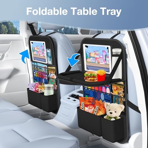This backseat organizer is a game-changer for road trips! The durable fabric and multiple pockets keep snacks, toys, and tablets neatly organized. The fold-out tray is perfect for kids to eat, draw, or use a tablet, and the kick mats protect the seats. Super easy to install and folds away when not needed. Fast shipping and great customer service—highly recommend for families!