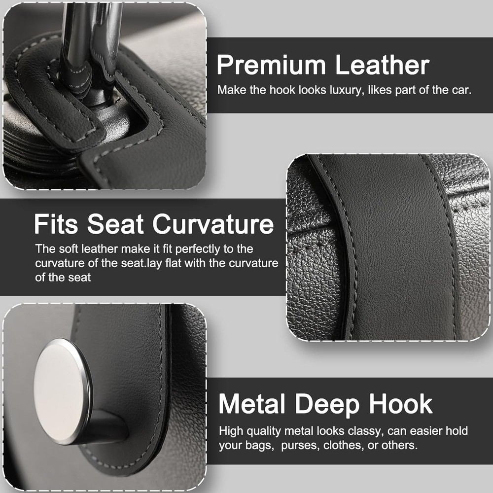 About this item MATCH CAR'S INTERIOR: Made of soft leather and zinc alloy hook, these car headrest hooks are durable and stylish. They look luxurious and blend seamlessly with the car interior. The car hanger can hold up to 44 lb, which meets the daily use demand in your vehicle. FITS SEAT CURVATURE: With soft leather, the car hook fits perfectly to the curvature of the seat and is suitable for most cars, SUVs, and trucks (installation size: 0.3-0.5 inch in diameter of the headrest bar). It's an ideal gift for family and friends! 360° ROTATION: The car bag hook can rotate 360 degrees on the headrest for both front and back use. You can also hide the hook under the headrest bar when not in use, which is space-saving and perfectly compatible with your car. MULTIPURPOSE: These car headrest hooks can hold handbags, shopping bags, umbrellas, water bottles, clothes, hats, and other items. They provide extra storage space in your car, keeping your belongings organized and easily accessible. EASY TO INSTALL: You can hang the car seat storage hook directly onto the headrest pole, making it a convenient and hassle-free addition to your car. The package includes 2 pack of purse hangers. Dimensions: 6.61 x 2.01 x 1.06 inches.