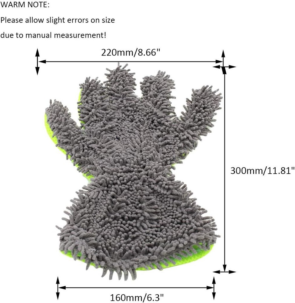 Extra Larger Size Make Cleaning Quicker: One size fits left or right hand,make clean more easier,safe on car paint and other delicate surfaces, for for car detail shop, truck, motorcycle, boat, home. Wash mits can washed by machine,can be reused after drying. Why Choose 2 Mitts? Not one?One using for cleaning your vehicle, 5-fingers wash mitt can help you well getting in smaller or hard to reach areas,2-hands gloves are better than one you can literally use both hands.The other microfiber mits can be used in house, clean the granite kitchen counters and glass dust, can also it clean up dog hair in the bathroom. Thick Absorbent Microfiber and Soft Chenille: High density and thick microfiber gloves holds the more suds and water than sheepskin, the knobby side was used for scrubbing tough dirt, and smooth side works with tons of solutions, absorbent and very soft and scratch free, we love your car as much as you do. 5-Finger Gloves Compare to Sponge: 5-finger car washing mitts design for: (1)Well getting in smaller or hard to reach places you usually miss with a sponge,like spokes,lugnuts. (2)When washing you can still carry stuff like towel,brush,foam to help clean car thoroughly. (3)You will get better coverage and get to narrow areas through flexible fingers. (4)You can still use the hose with them on. Package Contains: You will get 1 pair of 5-finger car washing mitts.Size about 300mmx220mm/11.81 "x8.66"(L*W).