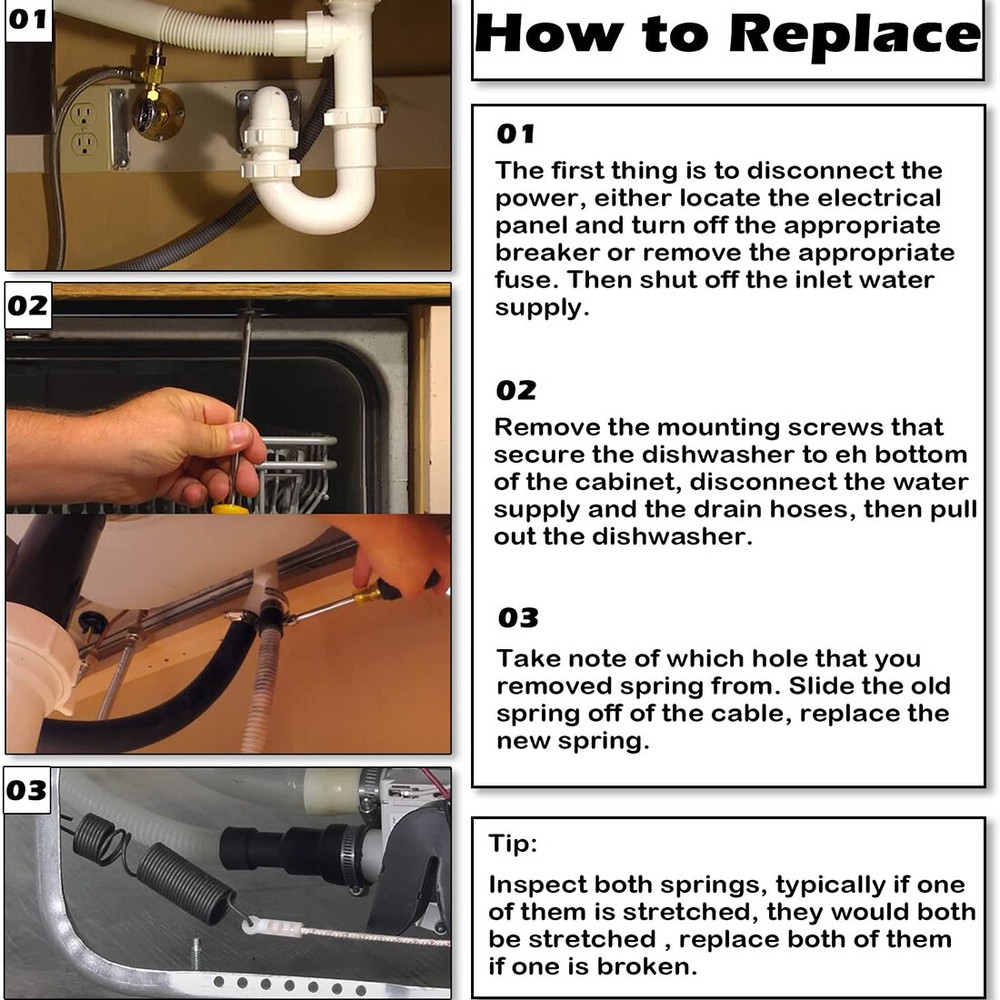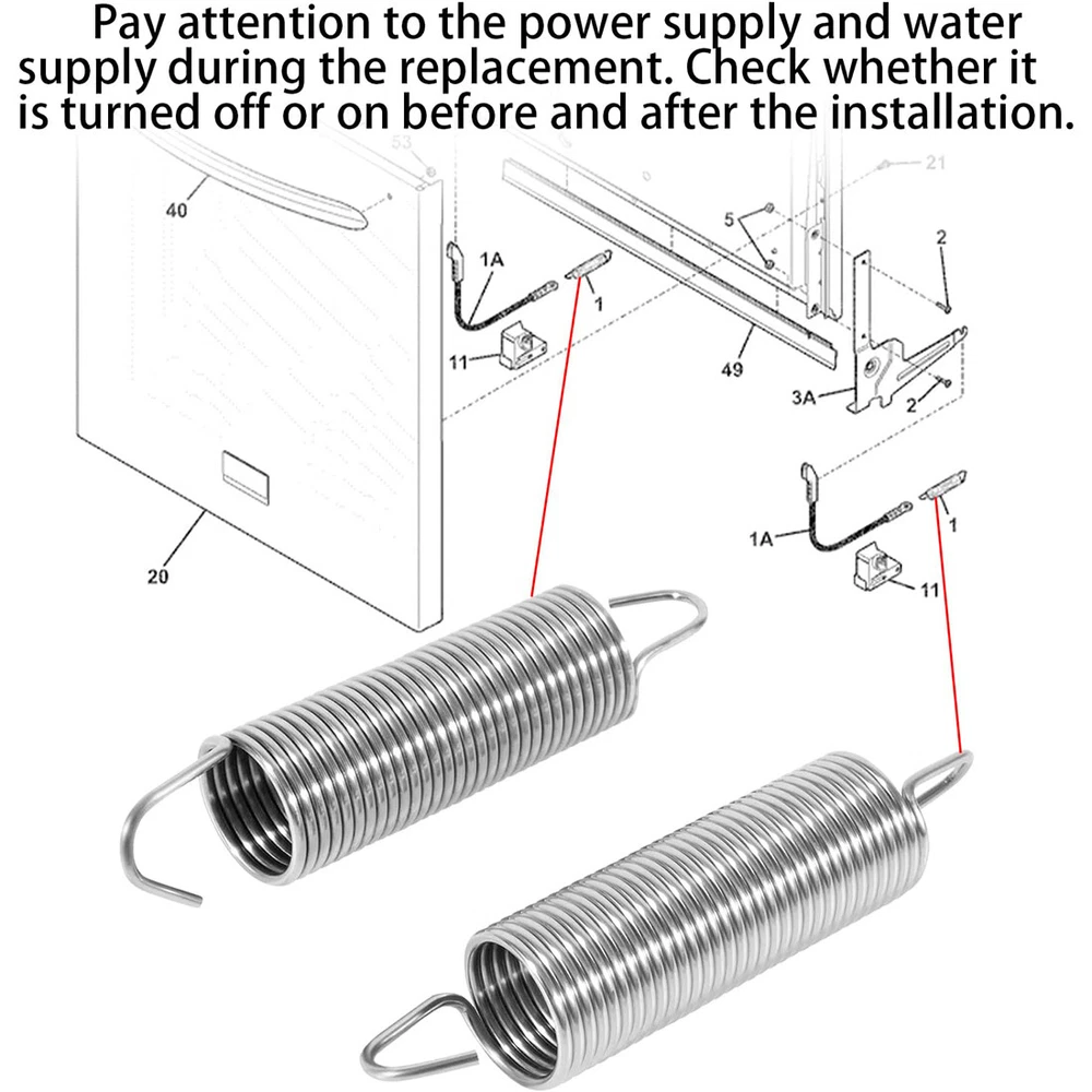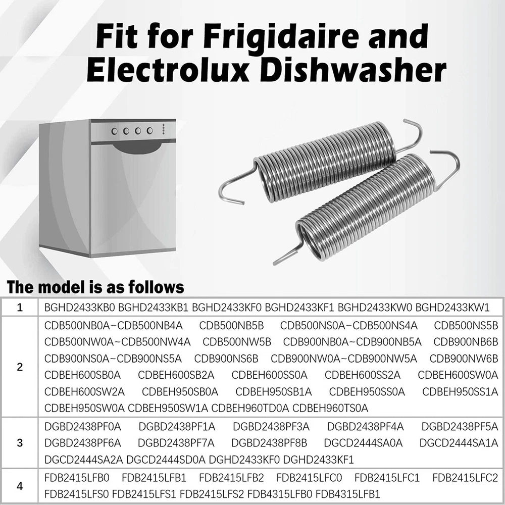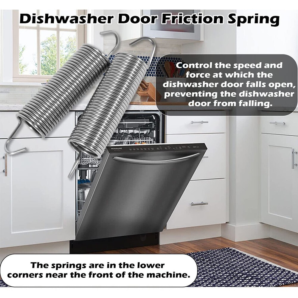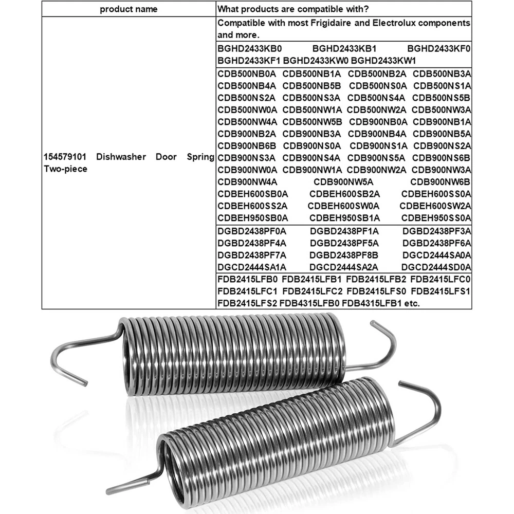 Fitment: For Frigidaire and Electrolux Dishwasher, BGHD2433KB0 BGHD2433KW1 CDB500NB0A~CDB500NB4A CDB500NB5B CDB500NS0A~CDB500NS4A Features: 1) The dishwasher friction spring is compatible with 154579101 PS1524996 1196202 EA1524996 AH1524996, fits for Frigidaire and Electrolux 2) Dishwasher Door Friction Spring control the speed and force at which the dishwasher door falls open, preventing the dishwasher door from falling. They are in the lower corners near the front of the machine 3) 154579101 replaces 1196202, AH1524996, EA1524996, PS1524996 4) Springs are made of high-quality materials for a long service life. Easy to replace, affordable, and reduce your maintenance costs 5) Inspect both springs, typically if one of them is stretched, they would both be stretched, replace both of them if one is broken Package included: 2 Pack Dishwasher Door Friction Spring