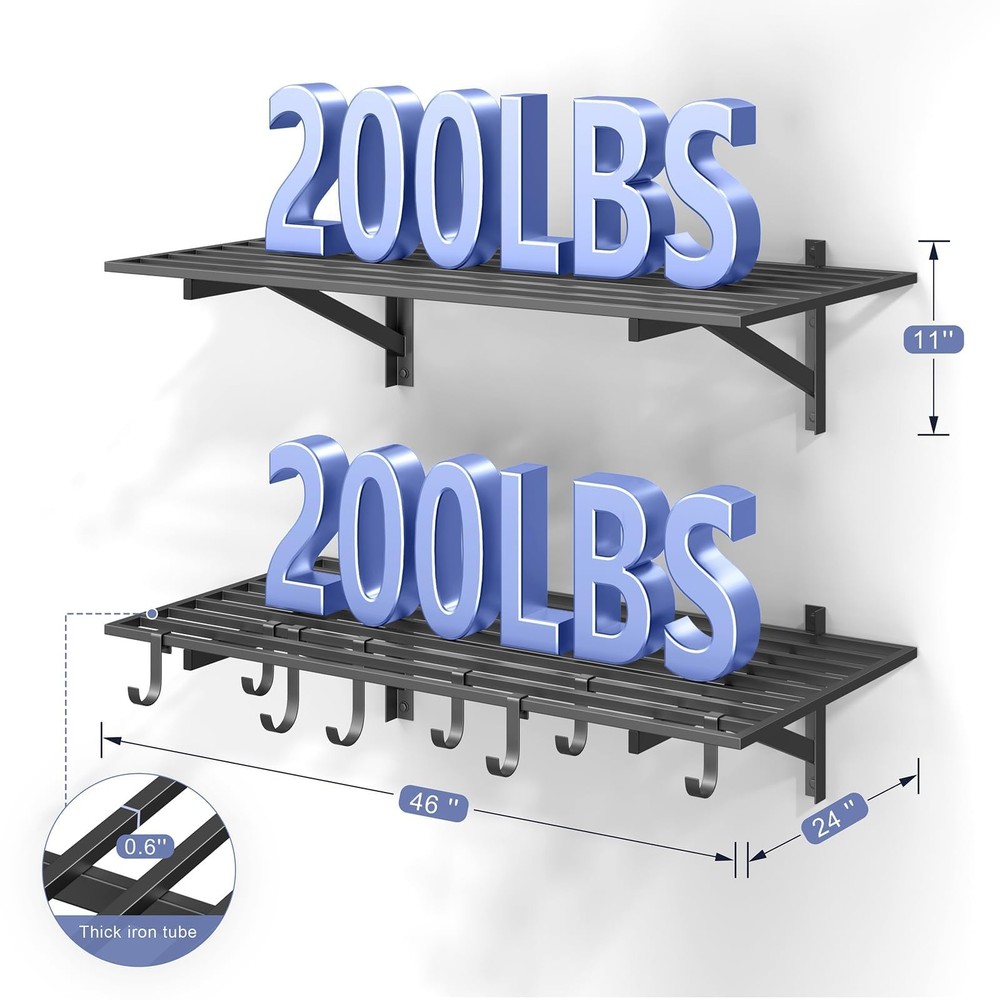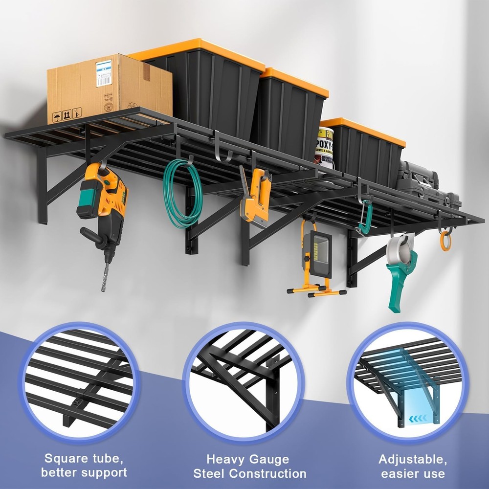 Garage Shelving HEAVY-DUTY GARAGE SHELVING: Our 2-Pack wall-mounted shelves provide generous storage, featuring two 2'x4' shelves per unit. Built from heavy-duty steel, each shelf holds up to 200 lbs, offering a combined capacity of 400 lbs. Ideal for garages, warehouses, offices, and beyond, these shelves are designed for durability, stability, and efficient space organization PREMIUM STRENGTH & STABILITY: Engineered with heavy-duty steel, our wall shelf system features reinforced square tube supports, a seamless integrated frame, and secure U-hooks for superior durability. Every component undergoes rigorous quality testing to ensure maximum safety and long-lasting performance VERSATILE STORAGE HOOKS: Designed with 2 large and 6 small hooks, this shelving system provides flexible hanging space below the shelves. Perfect for organizing garden tools, sports gear, extension cords, toolboxes, cleaning supplies, bikes, and seasonal decorations with ease EASY TO INSTALL: Designed for hassle-free setup, our wall shelf system includes an Installation Template, Bubble Level, and step-by-step guide for one-person assembly. All necessary hardware is provided for quick, secure, and precise installation on wood studs or solid walls (concrete/brick). Note: Not suitable for metal walls. WORRY-FREE PURCHASE: Backed by 24/7 customer support. For brick or concrete walls, use expansion anchors for secure mounting. Our dedicated team is here to assist with any questions.