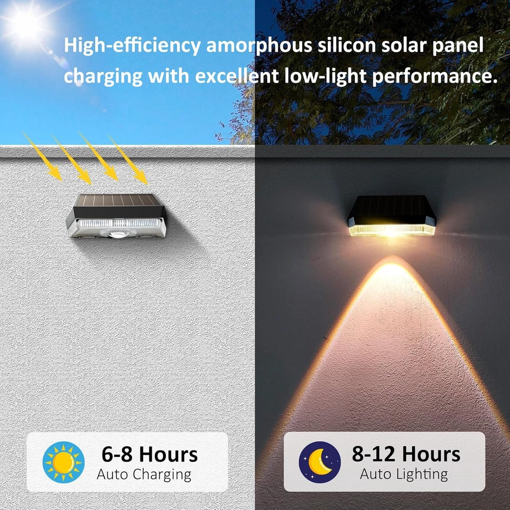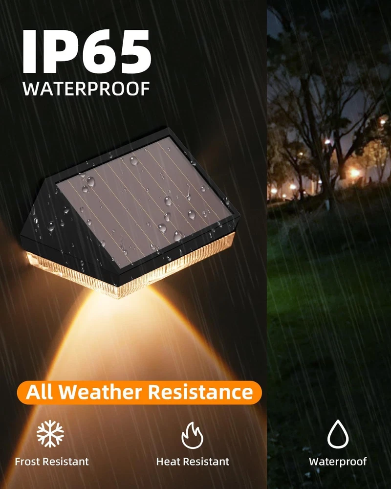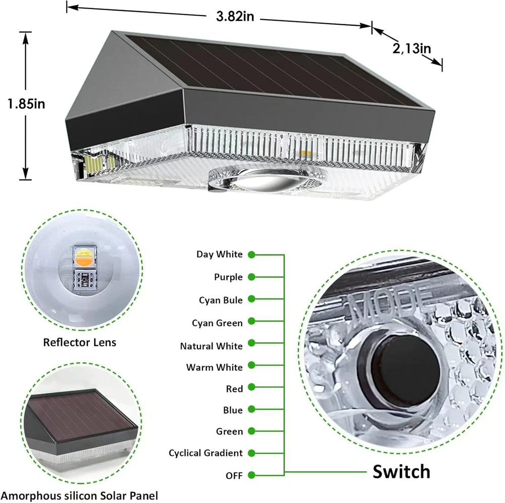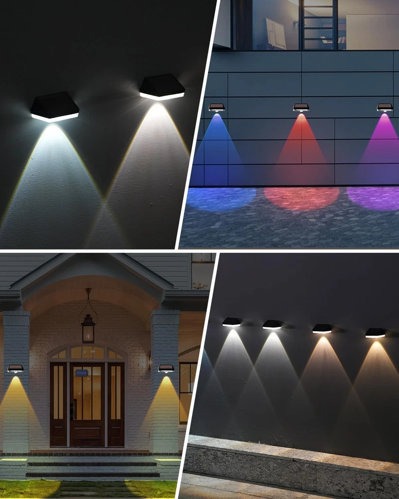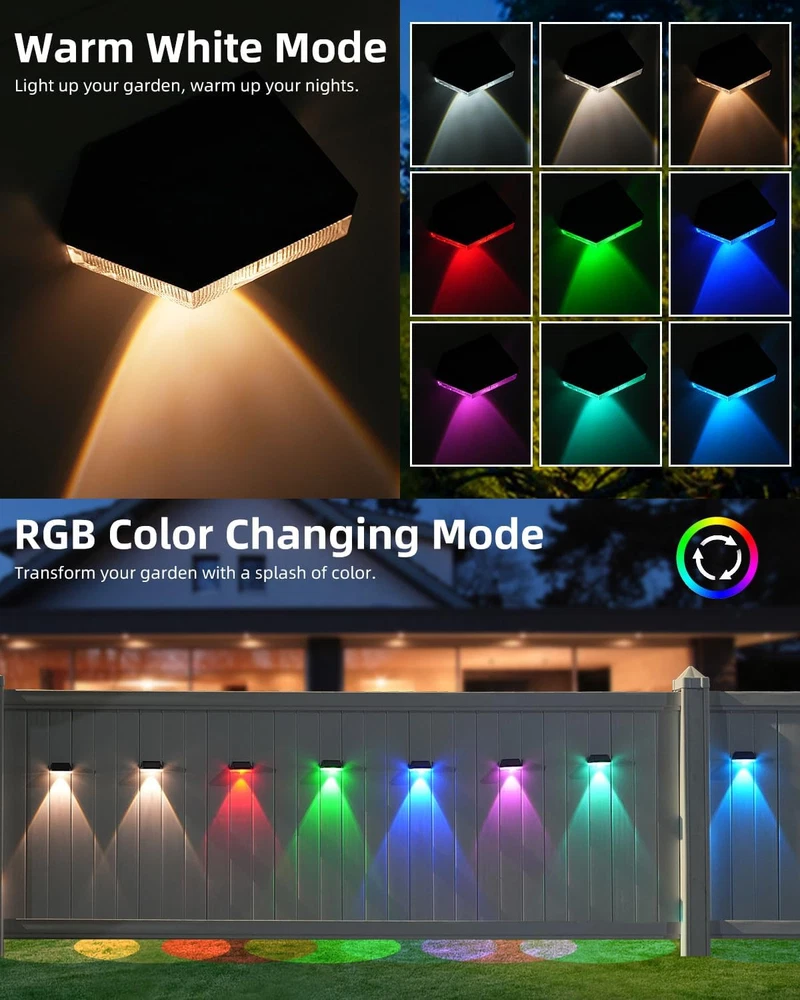 About this item 10 Lighting Modes Fence Solar Lights: Our solar lights for fence offer 10 lighting modes: Cool white/Neutral White/warm white/Red/Green/Blue/Purple/Cyan Green/Cyan Blue/circulate off mode. Warm white is suitable for daily lighting, illuminating your fence or courtyard. Solid RGB is suitable for birthday, party and other decorations. The RGB fade mode is very suitable for Halloween and Christmas decorations. If you're looking for an eco-friendly and cost-effective way to light up your patio, this solar-powered option is sure to impress Focused & Energy-saving: The fence lighting solar powered come with one high lighting LEDs and equipped with upgraded reflective lens that up to 30 lumens bright, emitting a more focused and intense beam of light and illuminating a wider area. At the same time, high-quality photovoltaic panels can convert sunlight into electricity 20% more efficiently than most other solar fence post lights and help you reduce your electricity bills 2 Types of Installation: Fence post solar lights are relatively easy to install since they don't require any electrical wiring. outdoor fence lights can be mounted with screws (included) on outdoor walls, fences, next to the porch, or can be directly affixed with 3m adhesive (included), which does not require a professional electrician to install and saves labor costs Waterproof & Auto ON/OFF: This outdoor wall lights is made of weather resistant ABS material with a waterproof grade of IP65. The outdoor patio lights can withstand various outdoor conditions such as rain, snow, and extreme temperatures. And the solar powered fence lights automatically charge under sunlight. When the rechargeable battery is fully charged, the outdoor solar fence lights can light for at least 8 hours Portable Size & Widely Used: Our deck lights solar powered are compact and portable, easy to handle and install in a variety of locations. Despite its small size, the outdoor step lights are very bright and suitable for enhancing security around doorways and garages, illuminating paths and backyards, and providing ample lighting for steps, fences, paths, stairs and more Packing include: 2 x Solar Wall Light 2 x Installing Screws