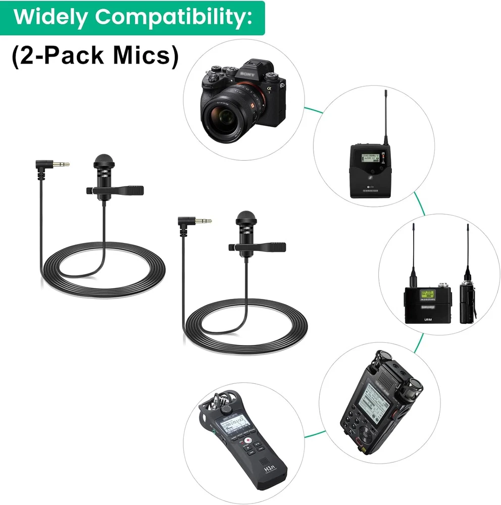 Lavalier microphone compatible with DJI mic 2 and mic 1 wireless microphone system bodypack transmitters(tx); Also compatible with Rode wireless go ii / 2, wireless go, wireless me, and wireless pro microphone system bodypack transmitters(tx); And compatible with Hollyland Lark Max, Lark 150 wireless microphone system bodypack transmitters(tx) Conveniently using for interview, vlog, stage, presenters, interviwers, broadcasters, lecturers, fitness instructor and any other applications requiring minimum microphone visibility with maximum comfortability operation Omnidirectional condenser microphone, less noise, voice clarity, high sensitivity, more flexible, better for picking up voice Black, 1.5 meters / 5 feet, compact and portable, small enough where it can be easily hidden under the talent's clothing and not be noticeable; High quality windscreen foam cover, keeps your microphone safe from harmful, dust, moisture, corrosion 3.5mm male 90 degrees l-shaped plug, right angle, easier to plug in and plug out; 3 poles TRS gold-plated tip, better surface and less resistance Omnidirectional condenser lavalier lapel microphone, professional vocal pickup condenser mic, used for wireless microphone bodypack transmitters. With 1/8"(3.5mm) golden-plated connector (3 poles tips, TRS) and windscreen foam cover. Features: Connector:3.5mm Plug Polar Pattern:Omnidirectional Cable Length:5 feet / 1.5 meters Products include: 2 x Lav Microphones 2 x Windscreen Foams