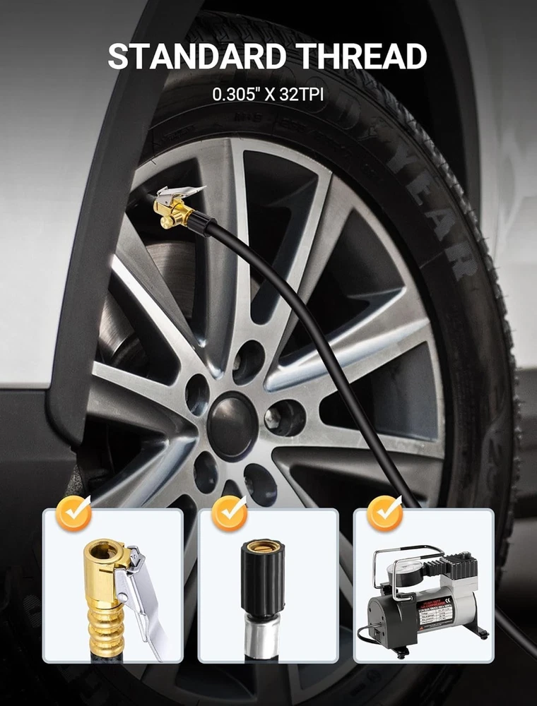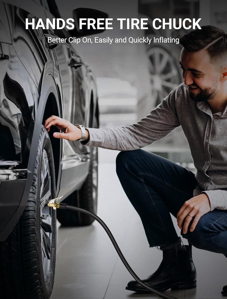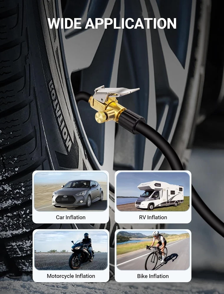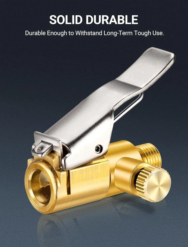 2-Pack Locking Tire Air Chuck, Brass Tire Inflator Hose Adapter w/Clip Adapter & Release Button for Lock On, No Leakage Air Compressor Pump Clip On Tire Chuck Nozzle Adapter Connect Accessories Tool 【Quick to Inflate & Deflate】 locking air chuck is equipped with deflation valves, which adds release function. Screw on it tightly and then clip it onto tire valve stem to inflate. And simply press down the deflated button to release. Clamping firmly on tire valves makes it a perfect inflation tire chuck for good sealing & quick efficiency inflating. 【No Leakage & High Efficiency】No other tool is required. Just press down locking clip on tire inflator, push or twist the tire air chuck into the valve stem until it is clamped, and then start your hands free tire inflation without leakage. This tire inflator chuck gives you a great seal on the tire valves, which is absolutely great air tire inflator nozzle hose adapter accessory. 【Solid Construction & Durable】All metal construction, along with solid brass for higher strength and durability, corrosion resistance and wear resistance, which is a perfect choice no matter for business or household use. Durable enough to withstand long-term tough use. 【Easy Operation & Fixation】Plug this open flow air chuck into the hose and hook it to the valve stem, also can fix regular connection to inflate. This tire inflator chuck fitted for coach and truck tire valves, which is easy to depress and strong enough to stay in place. 【Universal Fitment Accessory】Your go-to for tire crisis. Portable tire inflator chuck adapter with standard tire valve thread. Ideal for conveniently inflating tires with schrader valve, widely applicable for various vehicles, bike, motorcycle, truck, car tire fill etc. If you are looking for a durable and convenient air chuck, this one is for you.