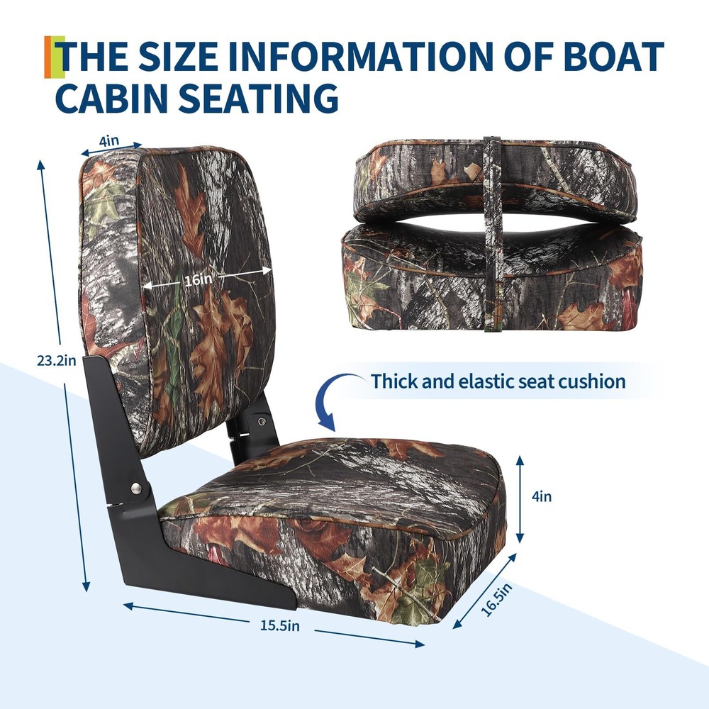 About this item 【Enhanced Comfort】 Our boat seat features thick seat and back cushions designed to perfectly fit your body curve, providing excellent support and helping to alleviate back pain. 【High-Quality Materials】 Made with weather-resistant and waterproof PVC material, this boat seat is durable and can withstand the elements. The tight stitching and abrasion resistance ensure long-lasting use. 【Superior Durability and Stability】 The heavy-duty rust-proof aluminum alloy hinges and stable injection-molded plastic frame provide excellent durability and stability. This seat can stand up to the shock of great waves. 【Convenient Folding Design】 The aluminum hinge design allows for easy folding and storage. Simply flip up the backrest for a comfortable seat, and fold it down to save space when not in use. 【Easy Installation】 Detailed illustrated instructions are included for quick and easy assembly. The 5" x 5" bolt hole pattern allows for easy mounting to any standard 4-bolt swivel. Product Description Wide Seat Design The seat is filled with thickened ultra-high-density sponge, which has good rebound and can perfectly fit the body curve. The wide seat design provides comfortable support and can reduce the fatigue caused by sitting for long periods of time. Easy to Fold and Store Our boat seat is designed with a fold-down feature, making it perfect for saving space on boat. The premium metal hinges allow for easy snapping down, and the fixing strap ensures the backrest stays in place securely. Low Back Boat Seat Our low back boat seats are expertly designed with professional ergonomics, conforming perfectly to your body's contours. They provide excellent lumbar support, protecting your spine and reducing fatigue during long hours of sitting. Whether you're on a fishing boat, sightseeing boat, speedboat, or canoe, our boat seats are the ideal choice. They're armrest-free, allowing for easy casting and fishing without any obstructions. Top About this item Similar Product information Reviews Payment Delivery details Terms of sales About us Contact us Payment We accept payment either via PayPal or any of the following credit cards; Visa, MasterCard, Discover, and American Express. Delivery details 1. We will delivery out at the handing time when we receive the payment. 2. The delivery time is 3-5 business days to US by usually time.The parcel maybe delay 1-2day of the weekend.Due to the bad weather,Holidays,Hot Season ect.the parcel maybe delay,If you have any problems,mssage us,we will try our best to solve it. 3. We ship to your eBay address. Please make sure your eBay address is correct before you pay. 4. If you want to change the shipping address,message us before our send out. Terms of sales If you are not satisfied with the item for any reason, please do not quick to leave negative/neutral feedback even open request and case without any communication with us. We devote ourselves making EVERY CUSTOMER in 100% Satisfactory and resolve any problem. Thank you for your understanding and recognition,we are always leave positive feedback to all our customers. About Reply: All replies will be sent to your email box, if you do not get response within 24 hours (Sat. & Sun. excluded) please check your eBay My Messages in case that our emails will be filtered automatically by your settings. About us automobilee-01 is a brand new store but we are one of North America’s top online suppliers of specialized, high-quality aftermarket online retailers and suppliers, committed to developing new markets. We primarily offers tool sets, auto parts, home goods, etc..With over 20 years of product selection and manufacturing experience, we delivers unparalleled quality, value, service and satisfaction. Our highly-trained, professional staff offer in-depth knowledge and personalized assistance for customers worldwide. Providing our customers with a simple, hassle-free experience with best-in-class customer service is more than a goal. Contact us Any problem please rest assure to contact us by eBay message first. We will reply you as soon as we can. We will deal with it within 24hs on working days. Type Boat Seats Brand Unbranded Color Camouflage Material PVC Department Unisex Adults MPN Does not apply Assembly Status Fully Assembled Item Length 15.5 in Item Width 16.5 in Item Height 23.2 in Vehicle Service Type Boat Number 2 Pack Specifications Low Back Seating Capacity 2