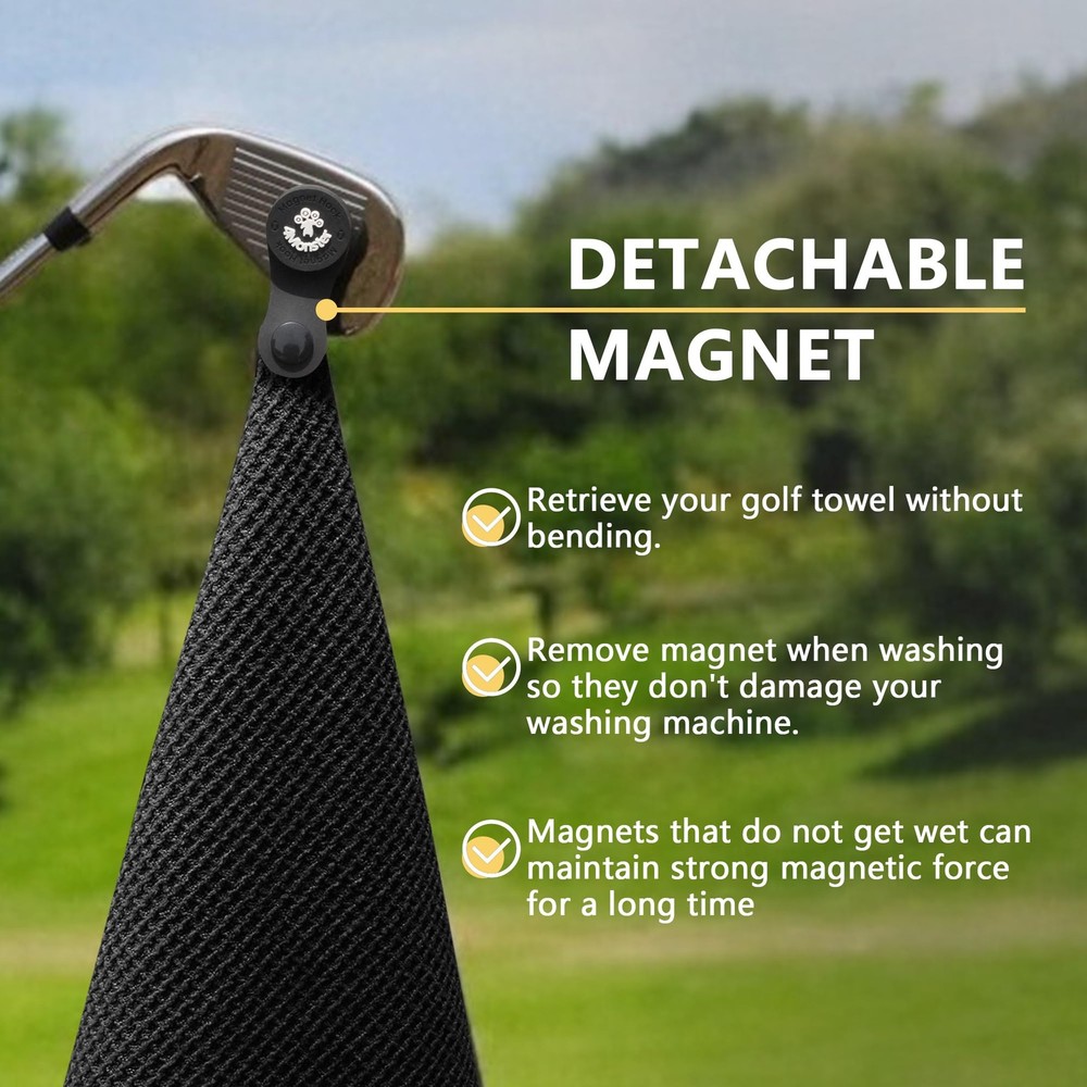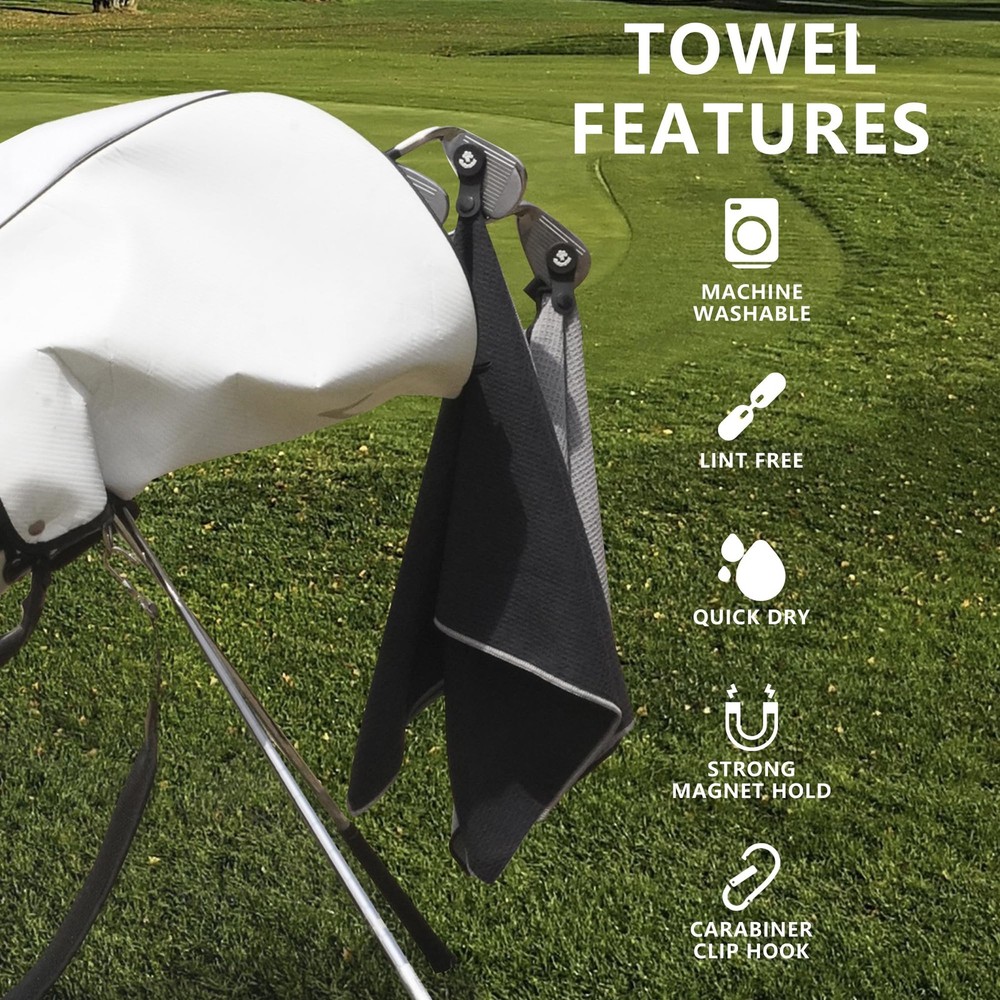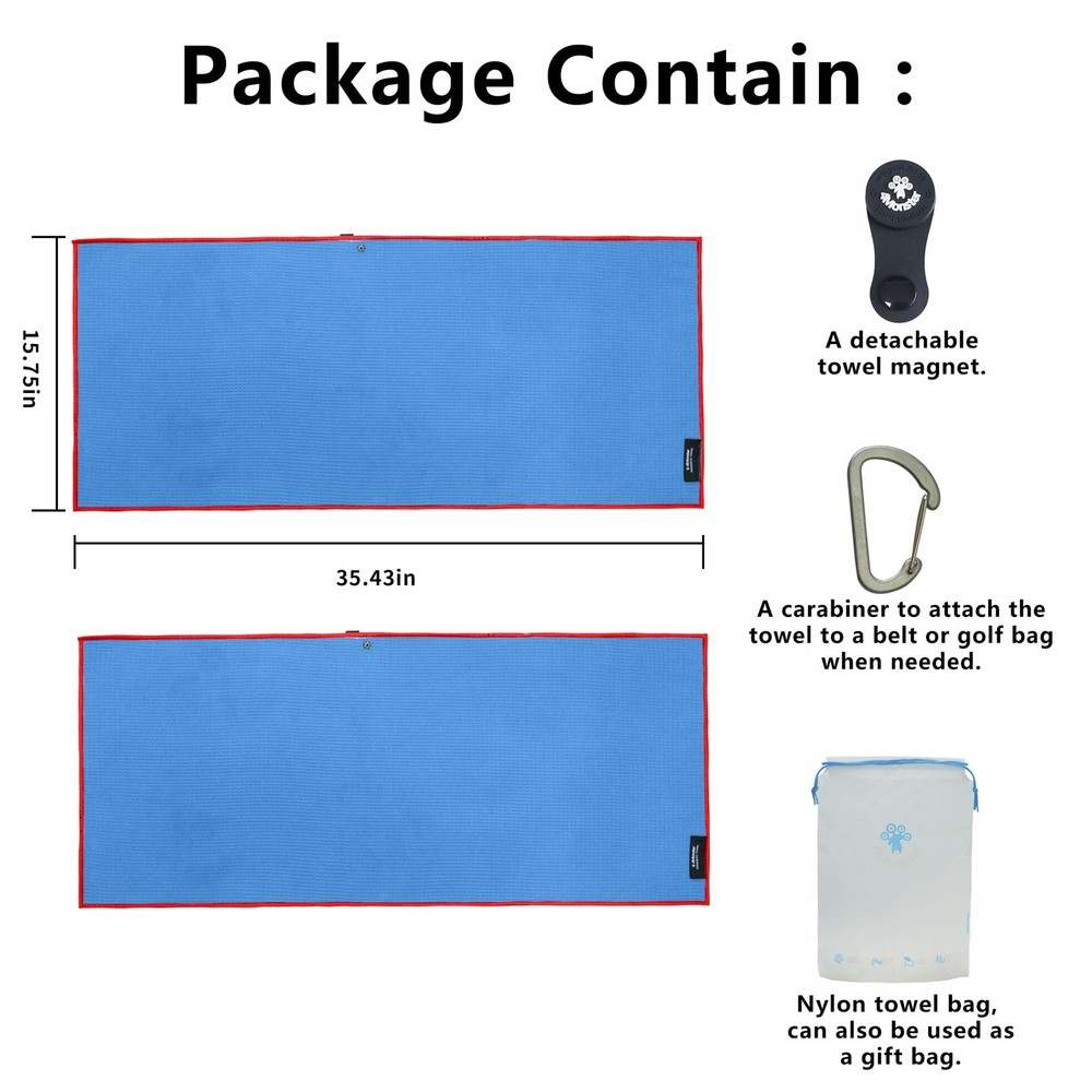 Elevate your golf game with the Golf Towel Set, designed for convenience, durability, and performance. Available in two sizes to suit your needs: Medium (M) - 15.75" x 15.75" (40cm x 40cm) or Large (L) - 15.75" x 35.43" (40cm x 90cm). Whether you’re wiping down clubs, cleaning your hands, or keeping cool on the course, this set has you covered. What’s Included: M Size Pack: 3 premium M-size golf towels, 1 detachable magnet, 1 carabiner clip, 3 towel tie straps, and a portable mesh pouch for easy storage and travel. L Size Pack: 2 spacious L-size golf towels, 1 detachable magnet, 1 carabiner clip, 3 towel tie straps, and a portable mesh pouch for effortless portability. Two Size Options: Choose the compact M size (15.75" x 15.75") in a 3-pack for versatile, everyday use—perfect for quick cleanups—or the generous L size (15.75" x 35.43") in a 2-pack for maximum coverage and comfort, ideal for longer rounds or heavier-duty needs. Detachable Magnet Design: The innovative removable magnet attaches securely to golf carts or bags for easy access, yet detaches for machine washing without damaging your washer. Built to retain its strength wash after wash. Enhanced Portability: Each set includes a sturdy carabiner clip to hang your towel on your golf bag, plus a lightweight mesh pouch with a drawstring design—perfect for storing and carrying your towels on the go. This thoughtfully designed towel set also makes an ideal gift for golf enthusiasts. Premium Waffle-Weave Microfiber: Crafted from high-performance waffle-pattern fabric, these towels are ultra-soft, highly absorbent, and quick-drying—perfect for tackling sweat, dirt, or wet clubs. We want to make sure you have an amazing experience with us. 30 day no hassle returns / free exchange,12 month warranty.We make sure you’ll have nothing to worry about.