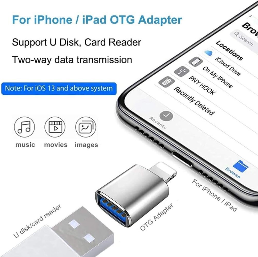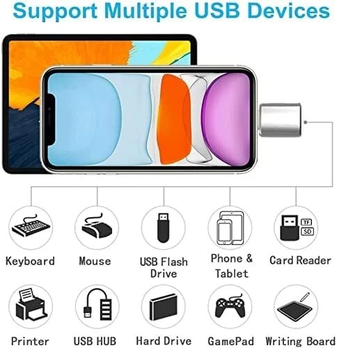 Male to USB Female Camera Adapter,2 Pack Portable Color: silver Compatible Devices Camera, Smartphone Specific Uses For Product Camera, Cell Phone 【Upgraded to USB 3.0 Adapter】Plug and Play,The USB OTG Adapter is perfectly compatible with the iPhone and iPad. It allows you to check your pictures and videos from the camera anytime and anywhere, No 3rd party app required, plug and play; 【Super Compatibility】The USB Camera Adapter can be compatible with iPhone13/SE 2020/12/12Pro/12 mini/11/11 Pro/11 Pro Max/Xs/Xs Max/X/8/8 Plus/7/7Plus/6/6 Plus/5/5S/SE.For iPad Air /Mini /Pro,iPod touch 7/iPod Nano 7( IOS 9.2 to 14 for iPhone & IOS 8.0 or Later for iPad ).Support iOS 9.2-14+ system of Apple devices. 【Super High Speed】The transfer speed of this USB Camera Adapter is 25MB/S-30MB/S which is 2 times faster than the speed of other products, the best way to copy photos and video to the iPhone or iPad in a short time.