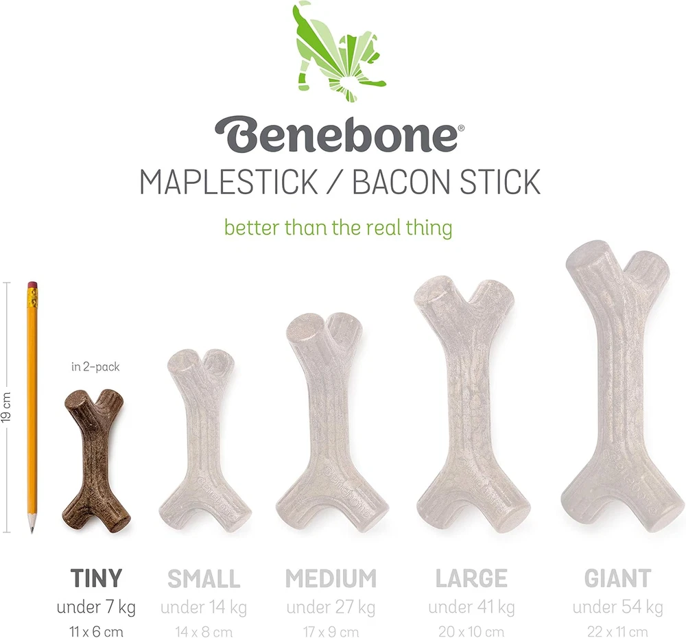 DURABLE, LONG-LASTING – Pint-sized super chewer? Bring it on. Benebones are tougher than real bones and last for weeks. REAL BACON AND REAL WOOD – We use only 100% REAL BACON for flavor and scent in our Zaggler, and real maple wood in the Maplestick. Trust us, little dogs can tell the difference. EASY TO PICK UP AND CHEW – Our Maplestick and Zaggler are uniquely shaped for a paw-friendly grip so your pup can quickly grab them and get a good chew going. Think about it: dogs don’t have thumbs. UNIQUELY FUN SHAPES - The Maplestick’s unique shape will surely upgrade your game of fetch. The Zaggler likes to roll around and is constantly on the move. Two fun shapes in one pack! USA Made – We make and source everything in the USA. The Benebone Tiny Maplestick/Zaggler Little dogs love to chew just like the big guys. And they dig real flavors like bacon and maple wood. About Benebone At Benebone, we started with the premise that dogs experience scent and flavor in a way we can’t even grasp. So we ditched the neon colors and loud squeaks. Inspired by a dog’s powerful sense of smell, we developed long-lasting durable chew that are jam-packed with real bacon and real maple wood. Once your tiny dog takes a bite of our USA-made chews, he’ll be hooked. We’re Obsessed with Safety Too Wonder if Benebone is right for your dog? Here’s what you need to know. Since it’s hard, it’s important that your pup has strong teeth. If you’re unsure, check with your vet. Nobody likes an unexpected trip to the dentist. Keep an eye out for wear and tear. Within a month or so, we find that most dogs chew Benebone into submission. See the wear page on our website for helpful photos to determine when to replace yours. Keep away from households with peanut or other allergies. What’s Inside? Nothing but Nylon and Real Bacon & Real Wood for Tantalizing Flavor