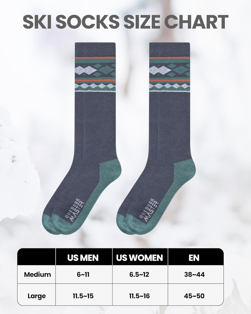 BREATHABLE, WARM & COMFORTABLE Made in a wide range in sizes of a Merino Wool blend that is LIGHTWEIGHT, BREATHABLE and PREVENTS build-up of SMELL. It also helps keep feet dry due to it's moisture wicking properties. OVER CALF DESIGN High calf design & elasticity for the ULTIMATE COMFORTABLE FIT. Perfect for skiing, snowboarding and other snow sports. STAYS UP Equipped with NON-SLIP CUFF that ensures that the sock stays up. Socks slipping down in the boots is a thing of the past! ITCH-FREE, MADE TO LAST, EASY TO WASH & BEAUTIFUL PACKAGE BAG Have an itch-free time out in the snow with this high quality merino wool blend. And afterwards, enjoy great MACHINE WASHABLE quality that is made to last. The package bag makes them a perfect gift item! Make sure that your kids feet are comfortable, warm and dry when out in the snow. The merino wool blend of these socks ensures a comfortable, itch-free, fun time. Specifications Sizes: M/L fits: Men 6-11 Women 6.5-12 L/XL fits: Men 11.5-15 Women: 12.5-16 Material: 30% Merino Wool 35% Acrylic 20% Nylon 6% Polyester 6% Elastane 3% Rubber Package Includes: 2 pair OutdoorMaster Adult Ski Socks