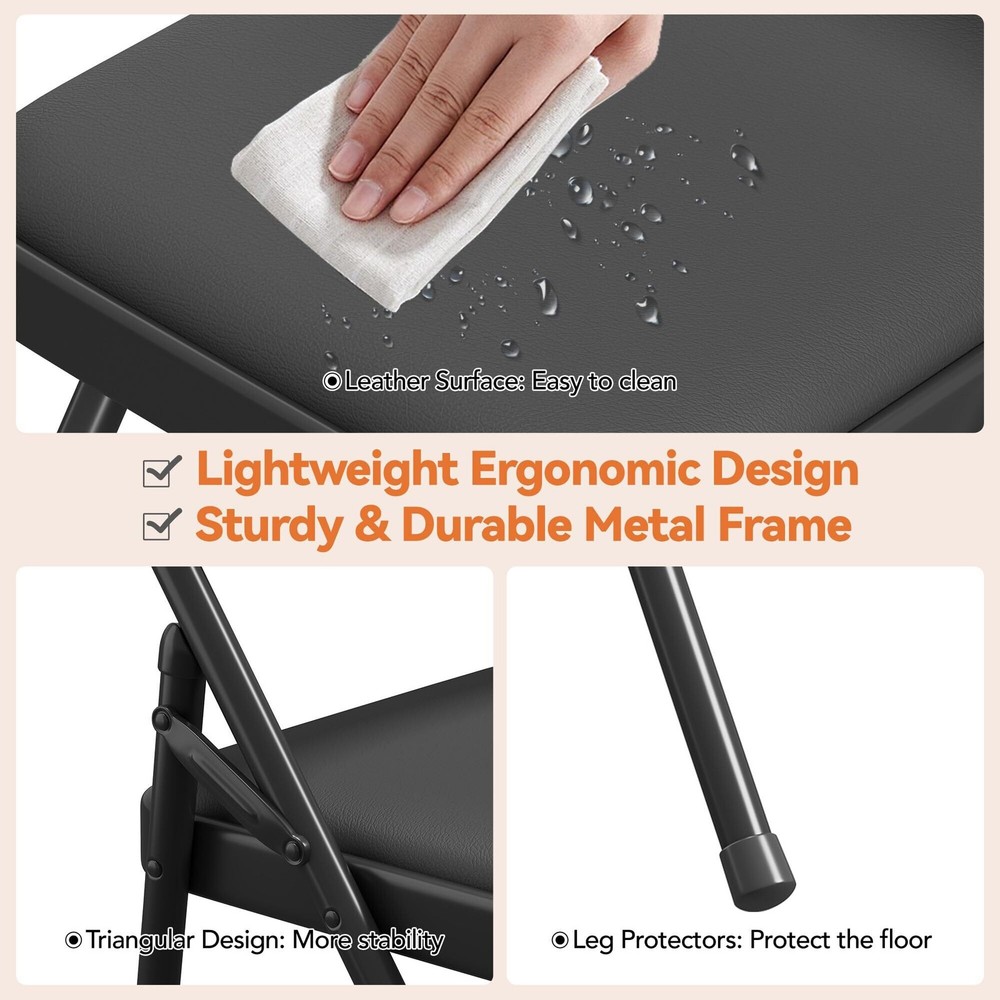 Easy to stack and carry: Smooth hinges make this portable folding chair easy to unfold and retract, and the four chairs take up little space when stacked, making them easy to carry on various occasions. Detailed design: Our Mute non-slip stacking chair has a hollow design above the backrest, which makes it easier and more comfortable for users to carry. The stable plastic foot pad makes the chair more non-slip and quieter and does not damage the floor and tiles, bringing users a more comfortable experience. 330LBS Weight Capacity: The party chair uses iron as the frame, high-quality density board as the base and folding chair cushion can bear 330 pounds, and high-fiber linen as the fabric is more wear-resistant, providing a comfortable seat for work, study, or activities. Vibrant Colors: Free Shipping Over $49.99* Details Folding Chairs 2 Pack, Metal Foldable Chair with Cushion and Non-Slip Feet Pads Product Description: Easy to stack and carrySmooth hinges make this portable folding chair easy to unfold and retract, and the four chairs take up little space when stacked, making them easy to carry on various occasions. Detailed designOur Mute non-slip stacking chair has a hollow design above the backrest, which makes it easier and more comfortable for users to carry. The stable plastic foot pad makes the chair more non-slip and quieter and does not damage the floor and tiles, bringing users a more comfortable experience. 330LBS Weight CapacityThe party chair uses iron as the frame, high-quality density board as the base and folding chair cushion can bear 330 pounds, and high-fiber linen as the fabric is more wear-resistant, providing a comfortable seat for work, study, or activities. Vibrant ColorsThe metal foldable chairs have three vivid colors---Dark Grey, Beige, and Dark Red. These classic and fashionable colors are perfect for decorating your home or meeting rooms, parties, and more. Don't Need InstallationNo need to install the folding chair, just unpack the package and use it, saving you a lot of time. If you have any questions, please feel free to contact us, and we promise to solve them for you within 24 hours.