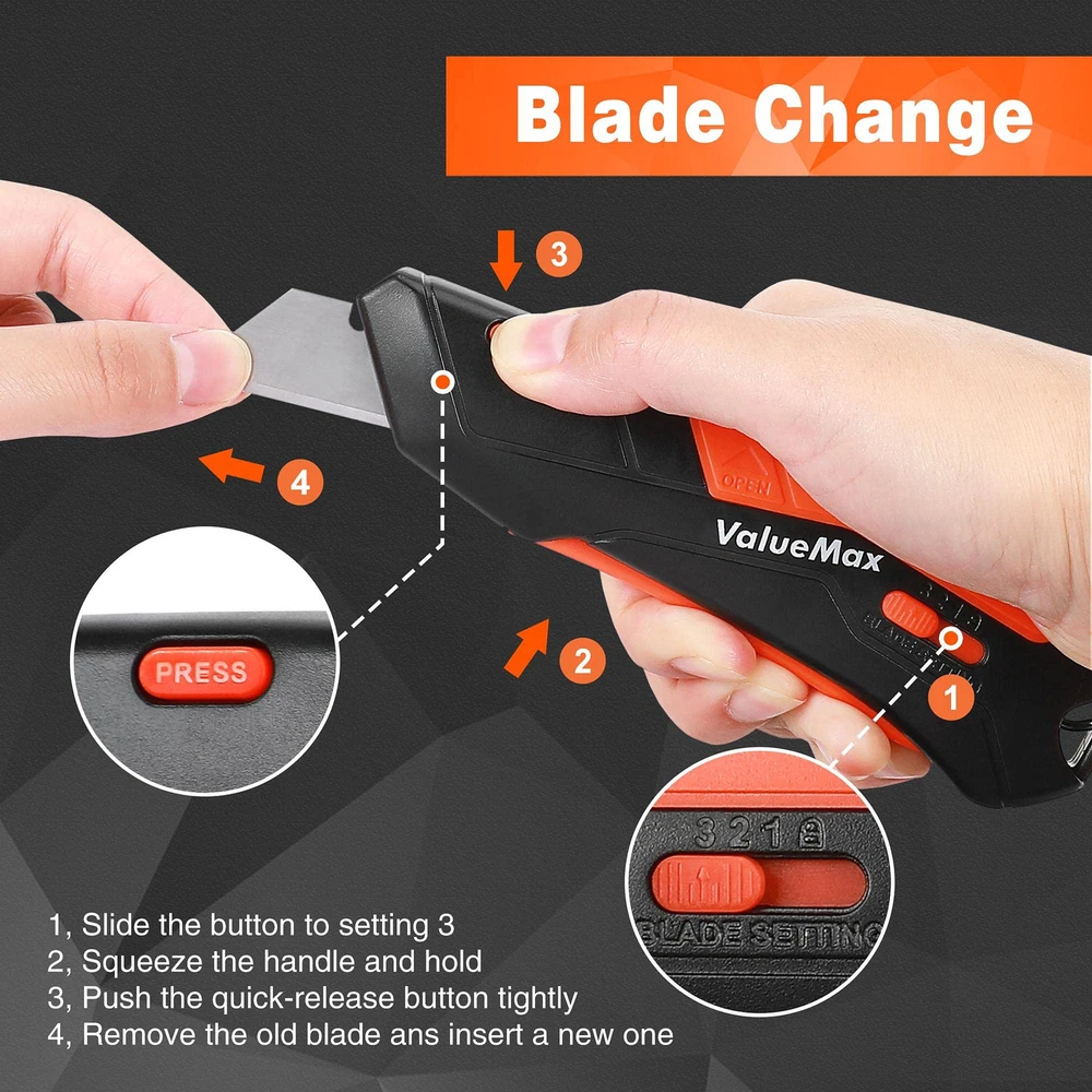3 Blade Depth: The versatile box cutter has three blade depth positions to increase efficiency; top cut, shallow tray cut and deep cut. Very safe for workers, teachers, students and other professionals. Left-Handed Friendly: The dual-sided edge guide enables left- and right-handed users to make quick, accurate top cuts and slide back into the locked position when the cut is complete. Perfect for Precision Cutting: Slice through cardboard, plastic straps, twine, carpet, rope, vinyl, or leather. Use for utility tools and precision cutting crafts or hobbies. Quick Release: Extend the blade, press the button, and reverse or switch. Comes with 10 heavy-duty reversible SK5 blades with replacement storage built right into the handle. What You Get: Coming with 2 box cutters knives and 18 blades included and holsters, lanyards. 180-degree rotating system lanyard for comfortable use. Ergonomically designed and easy to hold and grip.