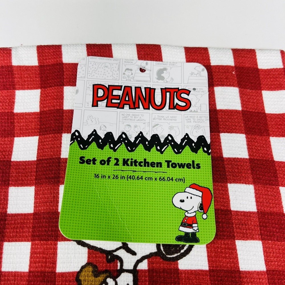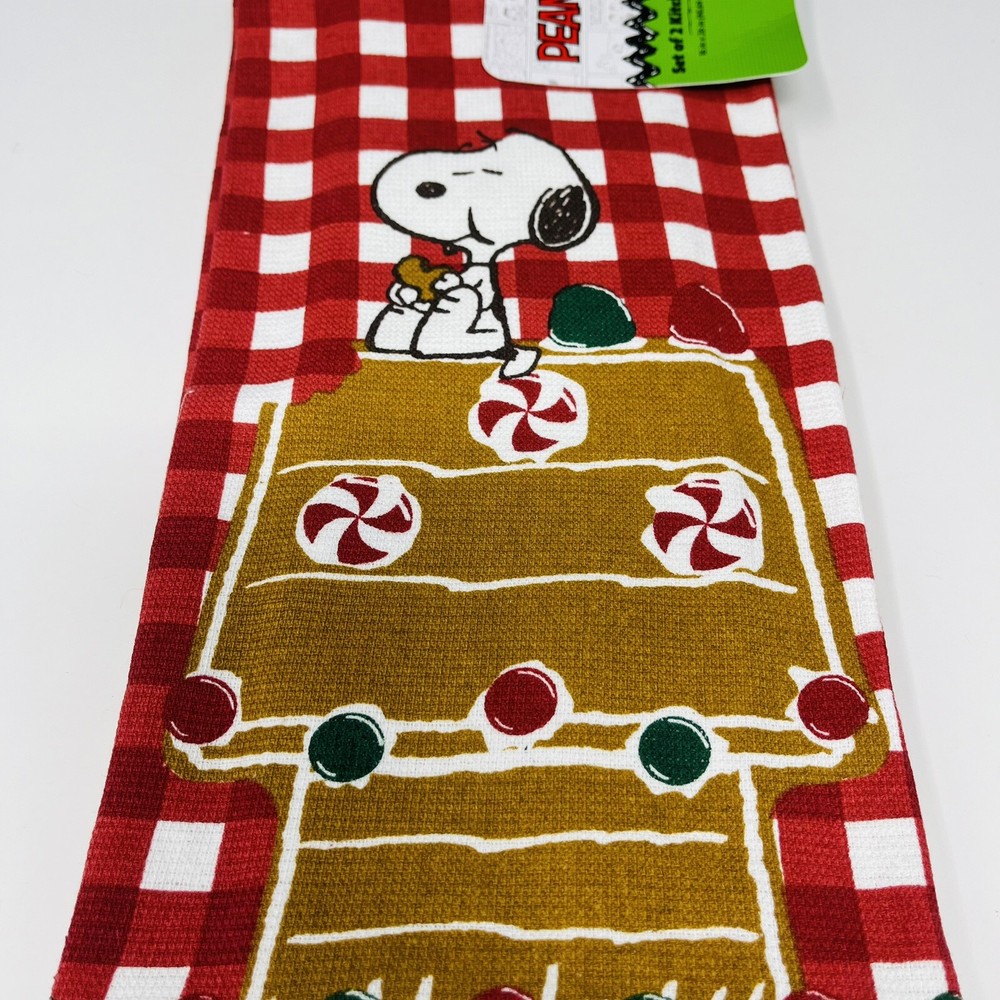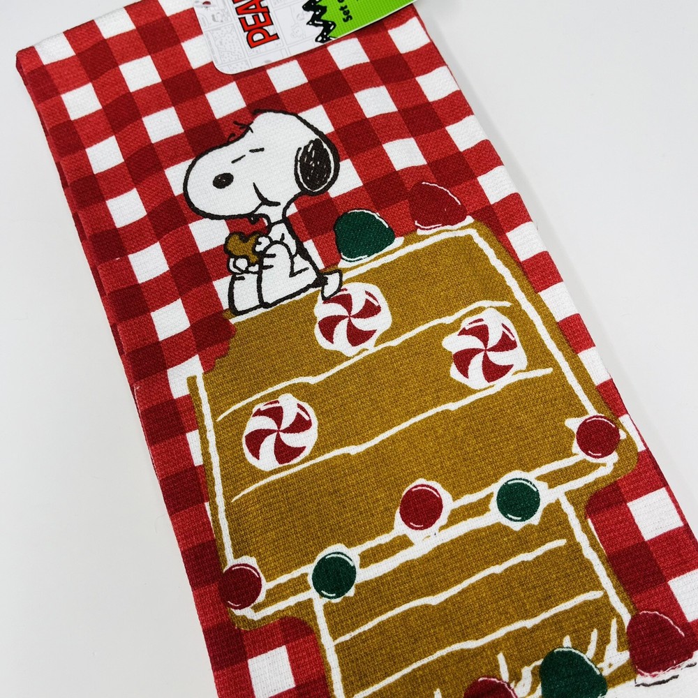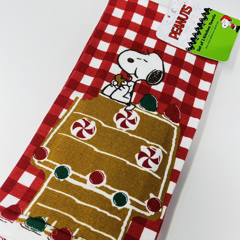 PEANUTS 2 Pack Hand Kitchen Towels Christmas Snoopy Gingerbread House Plaid Red
