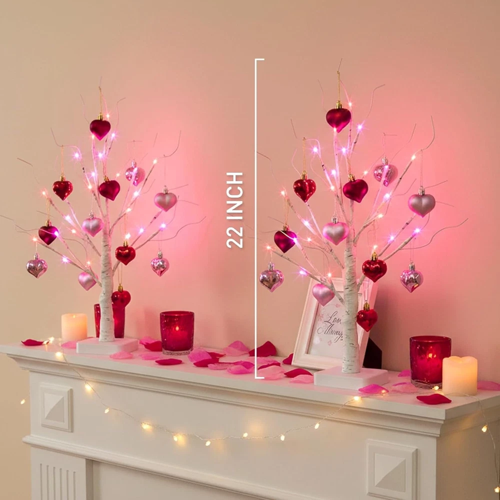 [Valentines Decorations for Home]:24" tall valentines decor birch tree light is embellished with 24 LED bulbs and12 pcs 1.8inch/4.5 cm heart ornaments,each valentines decor tree light is available in 2 different bulbs color (red and pink)and 2 surface style heart ornaments(3 red glossy surface & 3 red matte surface, 3 pink glossy surface & 3 pink matte surface), which is perfectly add more romantic and sweet atmosphere on valentine's day. USB and Battery Powered]:Each Valentines decor tree light provides with two power source options - USB or 3 pcs AA batteries (not included).Using USB interface to connect with power bank,laptop,socket,which can save your time and money.Using 3pcs AA batteries for freely moving the decoration.Attention Please:Please remove USB cable while using batteries in case of damage! [Adjustable Flexible Branches]:Satisfy your personal DIY need with the adjustable branches. you can adjust the shape of artificial valentines decor tree easily after receiving, making it the ideal natural tree shape.The base and branches of valentines birch tree are made of plastic,white branch and trunk are wrapped in electrical,there is an iron wire in each branch.this square base bottom is to ensure that the valentines light up tree stand stably. [Multi-color heart ornaments]:These heart shape ornaments is 4.5 cm in diameter very convenient to use as they come with pre-assembled with gold or silver threads, you can hang them on the branches, tree shirt, windows, Red wine bottle, door handles or other place you like.Add more sweet touch in your home decor!! [Wide range of application]: with a tinge of warmth and romance, the birch tree set is suitable for adorning Valentine's Day, anniversary, New Year and other holidays; besides, it also can be used as indoor decoration to beautify your home, adding fun to your life.