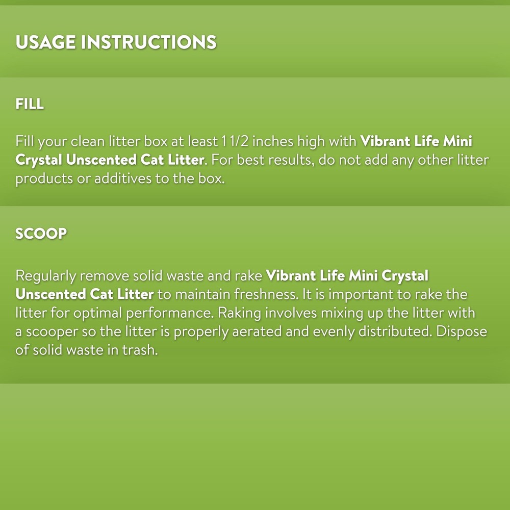 The Vibrant Life Mini Crystal Unscented Cat Litter absorbs and eliminate unwanted odors quickly. Our long-lasting, unscented mini crystal litter formula is low dust, fast absorbing, and gentle on kitty's paws. Simply fill your empty litter box with these mini crystals, just as you would use normal litter. Be sure to regularly remove solid waste and rake the crystals to maintain freshness and keep unwanted odors away. You can count on Vibrant Life Mini Crystal Unscented Cat Litter to keep you and your pet healthy and happy.Help your pets live the Vibrant Life! Vibrant Life Mini Crystal Unscented Cat Litter, 4 lb: Our products are specially crafted with one goal in mind, seeing your pet at its very best. With a variety of offerings designed to keep animals healthy, happy and energized, Vibrant Life stands out as the brand that truly puts your pet first. Unscented cat litter Long-lasting and fast-absorbing formula Low dust Gentle on paws Locks odors in seconds 4-lb bag