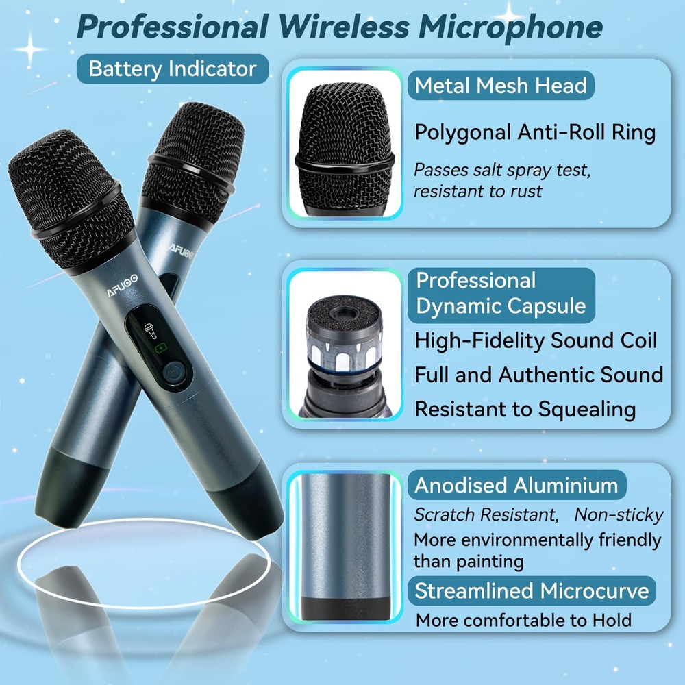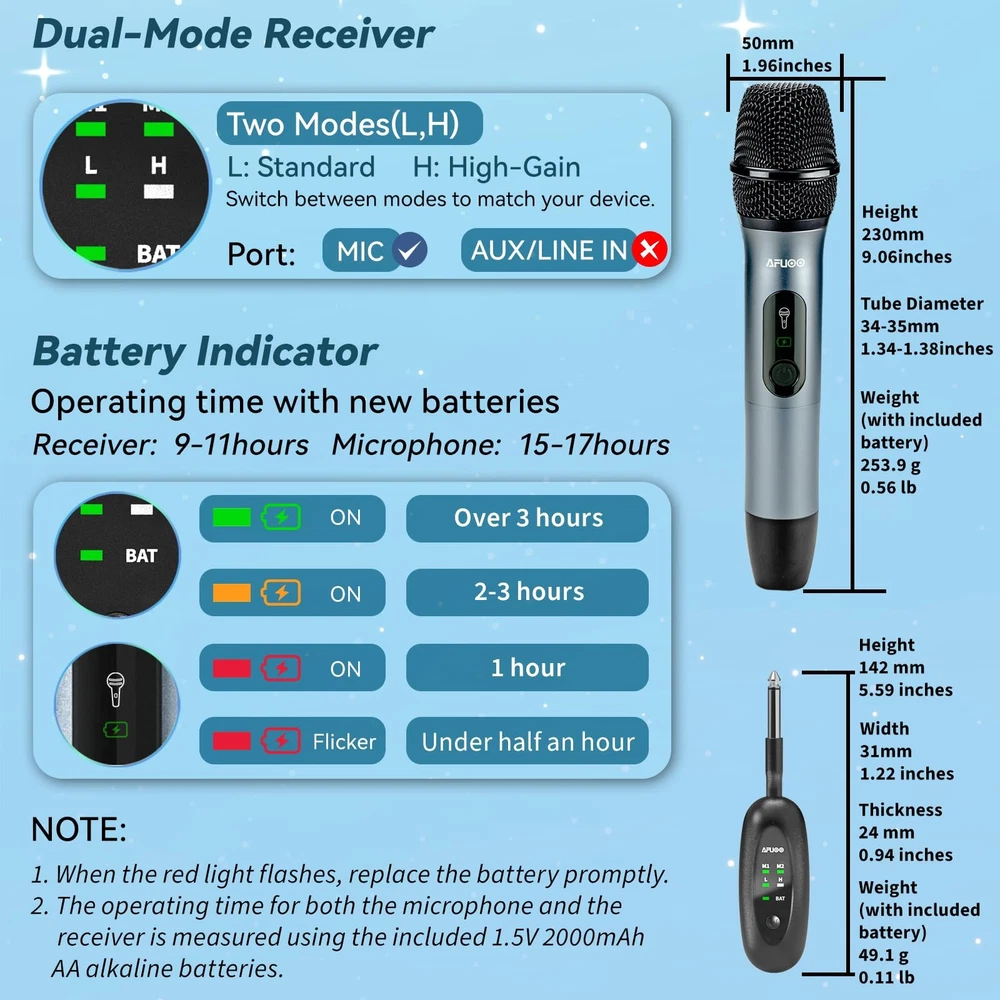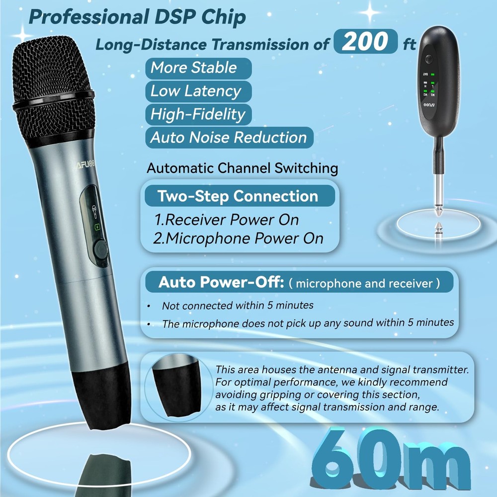 Wireless Microphone Set for Singing, Speeches & Events, 2.4GHz Dual-Mic Receiver, 200ft, Storage Bag Included, Metal Cordless Mic 2 Pack for Karaoke Machines, PA Systems, PartyBox, Gray-Blue 【Crystal Clear Voice】The wireless microphone system features advanced DSP technology and intelligent noise reduction, ensuring crystal-clear vocal clarity and a faithful reproduction of sound. Its smart anti-feedback technology allows it to be placed up to 1 meter away from the speaker without any feedback issues, providing an ultimate audio experience. Additionally, the proprietary tuning technology delivers a natural sound output, enhancing the authenticity of every note and allowing the true essence of the voice to shine through. 【Low Latency, Long-Range Transmission 】The professional wireless microphone system set utilizes advanced 2.4GHz transmission technology, offering strong interference resistance and low latency. With a maximum transmission distance of 200 feet (60 meters), the 2 mics pack delivers high-fidelity sound. This ample range ensures that you can perform freely during singing, speeches, karaoke, or events, without the constraints of distance. 【All AA Battery Design】 Safe, Convenient, and Long-Lasting. Each wireless karaoke microphone operates on two AA batteries, providing a runtime of 15 to 17 hours. The dual-microphone receiver is powered by one AA battery, offering a runtime of 9 to 11 hours. These figures are based on the included 1.5V 2000mAh alkaline batteries; actual runtime may vary with different battery types. The professional wireless mic set recommends using 1.5V 2000mAh alkaline batteries for optimal performance. Please note that the included five AA batteries are non-rechargeable. 【Premium Construction】The wireless microphone is elegantly constructed from anodized aluminum, ensuring scratch resistance and durability with a refined, non-slip finish. Its streamlined, curved design enhances grip comfort, delivering a luxurious and sophisticated feel for an exceptional performance experience. 【Durable Rubber Connector】The dual-microphone receiver features a one-piece molded rubber design at the plug connection, making it more durable than traditional plugs. It withstands over 5,000 bends without any degradation. The elongated plug easily fits into tight spaces, ensuring that you can connect the wireless microphone receiver without hassle. Additionally, the receiver offers two gain modes, allowing you to adjust the gain settings before using the wireless microphone system to achieve the desired audio effect. 【Instant Connection, Plug and Play】Simply power on the wireless microphone and dual-microphone receiver, and they will automatically connect using advanced auto-channel-switching technology—no manual channel adjustments needed, saving you time and effort. Please note that the wireless microphone receiver only supports mic input and does not accommodate aux or line-in connections. 【Versatile Applications】The W60 Pro wireless microphone set comes complete with two wireless microphones and a dual-mic receiver (6.35mm), along with a 3.5mm adapter for versatile compatibility with karaoke machines, PA systems, mixers, amplifiers. This dynamic wireless microphone is perfect for singing performance, karaoke, DJ performances, speeches, weddings, and parties, allowing you to unleash your passion and energy in any setting. 【Notice】The W60 Pro wireless microphone 2 pack, equipped with a dual microphone receiver, supports only microphone input interfaces. It does not support auxiliary (AUX) input or line input. Additionally, please note that the W60 Pro is not compatible with PC or Mac devices. Step up your performance game with the Professional Wireless Microphone Set. This comprehensive package includes everything you need to take the stage confidently. With 2 mics, a dual-mics receiver with an extended working range(200ft), you are set for long performances. W60 Pro Professional Wireless Microphone Set is powered by AA alkaline batteries, which are safer, faster and more convenient than lithium batteries. Each wireless microphone requires two AA batteries for 15-17 hours of use, while the dual microphone receiver requires only one AA battery for 9-11 hours of use. W60 Pro Professional Wireless Microphone Set is powered by AA batteries, which ensures plenty of use time, allowing you to sing along throughout the entire show without fear of battery anxiety. The robust metal karaoke wireless microphones and durable receiver resist daily wear and tear. Enhanced with professional DSP noise reduction technology, the W60 Pro wireless mics set deliver crystal clear and authentic audio, making your singing, speeches, and hosting & more than events genuinely captivating. The two mics receiver's two modes adapt to different audio devices, ensuring seamless compatibility. Experience the charm of duet singing with the dual microphone system. The wireless microphone set W60 Pro comes with a convenient storage bag, providing a high-quality wireless audio experience. Choose wireless microphone W60 Pro for a dynamic and reliable audio experience. Shipping We offer FREE shipping on all orders! We ship within Three business days of payment, usually sooner. We use a selection of shipping services such as UPS, FedEx, USPS etc. We only ship to the lower 48 states, no APO/FPO addresses or PO Boxes allowed. Local pickups and combined shipping options are not provided at this time. Return You can return a product for up to 30 days from the date you purchased it. Any product you return must be in the same condition you received it and in the original packaging. Please keep the receipt. Payment We accept payment by any of the following methods: PayPal Please pay as soon as possible after winning an auction, as that will allow us to post your item to you sooner! Feedback Customer satisfaction is very important to us. If you have any problem with your order, please contact 