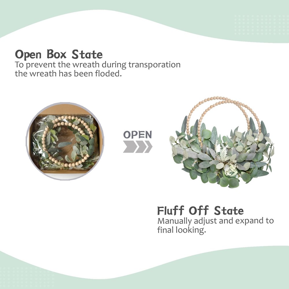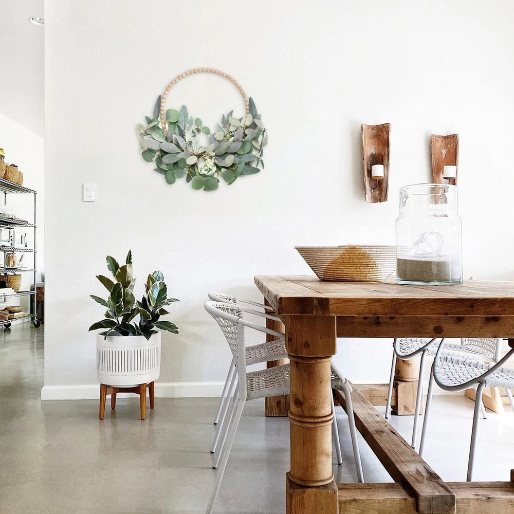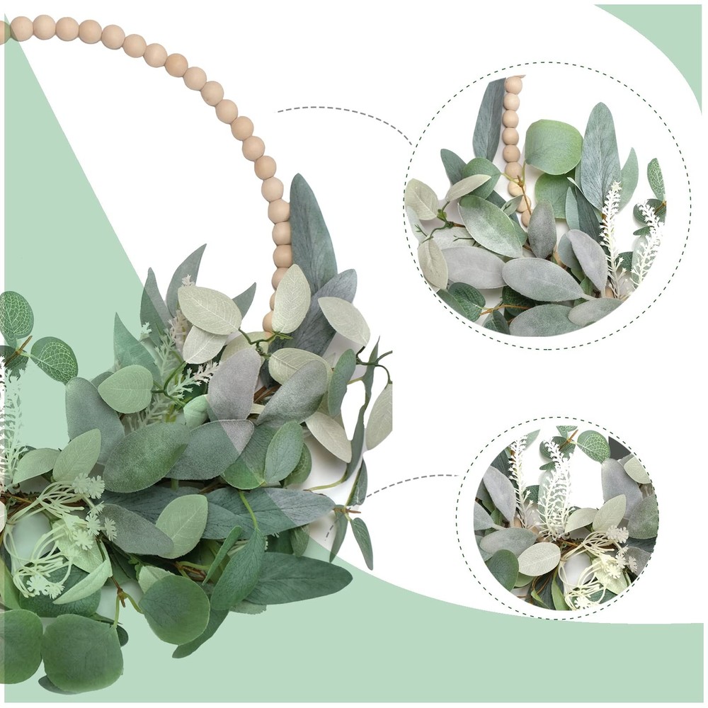 Spring/Summer Wreath DESIGN FEATURES: 16-inch wooden bead wreath paired with artificial eucalyptus leaves creates an elegant and natural-looking door decoration VERSATILE DECOR: Perfect for front door, wall, mantel, or window display during spring, holidays, or year-round home decoration.You can also diy and add your favorite elements to create your own wreaths DUAL WREATH SET: Includes two matching wreaths, offering excellent value and allowing for coordinated decorating throughout your space MAINTENANCE FREE: Artificial eucalyptus leaves maintain their fresh appearance without watering or upkeep, perfect for lasting seasonal decor RUSTIC CHARM: Natural-looking wooden beads combined with lifelike greenery bring farmhouse-style warmth to any indoor or outdoor setting