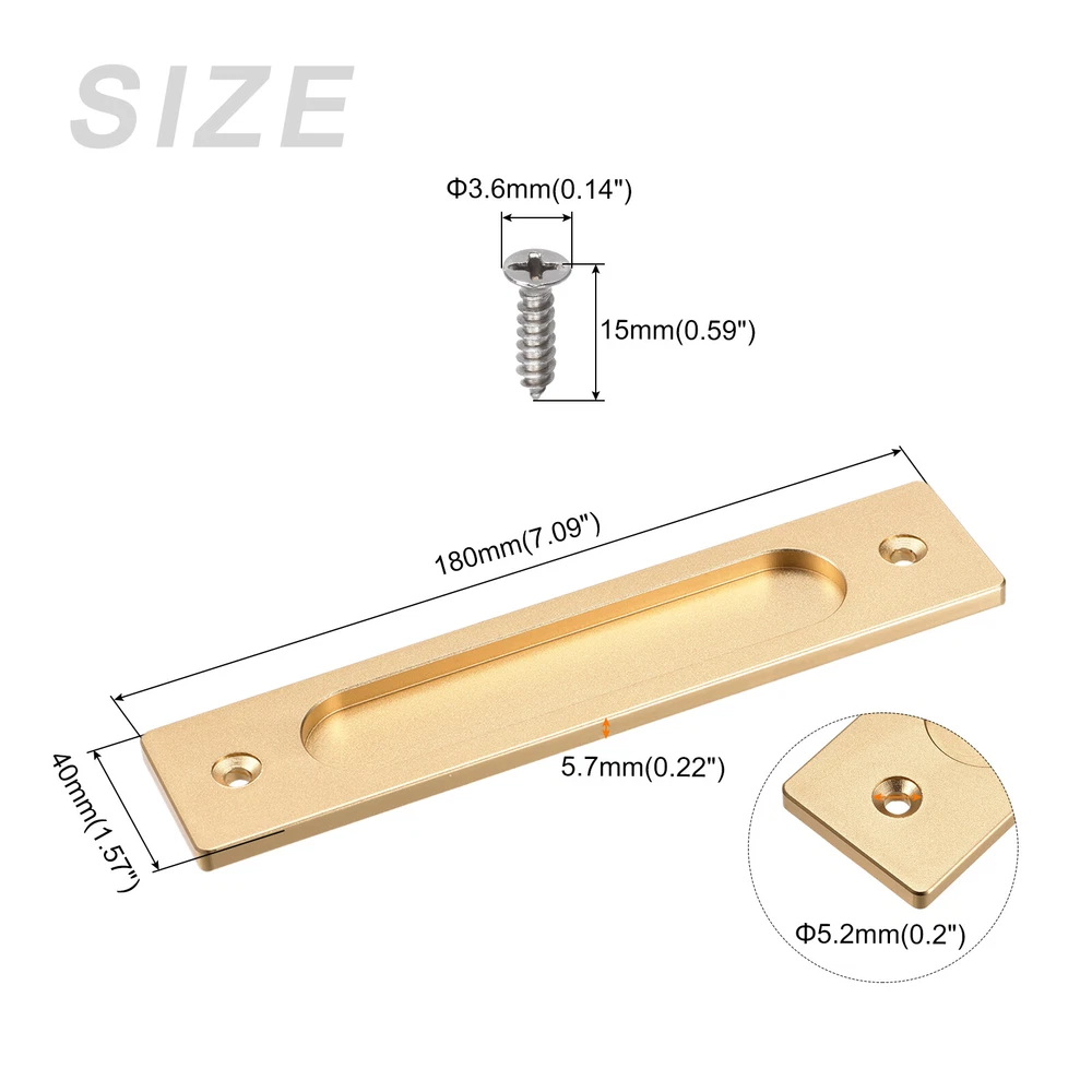 Document APPLY TO - Can be used in kitchen, living room, bedroom, bathroom, dining room and other home scenes, suitable for sliding doors, drawer doors, barn doors, pocket doors, etc.SPECIFICATION:Overall Dimensions: 180mm(L)x40mm(W)x5.7mm(H)/7.09"x1.57"x0.22"Mounting Hole Dia: 5.2mm(Dia)/0.2"Screw Size: 3.6(Dia)x15mm(L)/0.14"x0.59"QUANTITY INCLUDED - 2pcs x Door Finger Pull; 4pcs x Mounting Screws.ADVANTAGE - Zinc alloy material with anodic oxidation, corrosion resistance, non fading, good rigidity, durable, easy to clean.INSTALL: Manually or with a power tool using a Phillips screwdriver. Each product contains 2 screws. 2Pcs 180mm Sliding Door Finger Handle Zinc Alloy w Screw Dark Gold Rectangle APPLY TO - Can be used in kitchen, living room, bedroom, bathroom, dining room and other home scenes, suitable for sliding doors, drawer doors, barn doors, pocket doors, etc. SPECIFICATION: Overall Dimensions: 180mm(L)x40mm(W)x5.7mm(H)/7.09"x1.57"x0.22" Mounting Hole Dia: 5.2mm(Dia)/0.2" Screw Size: 3.6(Dia)x15mm(L)/0.14"x0.59" QUANTITY INCLUDED - 2pcs x Door Finger Pull; 4pcs x Mounting Screws. ADVANTAGE - Zinc alloy material with anodic oxidation, corrosion resistance, non fading, good rigidity, durable, easy to clean. INSTALL: Manually or with a power tool using a Phillips screwdriver. Each product contains 2 screws. Hot Item Payment 1.We accept eBay payment . 2.Payment must be received within 7 business days of auction closing. Shipping 1.We ship to your eBay or Paypal address. Please make sure your eBay and Paypal address is correct before you pay. 2.Items will be shipped within 1-3 business day when we received payment. 3.Delivery time depends on destination and other factors. Description Policy 2Pcs 180mm Sliding Door Finger Handle Zinc Alloy w Screw Dark Gold Rectangle APPLY TO - Can be used in kitchen, living room, bedroom, bathroom, dining room and other home scenes, suitable for sliding doors, drawer doors, barn doors, pocket doors, etc. SPECIFICATION: Overall Dimensions: 180mm(L)x40mm(W)x5.7mm(H)/7.09"x1.57"x0.22" Mounting Hole Dia: 5.2mm(Dia)/0.2" Screw Size: 3.6(Dia)x15mm(L)/0.14"x0.59" QUANTITY INCLUDED - 2pcs x Door Finger Pull; 4pcs x Mounting Screws. ADVANTAGE - Zinc alloy material with anodic oxidation, corrosion resistance, non fading, good rigidity, durable, easy to clean. INSTALL: Manually or with a power tool using a Phillips screwdriver. Each product contains 2 screws. Hot Item Payment 1.We accept eBay payment . 2.Payment must be received within 7 business days of auction closing. Shipping 1.We ship to your eBay or Paypal address. Please make sure your eBay and Paypal address is correct before you pay. 2.Items will be shipped within 1-3 business day when we received payment. 3.Delivery time depends on destination and other factors.
