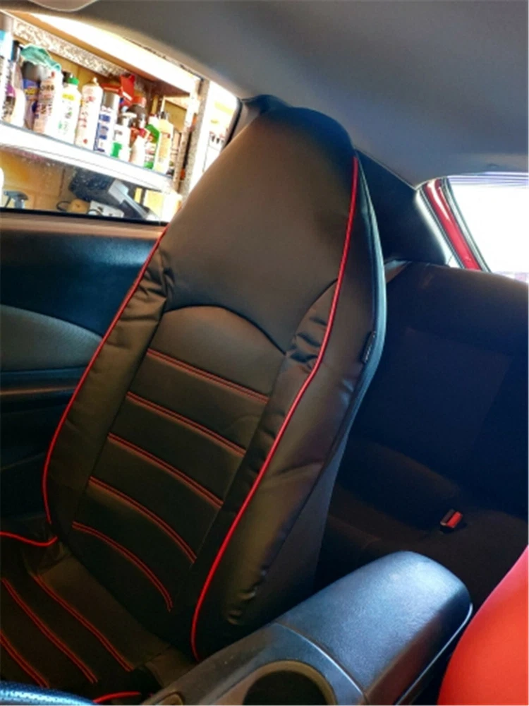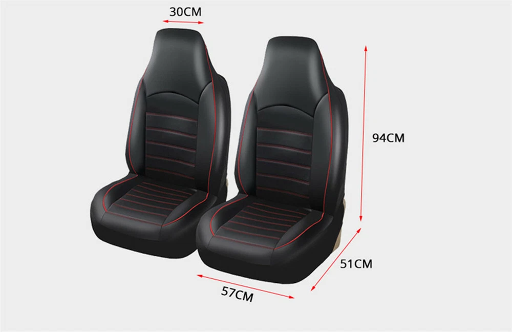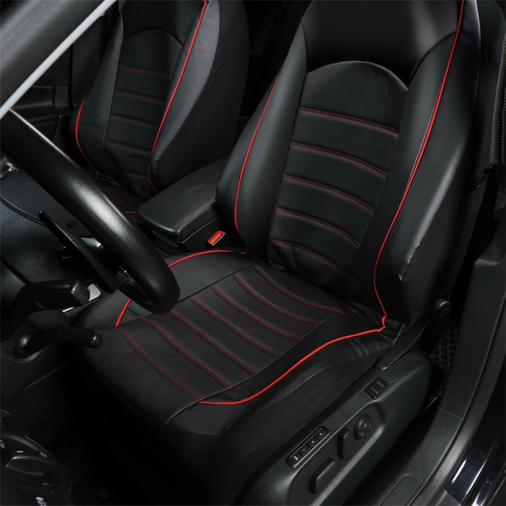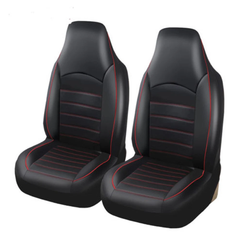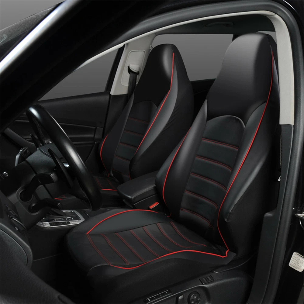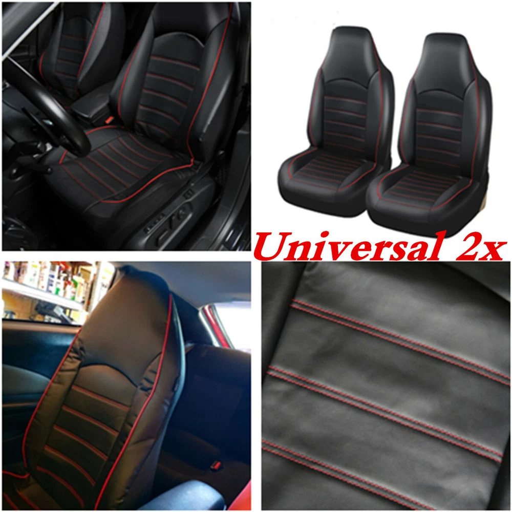 Details Seat Covers Car Front Cushion Protector High Back Bucket Black Leather Universal Items Description: PROTECTION - the seat cover protects your car seat against spills, dirt, moisture, sweat and other unaesthetic things. The seat cover will blend nicely into any car and will not clash to the interior as it is colored in classic black+red. UNIVERSAL FIT - the seat cover fits almost all seats from cars, Trucks, Vans, & SUV. Product Features: Features innovative fabric and design Updates the appearance of old or dirty seats Protects against splits, stains, fading, dirt, and pet hairs Easy to install and fits most bucket seats One-piece seat cover Fits most sedans and SUVs with standard seats Fits bucket seats with adjustable head rests The package includes: 2PCS