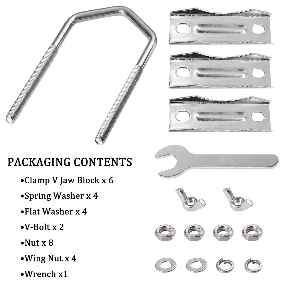 ★Color:Silver. ★Package Contents:2xDouble Antenna Mast Clamp. ★Accessories Include:Clamp V Jaw Block x 6 ; V-Bolt x 2 ; Nut x 8 ; Spring Washer x 4 ; Flat Washer x 4;Butterfly buckle x 4;Wrench x 1. ★This mast mounting clamp is designed to hold most Wifi, PCS, cellular, TV Antennas, CB, Ham, pipe, flag pole, torches, umbrella, parasols, fishing rods. ★Our Promise:If you have any questions about the products or services, please contact us and we will help you. ★PLEASE NOTE: 1. The dimensions are measured manually, there may be some errors, please understand. 2. The different shooting light may cause a slight difference between the color of the object in the picture and the actual object. ★SIZE→ The V-bolt is 5.9"/15CM long, 2"/5.2CM wide, 0.2"/0.5CM thick, and the Jaw Block is 0.04"/0.1CM thick. ★CLAMPABLE RANGE→ The maximum diameter of the clampable round pipe is about 5.0CM/2.0 inches. The maximum diameter of the clip-on square tube is approximately 5.2 cm / 2.0 inches. ★WIDELY USED→ This mast mounting clip design is ideal for supporting TV antennas, TV dividers, cellular, wifi, PCS, ham, garden parasols, flagpoles, torches, fishing rods, pipes, etc. Suitable for building roof or wall, deck, balustrade, balustrade or fence. ★3 ASSEMBLE SETUP OPTIONS→The antenna pipe clamp kit is great for mounting round pipe to another round pipe, square railings to another square railings, or mounting round pipe to square railings. ★MATERIAL→ Heavy duty antenna mast clamps are made of galvanized iron with a rust resistant coating for durability, rust and wear resistance. Can be applied to indoor and outdoor for a long time.