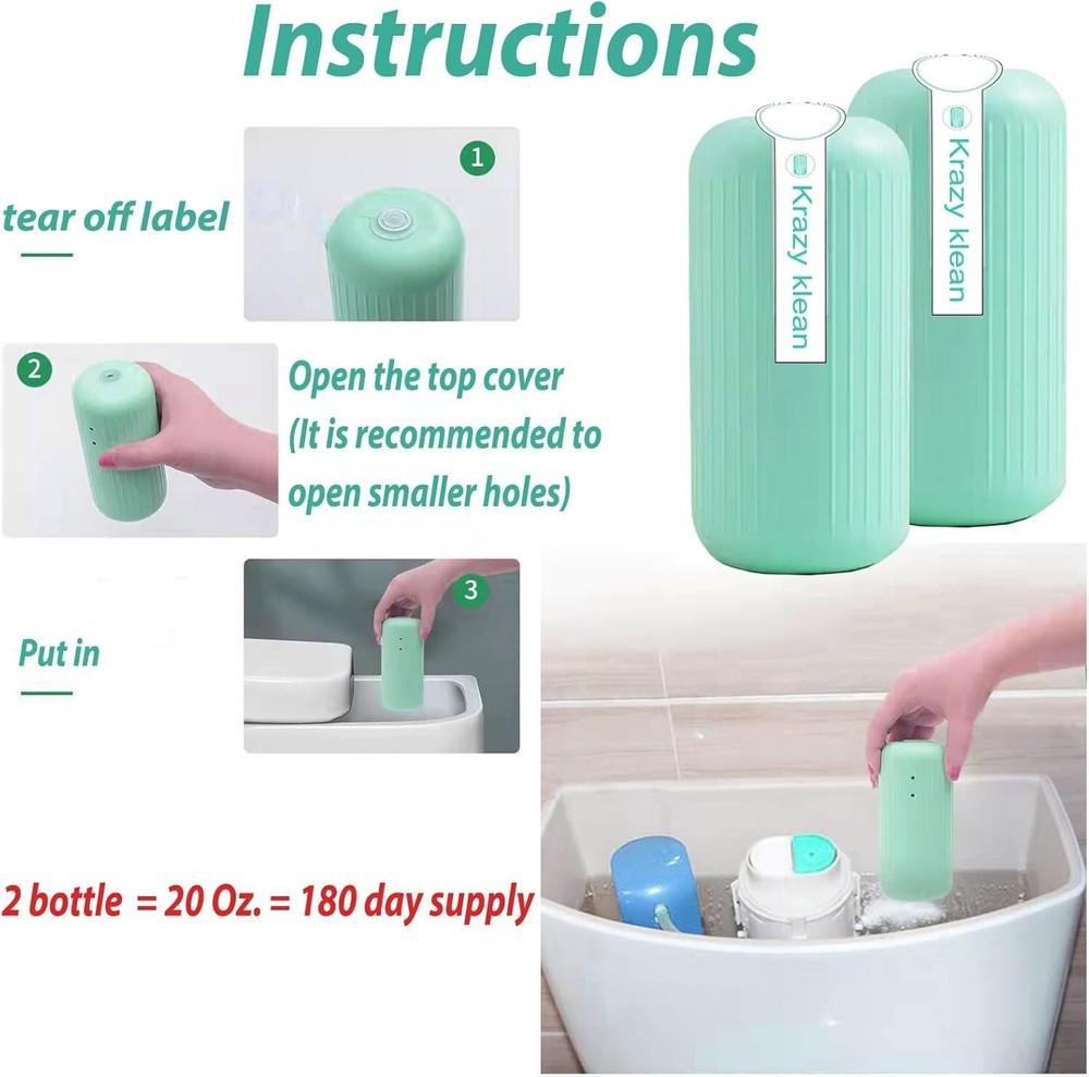 2Pcs Krazy Klean Toilet Cleaner, 180 Days Of Supply, Deep Cleaning, Fresh Toilet Deep Cleaning- automatic toilet cleaner provides deep kleaning. Looking Fresh-1 bar equals 90 days of supply, 2 bar equal 180 days of supply. and enjoy a fresh and klean bathroom at all times. Easy to use-Simply place the automatic toilet cleaner in the toilet's reservoir and it will start working every time you flush the toilet. Safety Information Keep Out of Reach of Children and Pets. Directions 1.Tear off label. 2.Open the top cover (It is recommended to open smaller holes). 3.Put in.