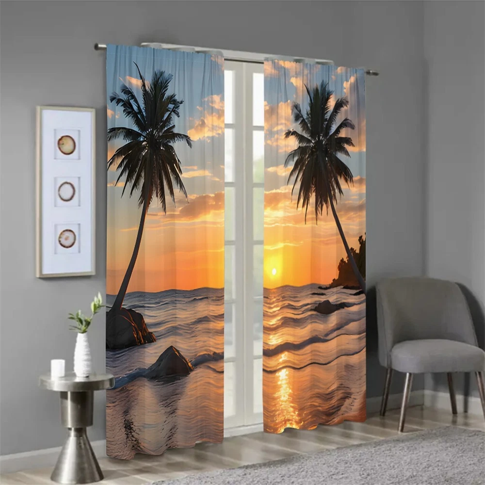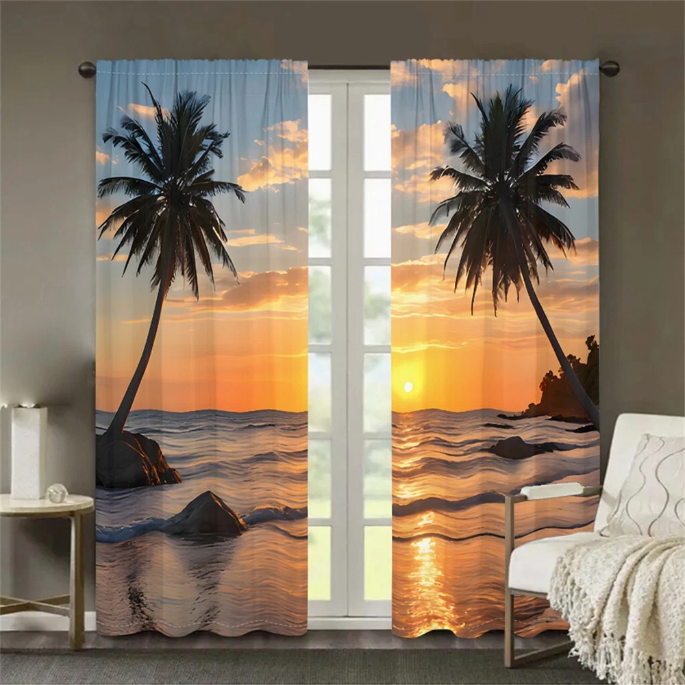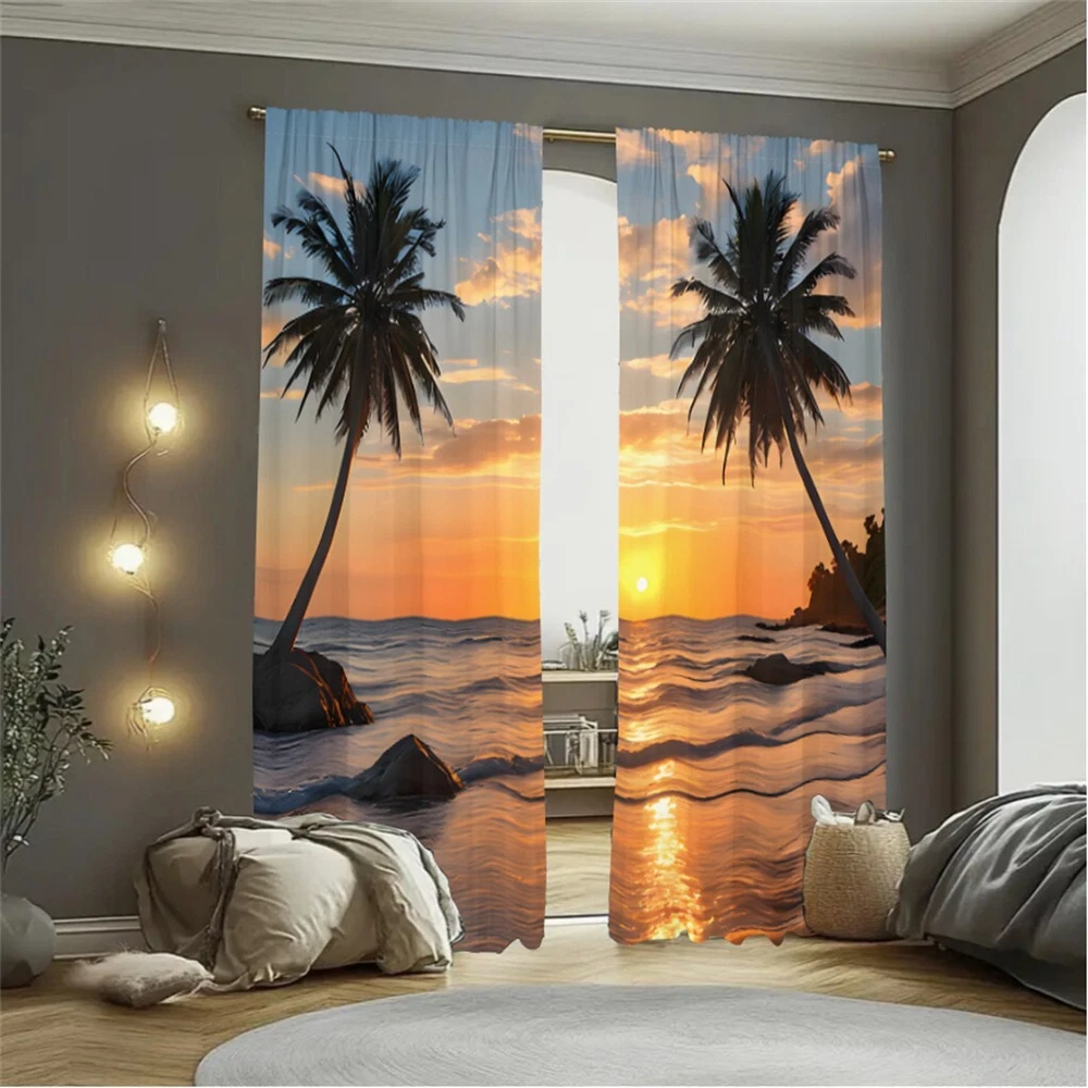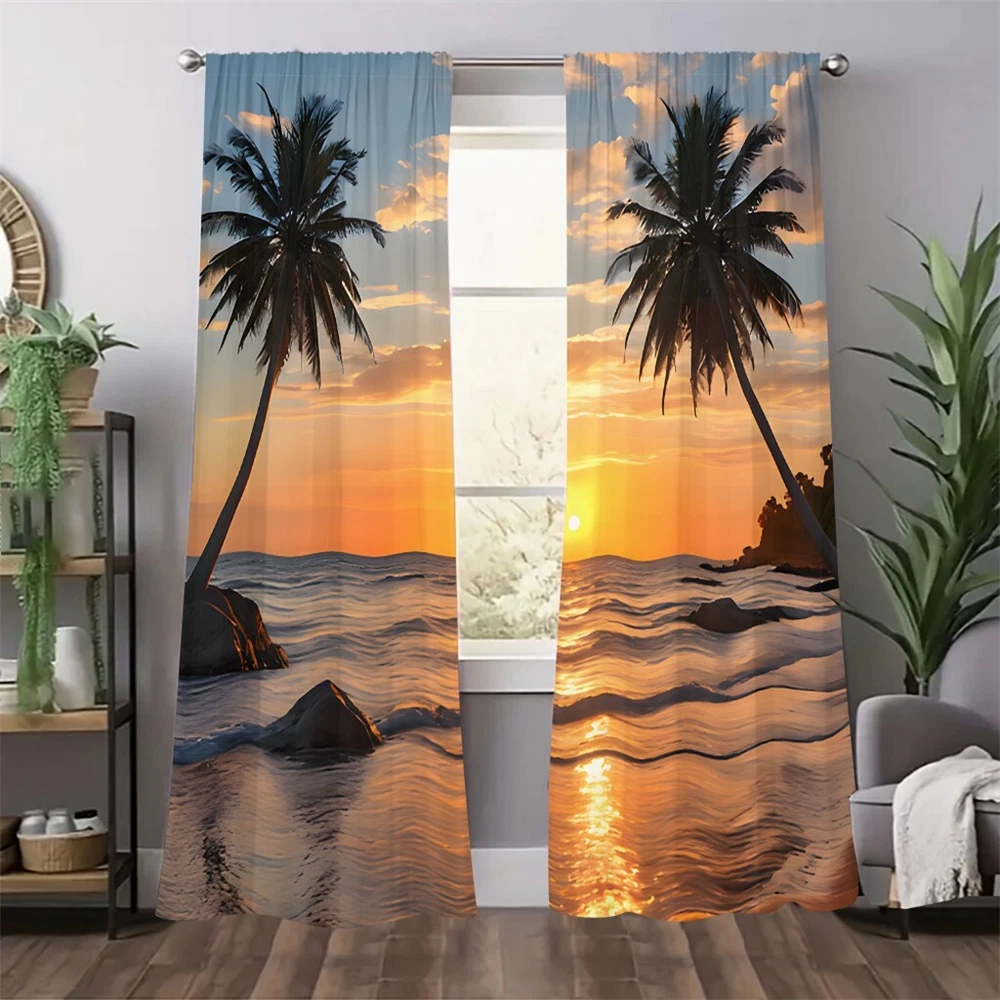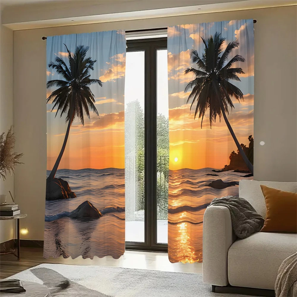 2Pcs Tropical Palm Tree Sunset Beach Curtains for Living Room Bedroom Kitchen