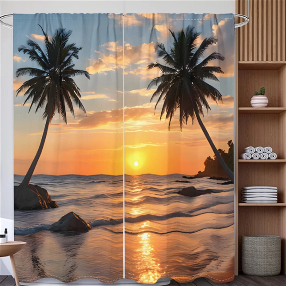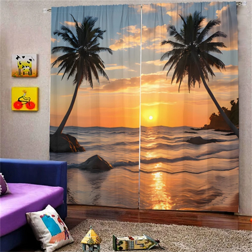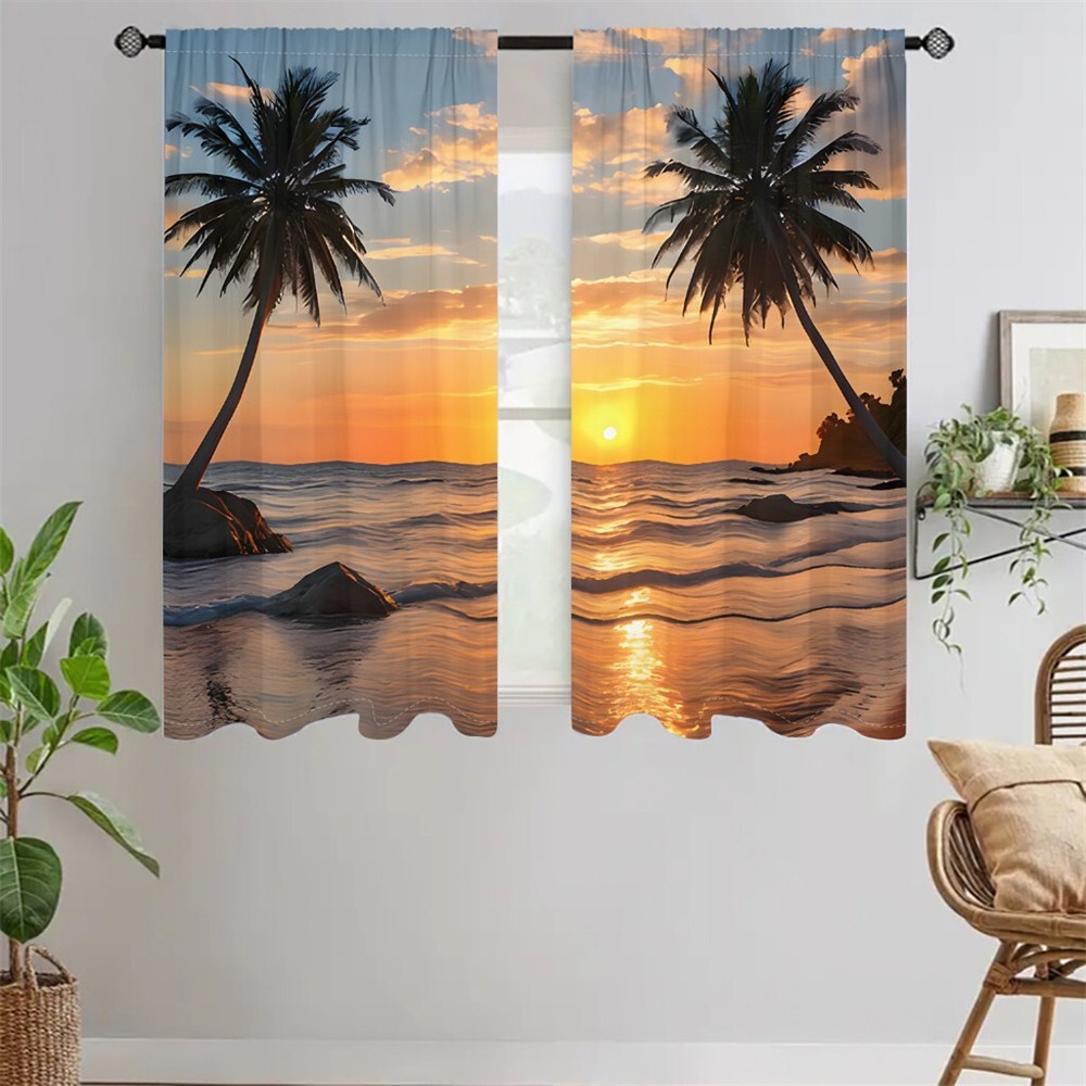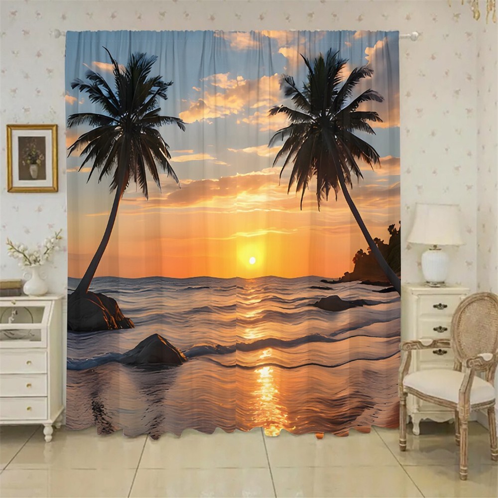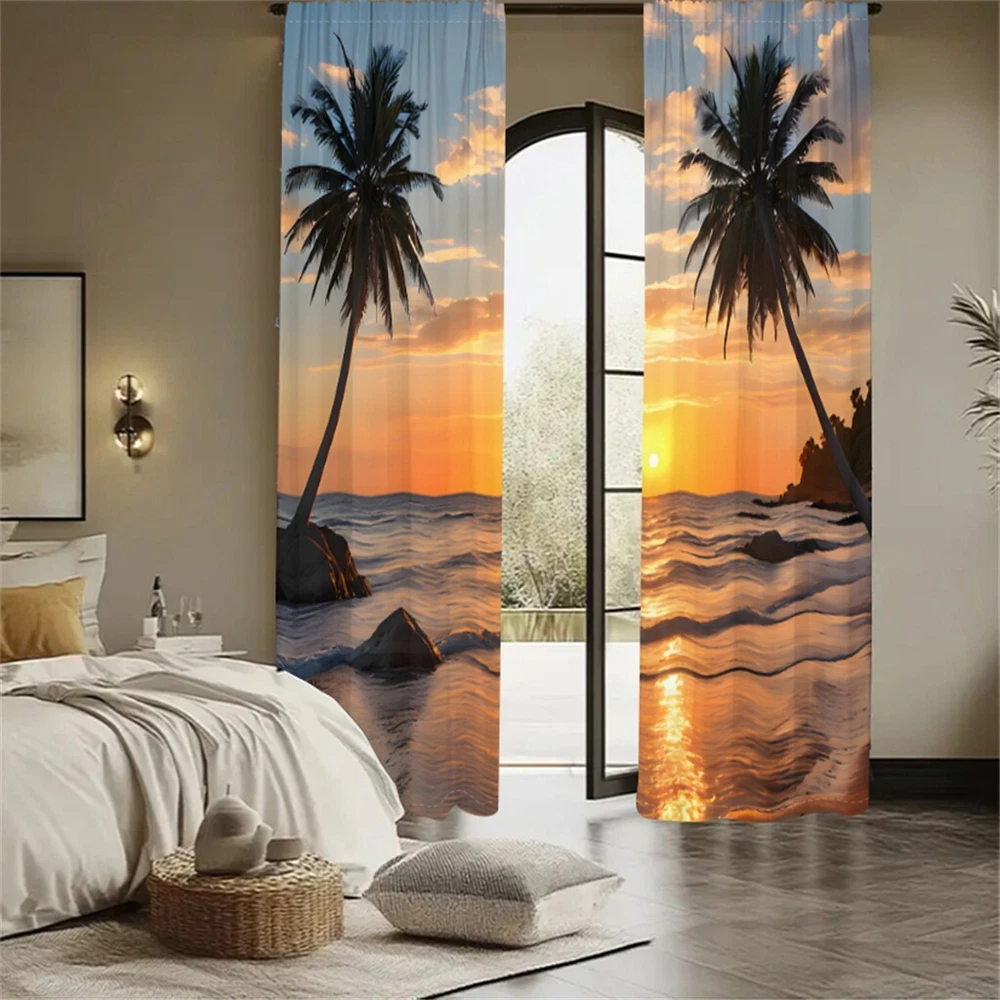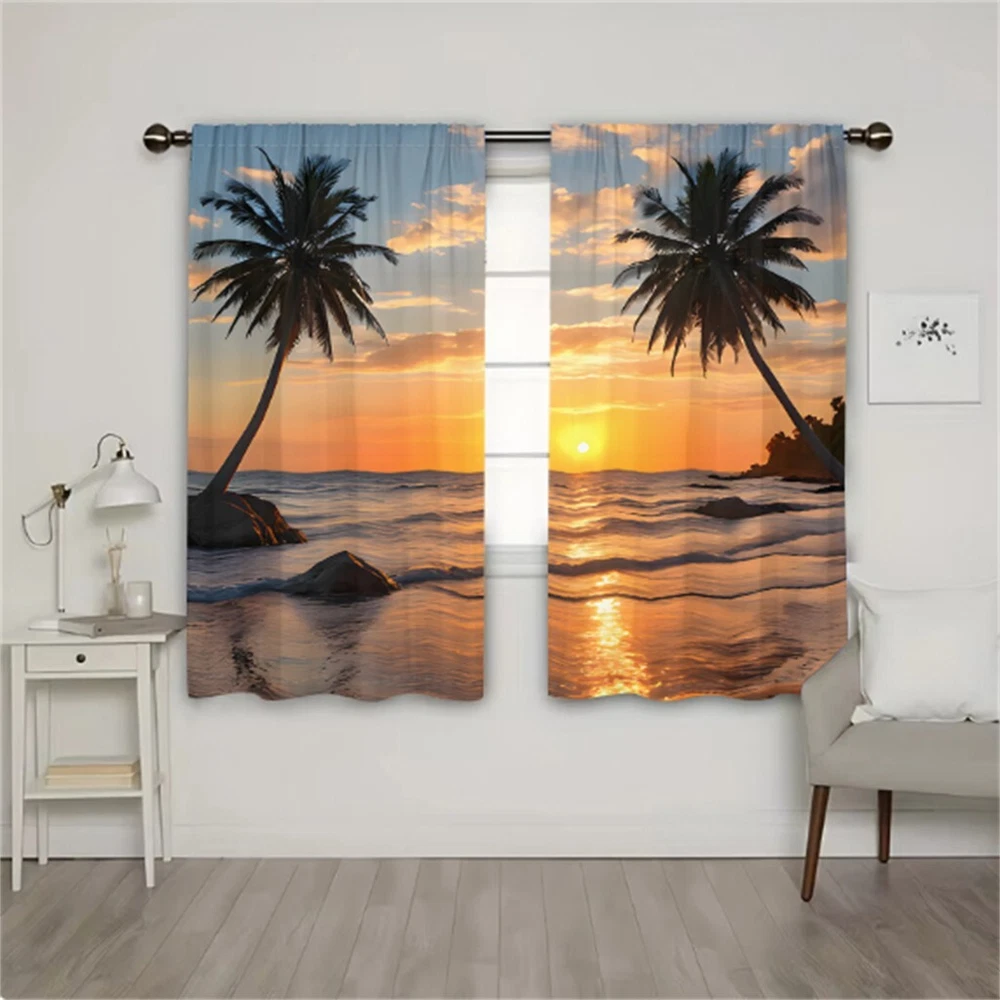 2Pcs Tropical Palm Tree Sunset Beach Curtains for Living Room Bedroom Kitchen