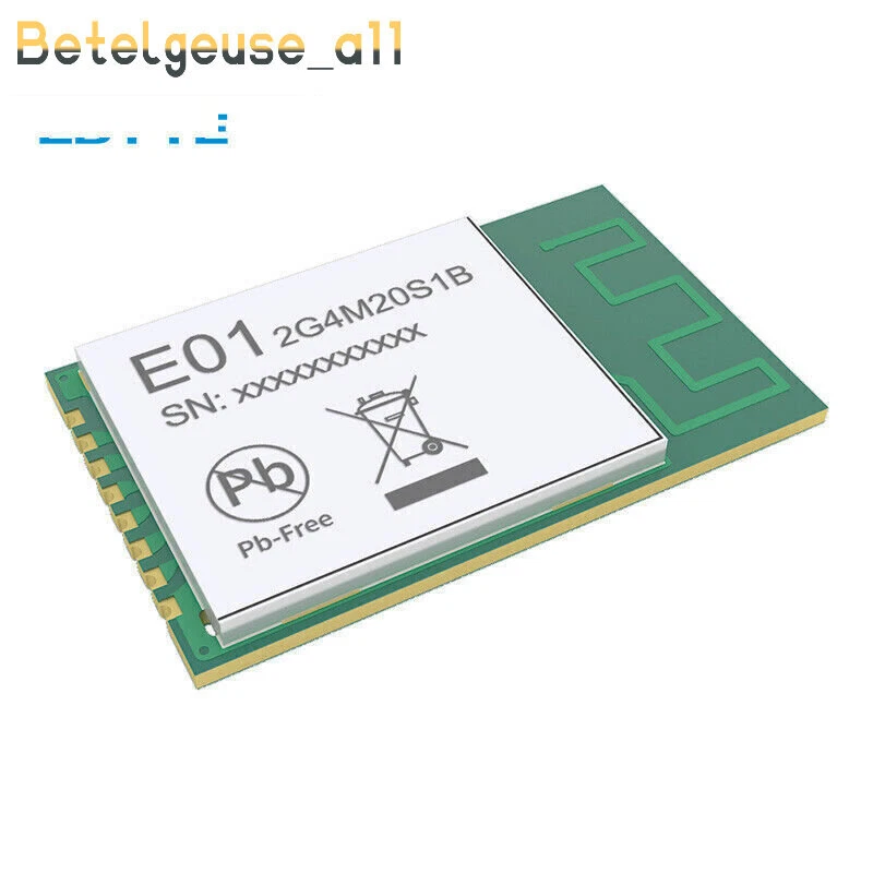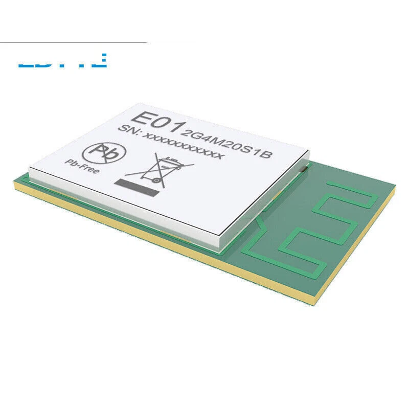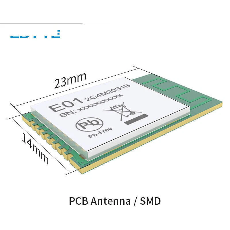 2.4GHz SMD Wireless IoT Transceiver Module 20dBm PCB Antenna nRF24L01 PA LNA Main parameter Description Remark Voltage supply 0~3.6V Voltage over 3.6V will cause permanent damage to module Blocking power -10dBm Chances of burn is slim when modules are used in short distance Working temperature -40 ~85℃ - Distance 800m in open and clear air, at height of 2.5m,air data rate:250kbps FIFO 32Byte Max packet length per time Crystal Frequency 16MHz - Modulation GFSK - Package SMD - Connector Half hole 1.27mm - Communication interface SPI 0-10Mbps Size 23 * 14mm with PCB antenna Antenna PCB antenna 50 ohm impedance match Electronic parameter Min. Typ. Max. Unit Condition Operating voltage 2.0 3.3 3.6 V ≥3.3 V ensures output power Communication level - 3.3 - V For 5V TTL, it may be at risk of burning down TX current - 135 - mA Instant power consumption RX current - 20 - mA - Sleep current 19 19.5 20 μA Software is set 0dBm, built-in pa