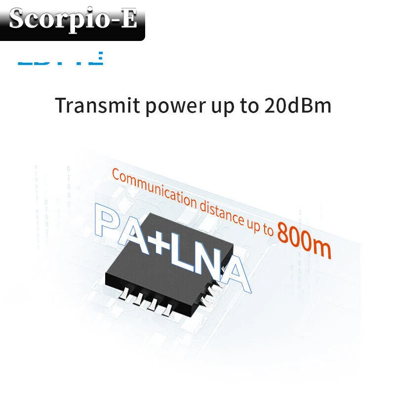 2.4GHz SMD Wireless IoT Transceiver Module 20dBm PCB Antenna nRF24L01 PA LNA Main parameter Description Remark Voltage supply 0~3.6V Voltage over 3.6V will cause permanent damage to module Blocking power -10dBm Chances of burn is slim when modules are used in short distance Working temperature -40 ~85℃ - Distance 800m in open and clear air, at height of 2.5m,air data rate:250kbps FIFO 32Byte Max packet length per time Crystal Frequency 16MHz - Modulation GFSK - Package SMD - Connector Half hole 1.27mm - Communication interface SPI 0-10Mbps Size 23 * 14mm with PCB antenna Antenna PCB antenna 50 ohm impedance match Electronic parameter Min. Typ. Max. Unit Condition Operating voltage 2.0 3.3 3.6 V ≥3.3 V ensures output power Communication level - 3.3 - V For 5V TTL, it may be at risk of burning down TX current - 135 - mA Instant power consumption RX current - 20 - mA - Sleep current 19 19.5 20 μA Software is set 0dBm, built-in pa