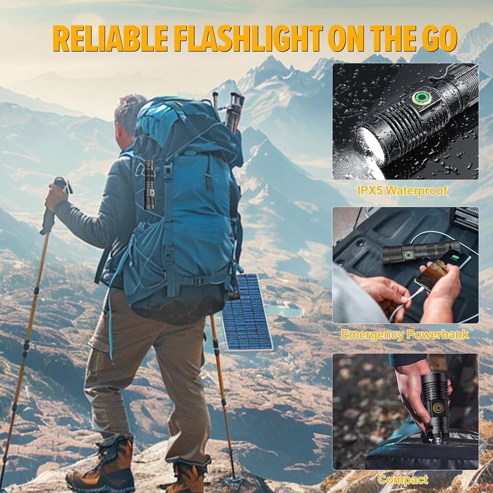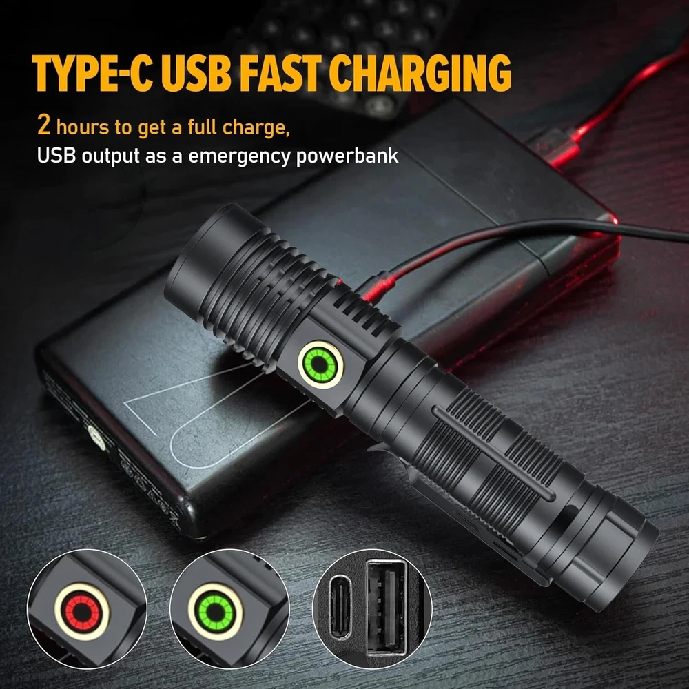 Light Source Type: Led gtin13: Does not apply Brightness: 20000 Lumen Water Resistance Level: Waterproof Operating Range: 1500 m UPC: Does not apply Voltage: 5 volts Battery Description: Lithium-ion Lighting Technology: LED Item Package Quantity: 2 Number of LEDs: Not Specified Operating Time: 20 hours Style: Rechargeable Led Flashlight IP Rating: IPX6 Personalize: No Number of Batteries: 2 Finish Types: High Lumen Flashlight Material: Aluminum Features: USB Rechargeable, Rechargeable, Magnetic, Zoomable, Waterproof, Handheld, With Holster Power Source: Battery Mounting Type: Usb Rechargeable Batteries Included?: Yes Batteries Required?: Yes Finish Type: High Lumen Flashlight White Brightness: 20000 Lumens Product Dimensions: 4.7"d X 1"w X 1"h Number of Lights: 1 Battery Cell Composition: Lithium Lumens: 20000 Item Weight: 320 grams Runtime: 20 Hours Batteries: 2 Lithium Polymer Batteries Required. (included) Color: Black Light Path Distance: 1500 Meters Type: Flashlight Battery Technology: Lithium Brand: Unbranded