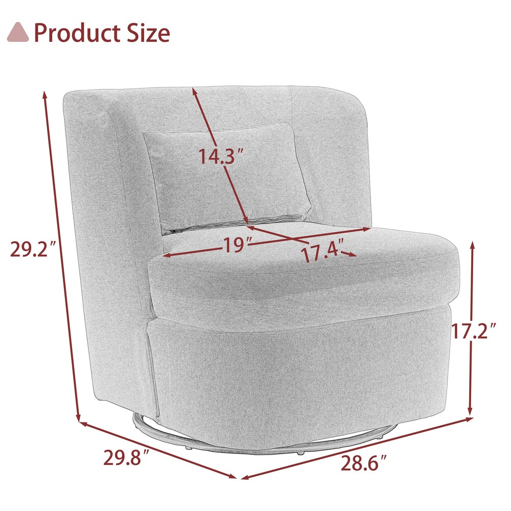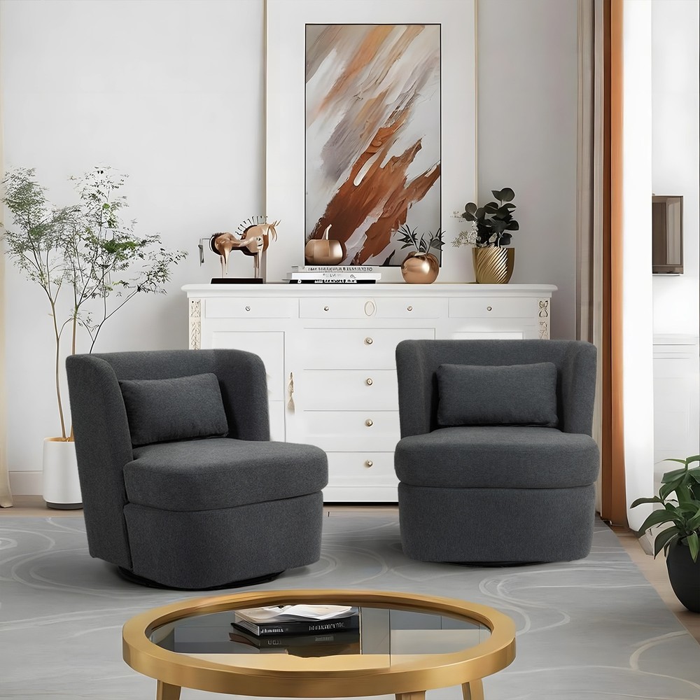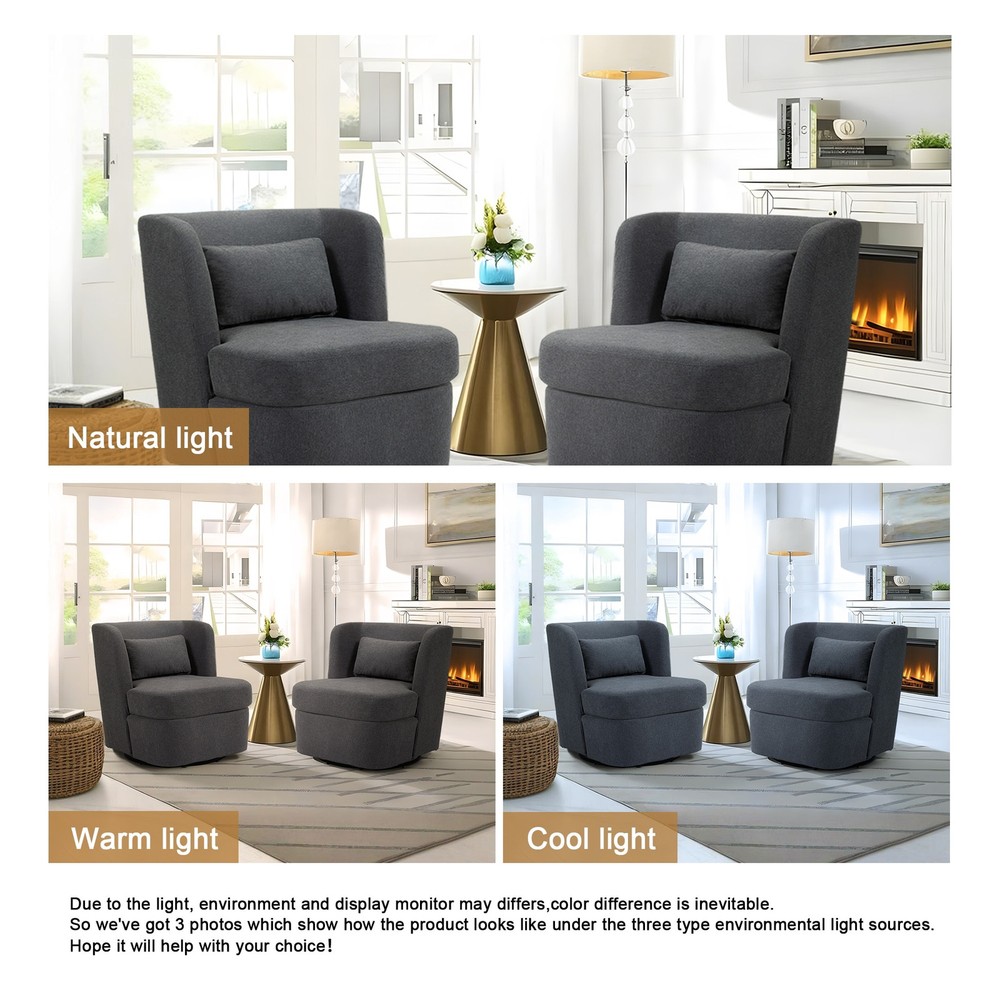 Designed for your leisure comfort, the circular modern armchair can swivel 360 degrees, making the seat more flexible and allowing you to easily adjust your sitting position without getting up. The swivel accent chair is made of comfortable and breathable fabric, with high density foam cushion provides excellent support and durability, which is soft and comfortable. This chair is best for sitting cross-legged while reading a book or curling up to watch TV. The included pillow provides extra support.Product informations: Color: 5 Colors(Gray,Beige,Boucle White,Boucle Gray,Boucle Blue) Products included: 2 Swivel Barrel Chairs Upholstery Material: Cotton and Linen, Boucle Leg Material: 360°Swivel Base Product Dimension: 28.6"W×29.8"D×29.2"H Product Weight: 54.01 lbs Packing Size: Free Shipping Over $49.99* Details 2Set 360°Swivel Barrel Chair with Cushion Product Description: Designed for your leisure comfort, the circular modern armchair can swivel 360 degrees, making the seat more flexible and allowing you to easily adjust your sitting position without getting up. The swivel accent chair is made of comfortable and breathable fabric, with high density foam cushion provides excellent support and durability, which is soft and comfortable. This chair is best for sitting cross-legged while reading a book or curling up to watch TV. The included pillow provides extra support. Product informations: Color5 Colors(Gray,Beige,Boucle White,Boucle Gray,Boucle Blue) Products included2 Swivel Barrel Chairs Upholstery MaterialCotton and Linen, Boucle Leg Material360°Swivel Base Product Dimension28.6"W×29.8"D×29.2"H Product Weight54.01 lbs Packing Size28.35"W×26.77"D×22.05"H Package Weight61.62 lbs Weight capacity:220 lbs Features: This modern chair can be rotated 360°, and has great flexibility in the house. The seat cushion of the chair is filled with a distinctive sponge, which is not only beautiful in appearance, but also more comfortable to ride. The fabric of the chair adopts the rare boucle fabric on the market, which is skin-friendly and soft. And there is also cotton linen fabric that is very durable. The accent chair is a unique decor for various occasions which can lift up the aesthetic of the interior design. Also it is a perfect addition to the hotel lounge, bedroom, living room, office, and nursery room.