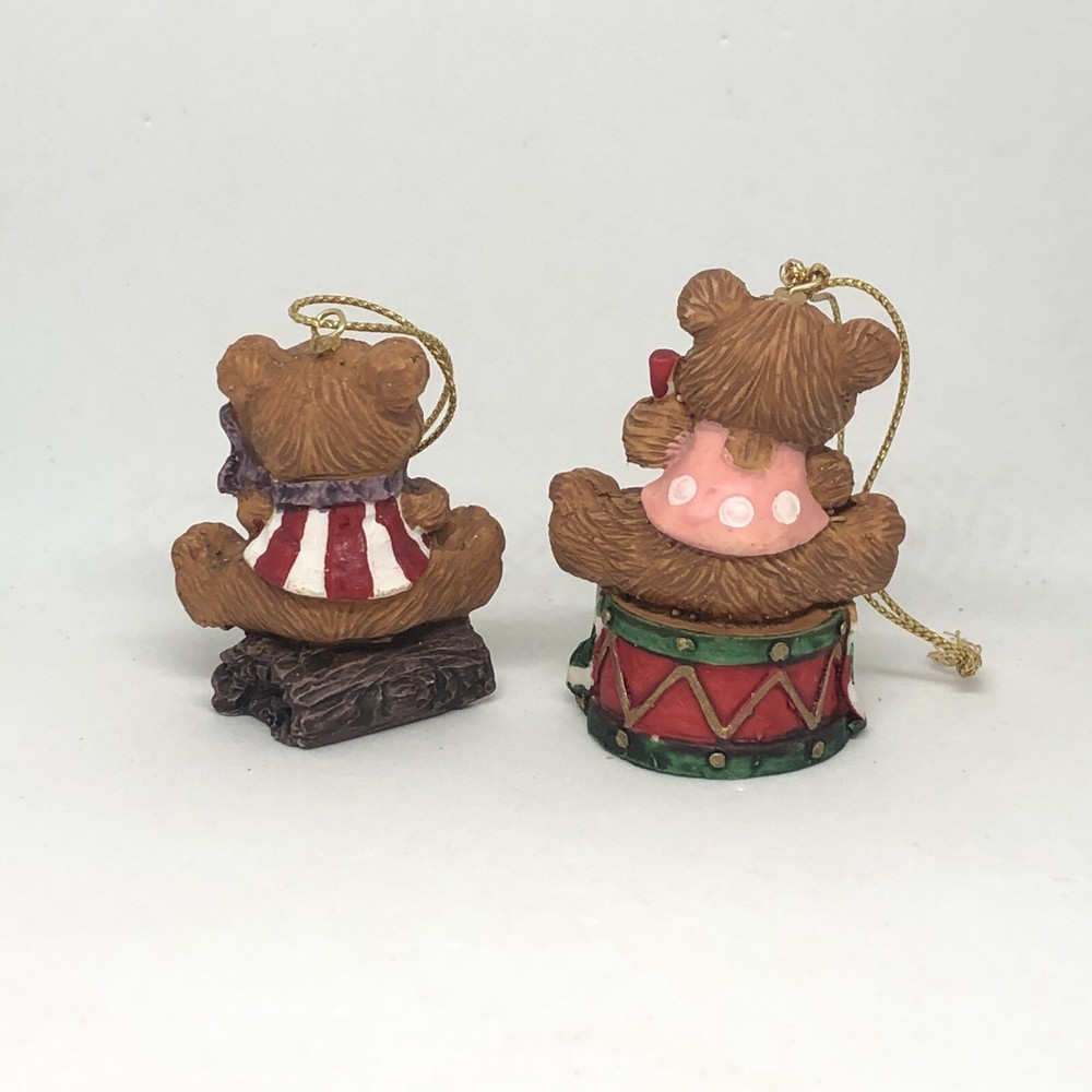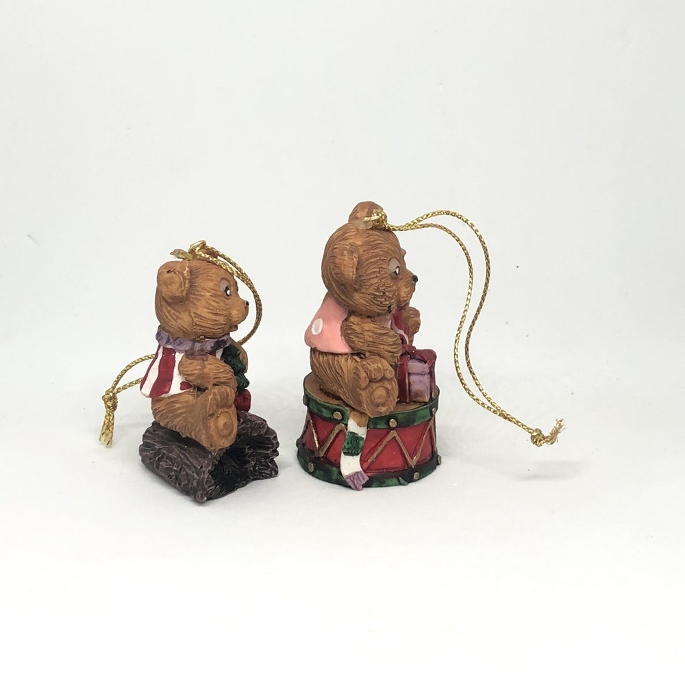 2-Piece Bear Christmas Ornament Set Sitting on Drum & Log with Tree 2" Resin Decor