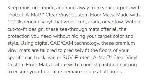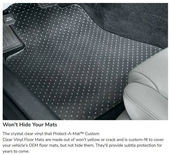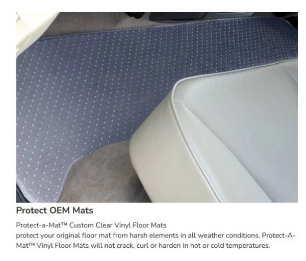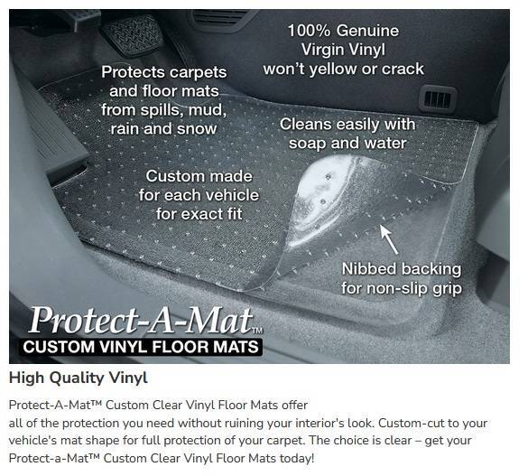 All Season - Great in Winter, Spring, Summer AND Fall Protect-o-Mats Custom Cut Floor Mats Designed to go ON TOP Of and protect your carpet mats ! NOTE: SAMPLE PHOTOS ONLY! Custom Cut for YOUR Vehicle The patterns are created to cover the original OEM floor mats for a vehicle. If your vehicle has had the floor mats replaced in the past, it may not line up exactly. There may be parts of the floor mats not covered if is creates a safety risk to add the thickness of these on top of the mat (such as behind a gas or brake pedal.) Protects the original floor mat from harsh elements in all weather conditions Protect-A-Mat will not crack, curl or harden in hot or cold temperatures Ultra premium vinyl construction, five 1/4 inch high nibs per square inch to prevent sliding Easy to clean, simply wipe off with damp towel Available in over 10,000 custom fit patterns Manufactured in the USA Over 10,000 custom fit patterns, including: full front overalls, rear overalls, cargo / trunk mats for all SUV’s, minivans, cars and trucks All patterns are computer precision cut Made With Pride in the USA Autonotions takes customer care and satisfaction Very Seriously. Making a sale is the easiest part of any transaction. The important thing is to make sure you are pleased with the purchase after the sale. I hope you will take a moment to review my Ebay Feedback and buy with confidence! Thank you for looking at my auction! Additional shipping charges for Hawaii, Puerto Rice, and Alaska. ABOUT AUTONOTIONS: See MORE Great Items we offer in our ebay store: Autonotions We take customer care and satisfaction Very Seriously. Making a sale is the easiest part of any transaction. The important thing is to make sure you are pleased with the purchase after the sale. I hope you will take a moment to review our Ebay Feedback and buy with confidence! Thank you for looking at our ebay item! We are a full line Auto Accessory Store. With over 100 suppliers, we can help you with all of your Accessory Needs. We carry brands like Wheelskins - Lebra - Putco - Bestop - Husky Liners - - Dee Zee - Westin - Bushwacker - Go Rhino - CoverCraft - CarCapsule - Napier Sportz - Intro-Tech - Lloyd - DashCare and many more. To learn more about us, be sure to visit us often. Check out our ebay store: Autonotions . Call us at [phone removed by eBay] HuskyLiners Husky Liners Lund International Rugged Ridge Rubbertite Lloyd Mats Thank you for checking out our Ebay item!