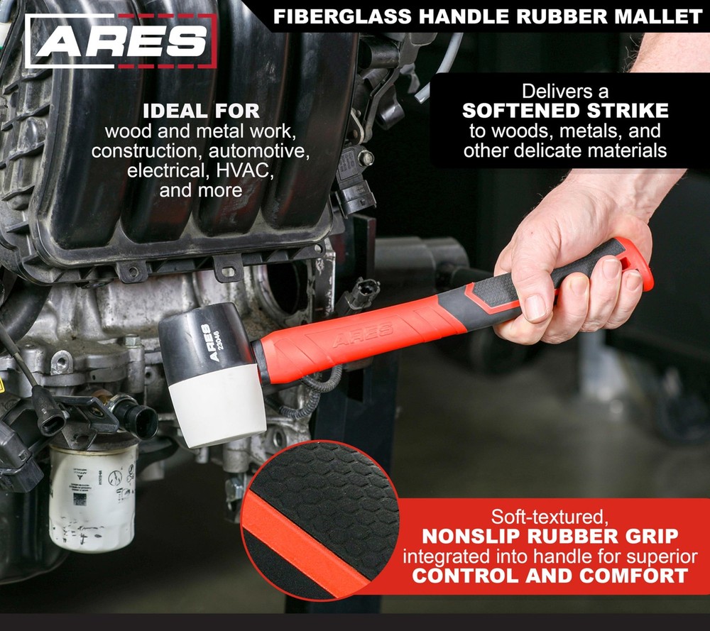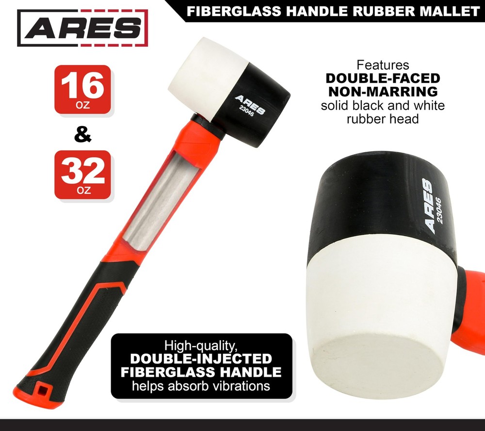 Softened Strikes for Delicate Materials The Fiberglass Handle Double Faced Mallet Set includes two black and white rubber headed mallets with 16-ounce and 32-ounce double faced heads, each non-marring and with an ergonomic fiberglass handle. The non-marring rubber heads of these mallets deliver softened strikes to surfaces, such as woods, metals, and other delicate surfaces, without inflicting damage. The high-quality, double-injected fiberglass handles help absorb vibrations, and the soft-textured, nonslip rubber grips integrated into the handles provide superior control and comfort. With a variety of head weights suitable for work of any size, this mallet set is ideal for woodworking and metalworking, construction and automotive projects, electrical and HVAC applications, and more. Features: Includes: 2 pc. Fiberglass handle double-faced black and white rubber head mallets Mallets features double-faced non-marring head Mallet head weights: 16-ounce and 32-ounce Deliver softened strikes to woods, metals, and other delicate materials High-quality, double-injected fiberglass handles help absorb vibrations Soft-textured, nonslip rubber grips integrated into handles for superior control and comfort Ideal for wood working, metal working, construction, automotive, electrical, HVAC applications, and more SPECIFICATIONS: This double-faced mallet set offers two double faced mallets that each feature an ergonomic fiberglass handle, delivering softened strikes for delicate materials. This mallet set includes two black and white rubber headed mallets with 16-ounce and 32-ounce double faced heads. DESIGN: With their textured, non-slip rubber grips, these mallets offer superior control and comfort in the hand. Their high-quality double injection fiberglass handles absorb vibrations, reducing fatigue and improving striking accuracy even during prolonged use. Each head offers non-marring striking function, allowing for work that doesn’t leave a mark. APPLICATION: The non-marring rubber heads of these mallets deliver softened strikes to surfaces without damaging them, making them perfect tools for driving and striking on delicate materials from woods to metals and more. With a range of mallet head weights, this set is ideal for work of any size in woodworking and metalworking, construction and automotive projects, electrical and HVAC applications, and more. RELIABLE | EFFECTIVE | EFFICIENT: Users trust to be quality tools that make an impact. You are backed by our Performance Assurance Limited Lifetime Warranty. If you have any issues with your Fiberglass Handle Double Faced Mallet Set, simply contact customer service for troubleshooting help, parts, replacement, or refund. ASPCA BUSINESS AMBASSADOR: We are proud to be part of the ASPCA Business Ambassador Program. If you have a pet, you realize they are more than a pet, they are part of the family. With your support, we’re proud to help this great organization.