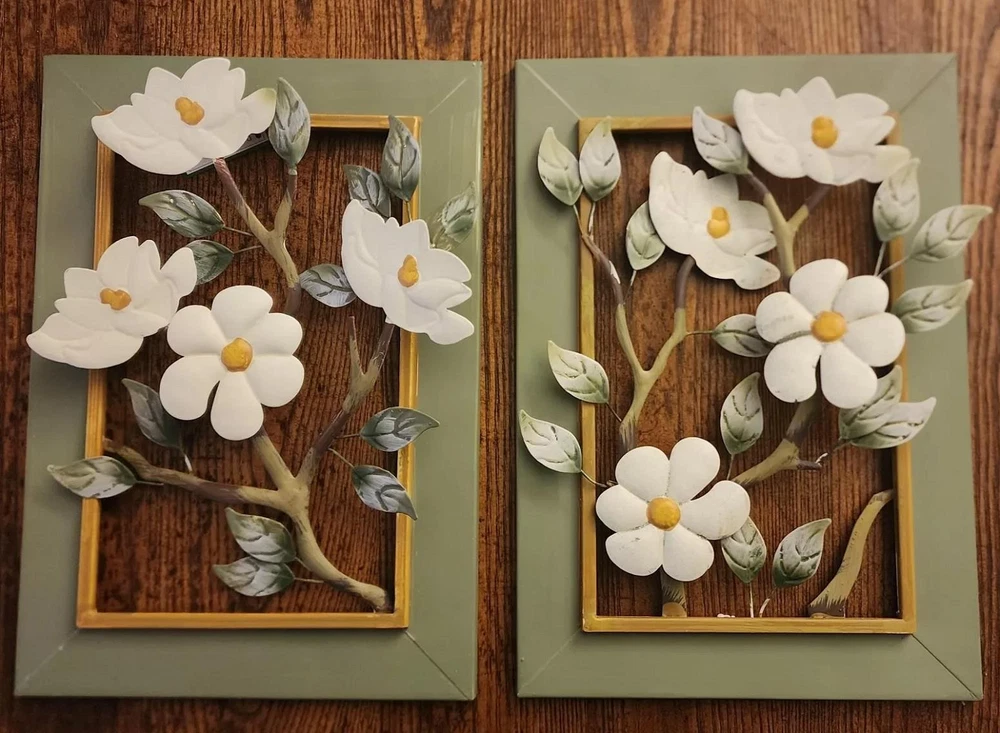 2-Piece Framed Metal Wall Art Blooming White Magnolias 3D Sculpture 9x13 Inches