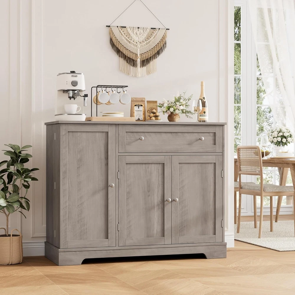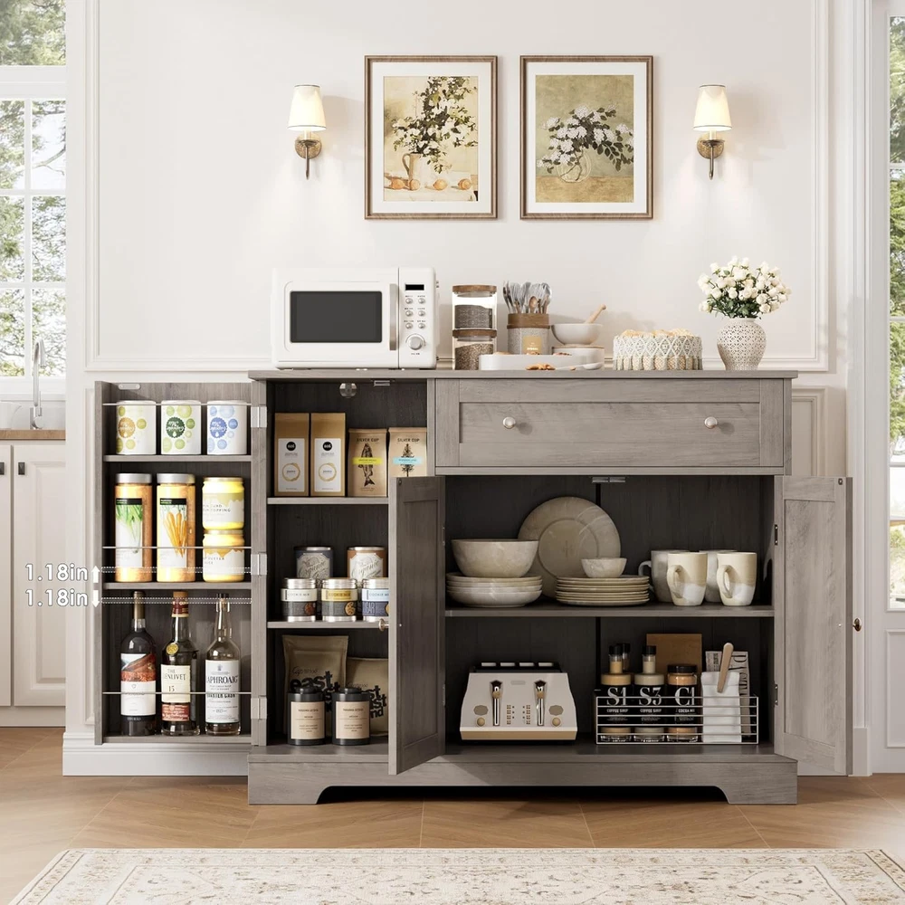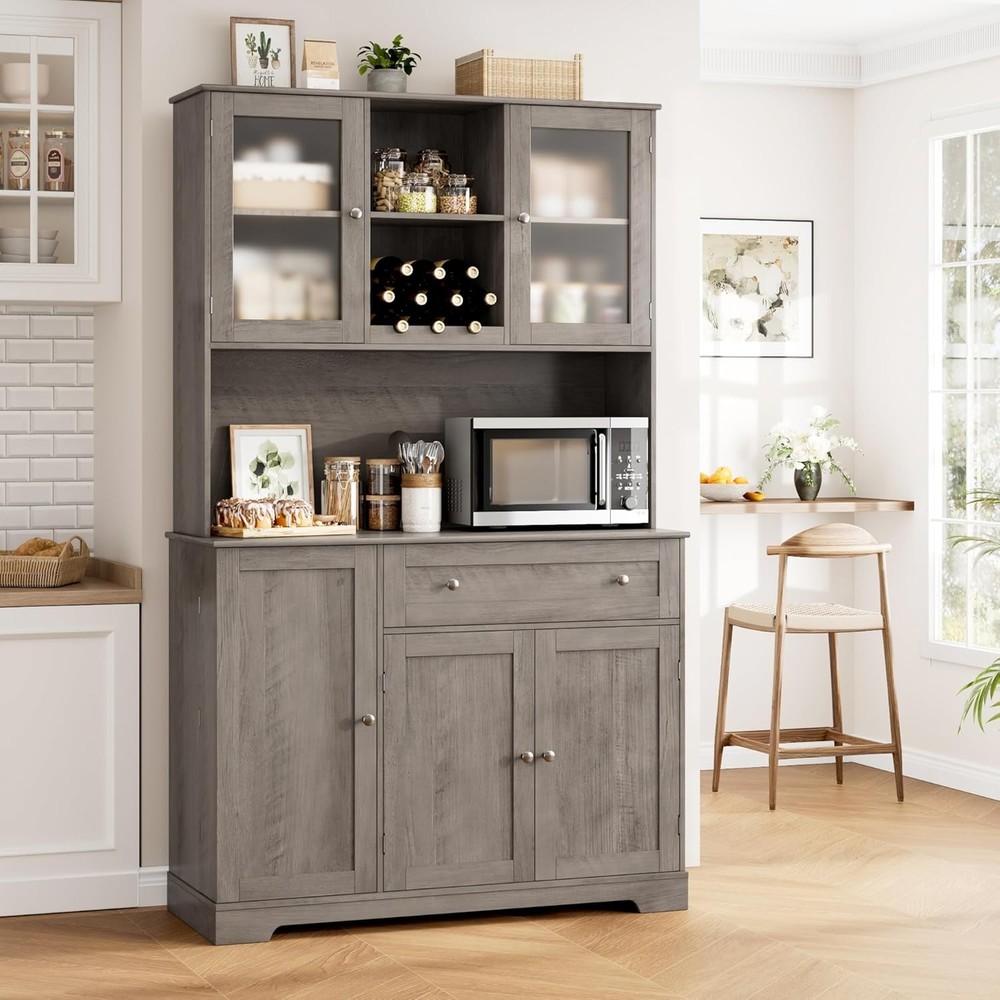 Product Description About this item 2 Pieces Pantry Set: - This elegant 2-piece kitchen set includes one pantry and buffet cabinet, which features large storage capacity designed into multiple open and hidden areas that can perfectly solves the messy storage dilemma in your kitchen All in One Storage Option: Spacious countertop can accommodate effortlessly microwave and coffee maker, while five doors cabinets, one drawer and one built-in wine rack make dust-free yet classified storage from tableware, snacks to kitchen appliances possible Multi Scene: Except being used as food pantry cabinet in kitchen, this hutch cabinet also works well as coffee bar, buffet cabinet in dining room or as bar cabinet in living room - It's the perfect pick that any family will love to fill their home Modern Minimalist: Featuring simple white finish and clean smooth lines, this buffet cabinet with hutch creates a touch of elegant and charming modern vibe, making itself an easy complement to any home style and show your extraordinary taste Crafted To Last: Waterproof painted body togehter with reinforced structure built from high quality engineered wood ensures the kitchen cabinet with superior stablility and durability for long term use and easy maintenance, the tabletop can hold up to 300 lbs Easy Assembly: Hassle-Free Assembly is allowed with straightforward instructions and labled pieces, normally you can finish the kitchen storage cabinet within 3 hours.