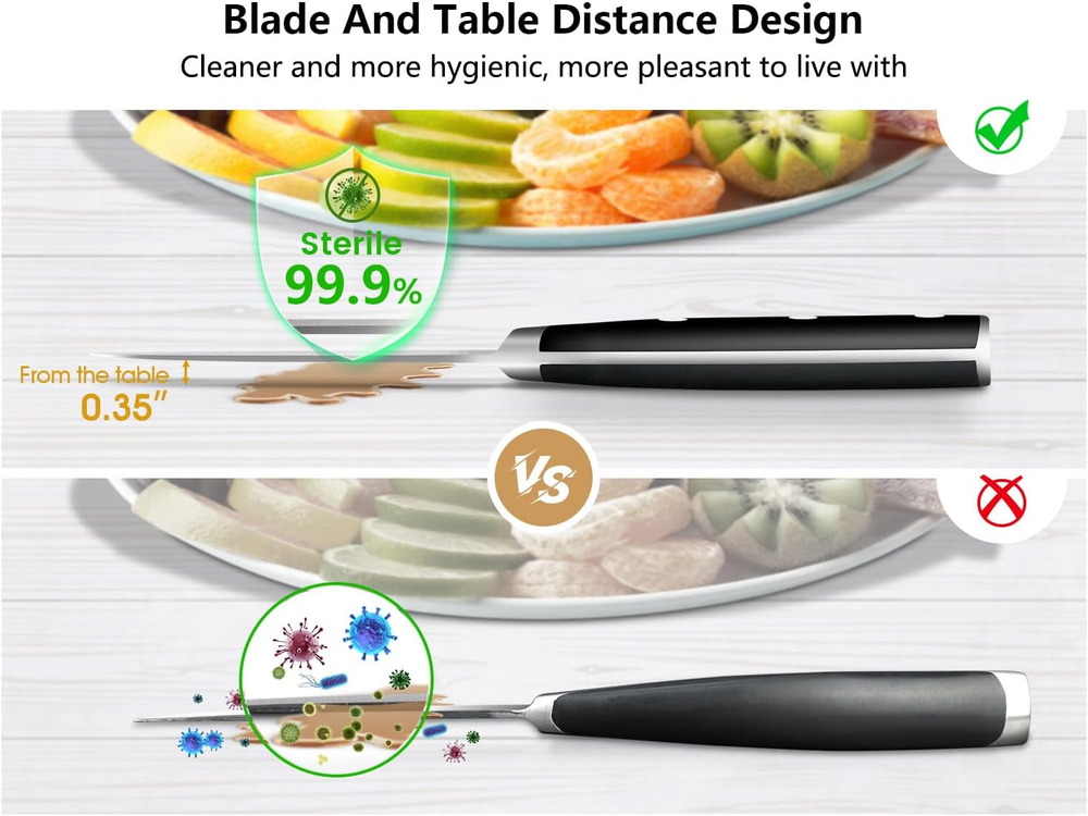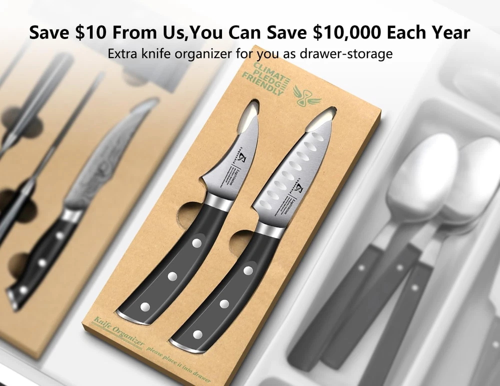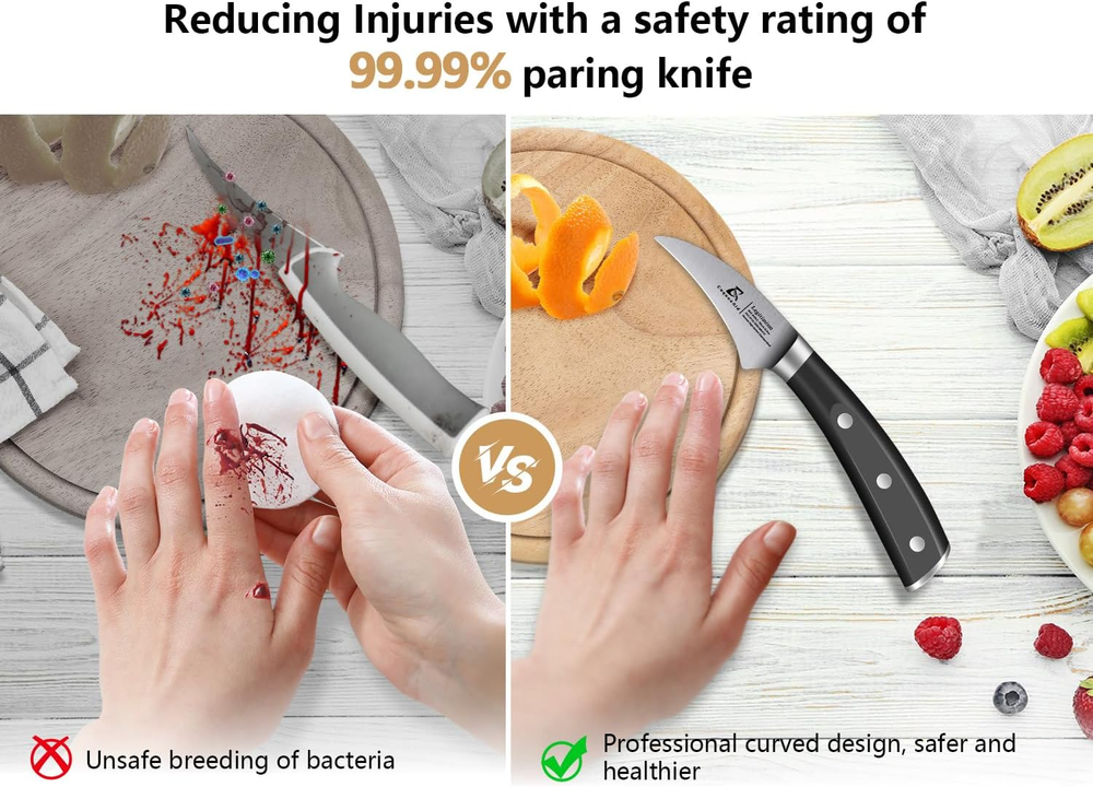 Multi-functional Paring Knife Set:3.8"Paring Knife and 2.75"Bird Beak Paring Knife combination is the best combination for peeling and slicing.For ingredients such as fruit,meat and vegetables in the kitchen, it can perfectly perform paring,chopping, slicing, dicing, shredding and more Paring Knives set:The Fruit & Vegetable Paring Knife Set are made of high-carbon stainless steel and has been finely polished to become very sharp,Easily handles the cutting needs of fruits and vegetables in the kitchen. And you can put the knives in a box and then directly into a drawer to save even more space Anti-slid ergongmic handle and blade:An ergonomically non-slip paring knife set handle can provide a safe grip while cutting. Balanced weight distribution and ergonomic handles minimize fatigue and maximize cutting precision Release function fruit pulp:Double Rock-hollow Dimples Ensure Food Falls Off The Blade More Easily,Solve the problem of food adhering to the blade and needing to be placed by hand,More convenient and hygienic Additional Features:This set of knives can easily chop and slice fruits for better nutrient absorption in juices, as well as create exquisite fruit platters, making eating fruit a pleasurable experience. Additionally, it can be used to carve fruits as a garnish for summer drinks, adding fun and joy to your daily life Product Description 1 Making Salad 2 Ornamental 3 Making Juice 4 Making fruit snacks 5 Convenient storage The video showcases the product in use. The video guides you through product setup. The video compares multiple products. The video shows the product being unpacked. Anti-fatigue Ergonomic design Blade curves inward for more effortless use Concave point design releases food easily Full-tang balance handle, ergonomically designed, Safe and comfortable to use, more durable The Perfect Combination Of High-Quality Materials And Advanced Technology 2PCS Fruit & Vegetable Paring Knife set