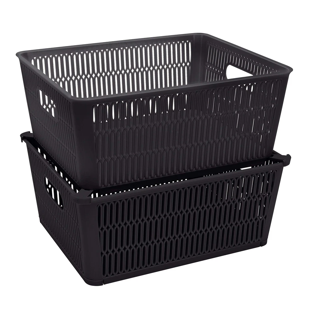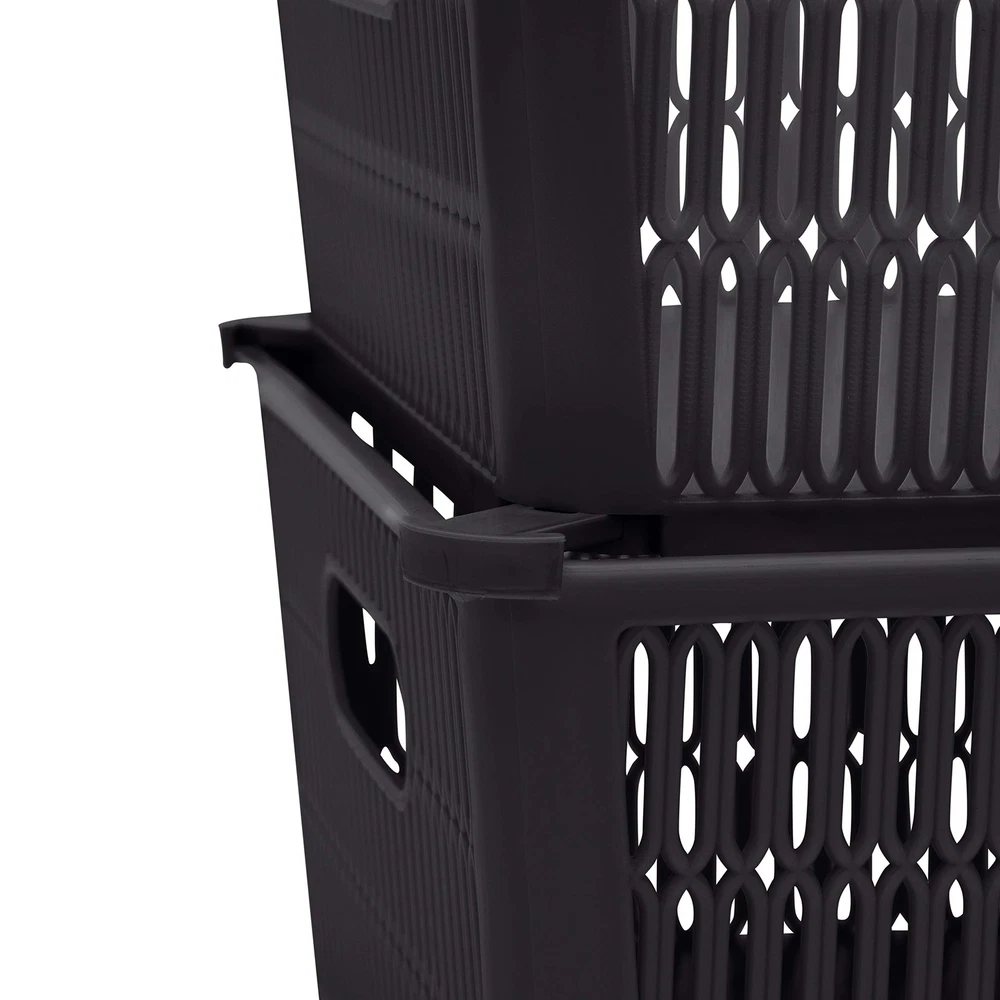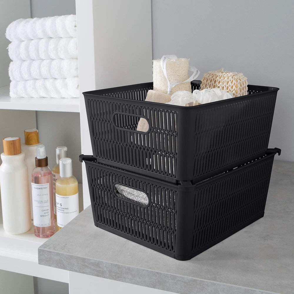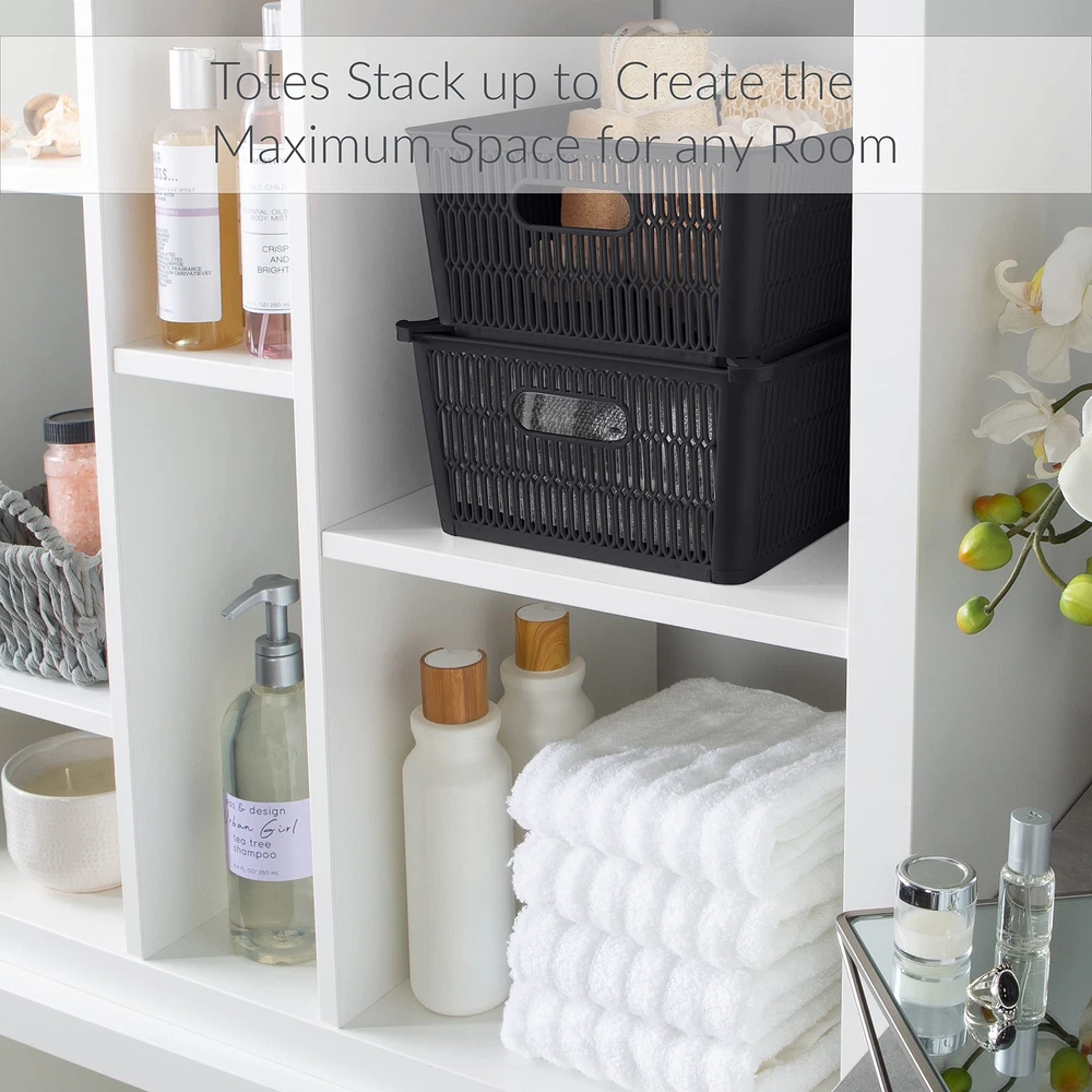 Maximize your storage space with the Slide 2 Stack It Storage Tote Baskets. Created with a patented slide to stack design which provides slide out corner support that allow the totes to be safely stackable. Storage totes hold up to 40lbs while stacked, allowing you to maximize your storage in closets, cabinets, shelves and more. The totes neatly nest inside when not in use. Organizing just became easier with the slide 2 stack it totes! Dimensions: 11"x 9"x 4.75" Patented Slide 2 Stack Design: The corners of each storage tote are designed with slide out support to allow totes to be stackable. This helps to maximize your storage space. Nestable: The totes nest easily inside each other when not in use for easy storage and will take up less space. Holds 40lbs: These baskets are strong and durable enough to hold up to 40 pounds when stacked. Multipurpose: These totes are perfect for your bathroom, kitchen, bedroom, and more. You can easily towels, soaps, lotions in it. Or you can use them to organize your craft room.