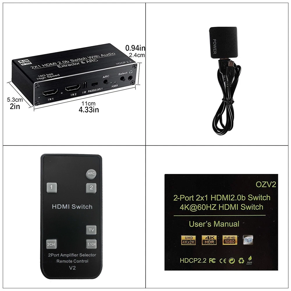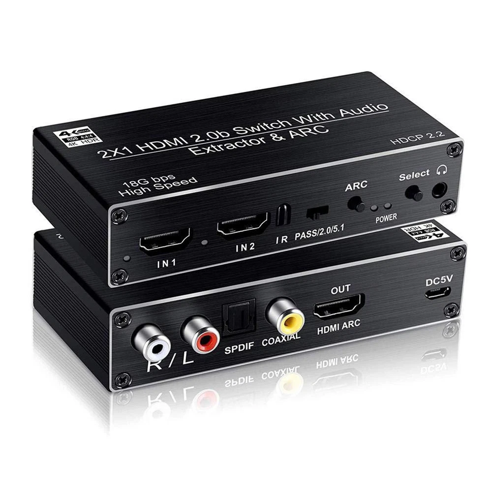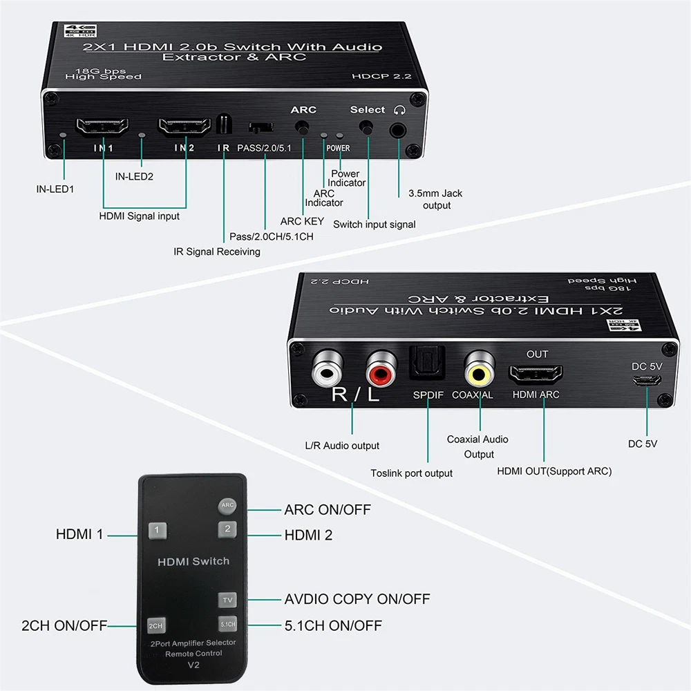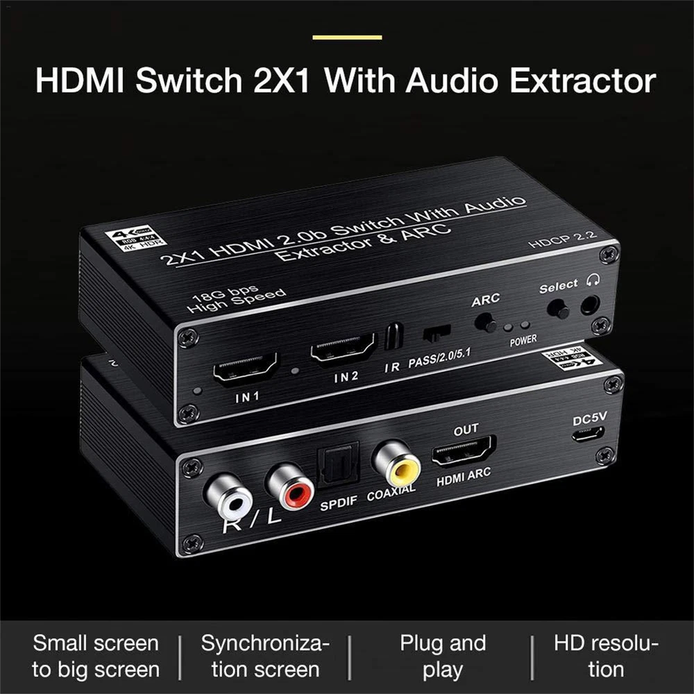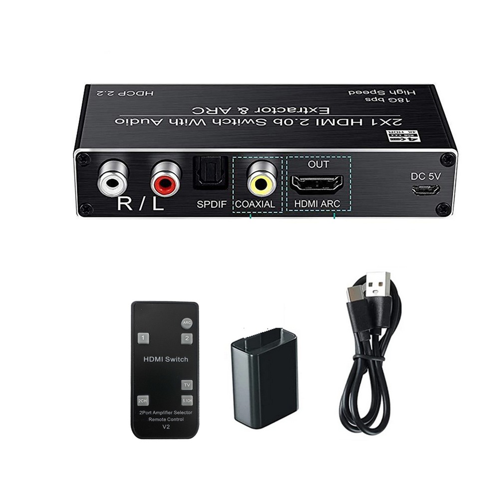2x1 HDMI Switch Audio Extractor With R/L+Toslink SPDIF+COAXIAL Audio Out Adapter 4K 2 In 1 Out HDMI ARC Audio Switcher Selector Specifications: Compatible with HDMI2.0 and high-definition TV with HDCP2.2 Supports high-resolution input of 480P, 720P, 1080P, 1080P 3D, 4K60Hz Support compressed audio: DTS Digital, Dolby Digital (DTS-HD and DOLBY) with Audio Separation and Audio Return Function (ARC) Supports HDMI2.0 (4; 4; 4 RGB) Supports MHL function and has LED indication function Supports automatic identification of signal sources, and automatically jumps to the next port with a signal source when the signal source is disconnected, Automatically jump to newly inserted HDMI signal source Supports high-definition signal with remote control Supports video transmission with broadband of 3Gbps/300MHz Power supply: 5V1A(Included 5V1A power adapter) Feature: 1. 4K@60HZ 2X1 HDMI SWITCH with AUDIO EXTRACTOR: This 4K HDMI Switch allows you connect Two HDMI 2.0 Sources to one display device, Each input source support audio extract by the Toslink+L/R+Coaxial audio output channel. No loss of quality after you split the signal. No degradation in audio quality. (HDMI output support CEC) 2. ULTRA HD 4K VISUAL ENJOYMENT: Supports HDCP 2.2, HDMI2.0b, 4K@60HZ, RGB4:4:4, Full HD, UHD, HDTV, Deep Color to 36bit,also back compatible with 4K@30HZ and 1080P. Max Bandwidth of 18.2Gbps.(Kindly Note: It is not compatible with DVI) 3. HDMI ADUIO EXTRACTOR: With Optical Tolink SPDIF+L/R+3.5mm Jack+Coaxial audio out allows you extract the audio from the HDMI input source ( Like For PS4, Cable box, For Xbox or any HDMI device)connection to a spearker, Amplifier etc. Note: If you choose optical or coaxial audio out, you can enjoy 5.1CH or 2CH or audio copy. If you choose 3.5mm or L/R audio out, you can enjoy 2CH or audio copy. 4. HDMI ARC ADAPTER: Supports ARC (Audio Return Channel), Extractor the Audio from TV to Soundbar or Amplifier. Connect your TV HDMI(ARC) Port to this switch HDMI Output Port with HDMI Cable, then using optical or Coaxial cable to the soundbar, Speaker, home theater, A/V receivers etc.No distortion of audio or video(Note:3.5mm jack and L/R audio port not support ARC audio) 5. Smart Auto-Switch with Remote Control: It will automatically skip to the most recently inserted HDMI signal source,it will automatic change from HDMI source A to HDMI source B when you turned on source B and back to source A when you turned source B off Product List: 1x HDMI switcher 1x IR remote control(Included 1*CR2025 battery) 1x USB power cable 1x 5V Power adapter 1x User manual