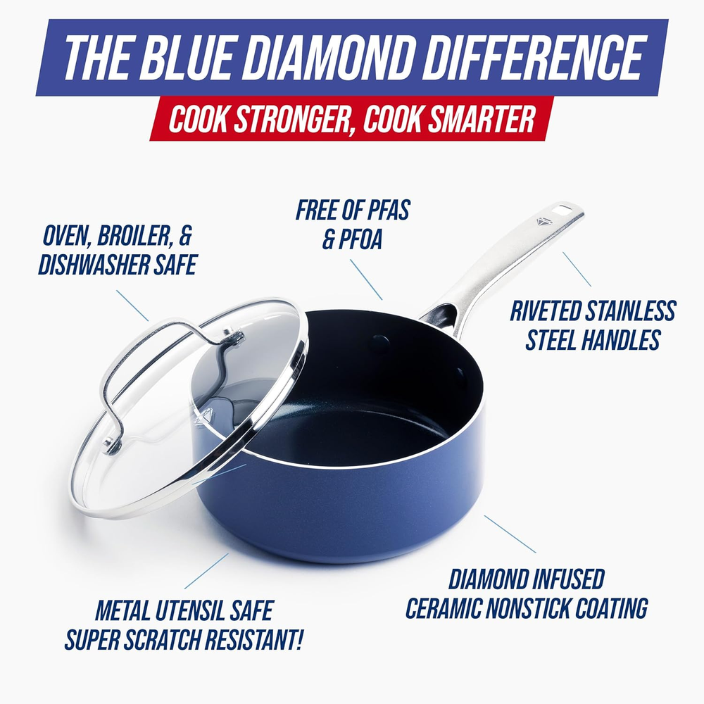 Store New Arrivals Add to Favorite View Feedback Contact 2 Quart Saucepan with Lid, Non-Toxic PFAS & PTFE Free Diamond Ceramic Nonstick Description Item model number CC003344-001 Product Dimensions 3.9"D x 12.32"W x 21.93"H Capacity 2 Quarts Color Blue Material Stainless Steel, Ceramic Item Weight 2.09 pounds Is Oven Safe Yes Manufacturer Cookware Finish Type Non-Stick Is Suitable For Stovetop Yes Coating Description Ceramic Size 2 Quart Saucepan DURABLE NONSTICK SURFACE: Diamond-infused ceramic coating is 5x harder and 10x longer lasting than traditional nonsticks METAL UTENSIL SAFE: Resilient surface allows use of metal utensils without damage SUPERIOR HEAT CONDUCTION: Diamond-infused coating heats 4x faster than copper for quicker cooking and easier cleaning TOXIN-FREE COOKING: Free of PFAS, PFOA, lead, and cadmium for healthier meals WARP CONTROL BASE: Heavy-duty forged base prevents warping, wobbling, or degrading over time VERSATILE USE: Oven and broiler safe up to 600°F for flexible cooking options EASY CLEANUP: Dishwasher safe for convenient maintenance LONG-LASTING PERFORMANCE: Designed for durability and consistent cooking results A kitchen icon that delivers effortless nonstick performance again and again—the Blue Diamond saucepan makes any meal easier. This pan features Blue Diamond’s signature diamond-infused coating, which is 5x harder and 10x longer lasting than traditional nonstick and metal utensil safe. Diamonds are 4x more heat conductive than copper, so Blue Diamond heats up faster and cleans up easier. Each Blue Diamond pan is toxin-free and manufactured without PFAS, PFOA, lead, or cadmium. And don’t worry about warping or wobbling—Blue Diamond frying pans feature a warp control base that delivers extra strength while preventing degrading over time. The riveted stainless steel handle provides a sturdy and secure grip. Dishwasher safe. Oven and broiler safe up to 600°F. ABOUT US We offer the best prices around on high quality products. Our E-store includes media such as books, movies, music and games while offering electronics, toys, sporting apparel, clothing, tools, general home, garden items and more. SHIPPING We are always working hard to ensure your package arrives as soon as possible. Please understand that some factors like weather, high postal traffic, and the performance of shipping companies are outside of our control. We offer free shipping to the lower 48 states and ship within 2 business days of payment, usually sooner. We do not accept P.O. Boxes. Please provide a physical address. For shipping outside of the continental USA, we only use eBay's Global Shipping Program.The item is shipped to KY and then sent to the rest of the world. International customers are responsible for all duties and taxes. Continue to check out in order to calculate costs for shipping the item to your country. Messages regarding eBay's Global Shipping Program MUST be directed at eBay EXCLUSIVELY. RETURNS We offer a 30-Day Return Policy on items which you are not completely satisfied with. You have the option for a full-refund or an exchange of the item. No returns are available on items shipped outside of the USA. PAYMENT We accept PayPal. CONTACT US This page content is yet to come Please ad us to your favorite seller and visit again later Thank You CUSTOMER SATISFACTION We try our very best to make sure every customer is completely satisfied. If there's a problem, message us! We're happy to help. WE ACCEPT Copyright © 2021 AutoDS. | All Rights Reserved