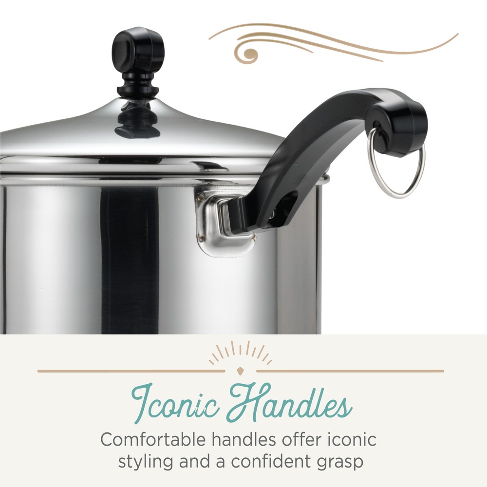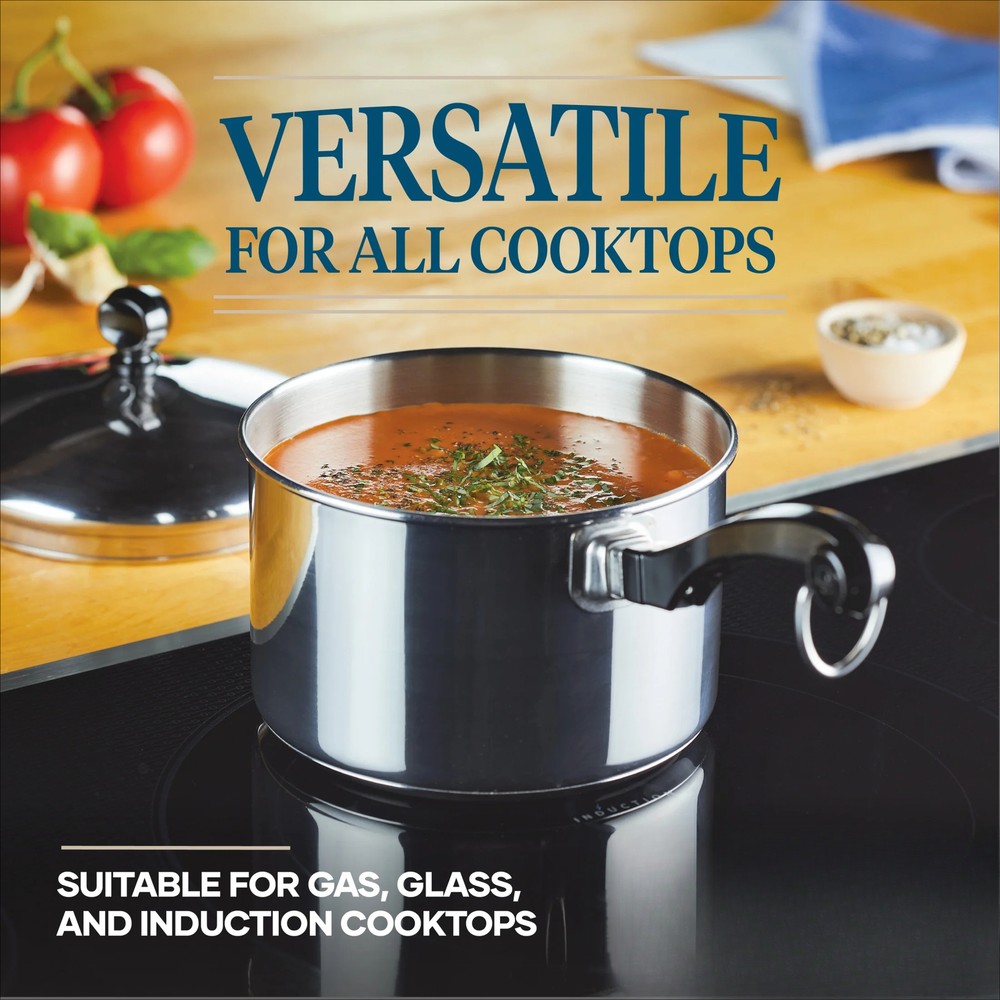 This Classic Series 2-Quart Stainless Steel Saucepan with Lid is sure to come in handy at all times of the day or night. A full cap base featuring a thick aluminum core surrounded by stainless steel provides rapid, even heating on any stovetop, including induction. The heavy-duty stainless steel is polished to a mirror finish for a classic touch, and the comfortable saucepan handle with iconic styling provides a confident grasp. This 2-quart saucepan works beautifully when reheating a serving of macaroni and cheese at lunch, cooking a side of rice during dinner, or warming chocolate sauce to top off an ice cream sundae for dessert. STAINLESS STEEL COOKWARE: The 2-quart saucepan full cap base boasts stainless steel layered over a thick aluminum core for rapid, even heating; pan exterior is mirror-finished DURABLE CONSTRUCTION, COMFORTABLE DESIGN: Comfortable handle with iconic styling provides a confident grasp; stainless steel, snug-fitting lid boasts bell shape, rolled rim and stylish knob OVEN SAFE, DISHWASHER SAFE COOKWARE: The stainless steel saucepan is oven safe to 350 degrees F and dishwasher safe for fast, easy cleanup SAUCEPAN COMPLEMENTS FRYING PANS: This saucepan coordinates perfectly with frypans, stockpots and other items from the Classic Series collection INDUCTION COMPATIBLE SAUCEPAN: The full cap base makes this saucepan an excellent conductor of even heat distribution and induction stovetop compatible